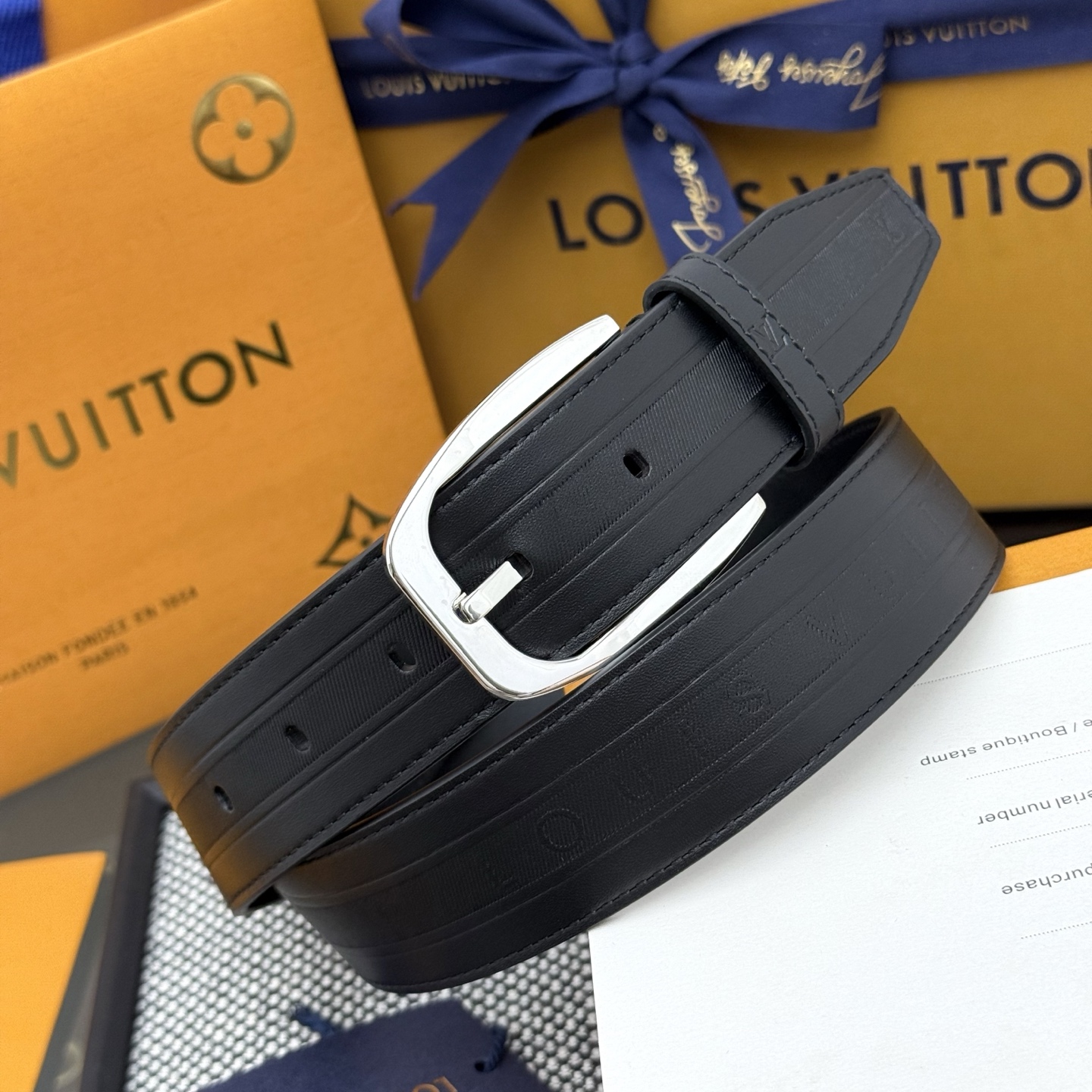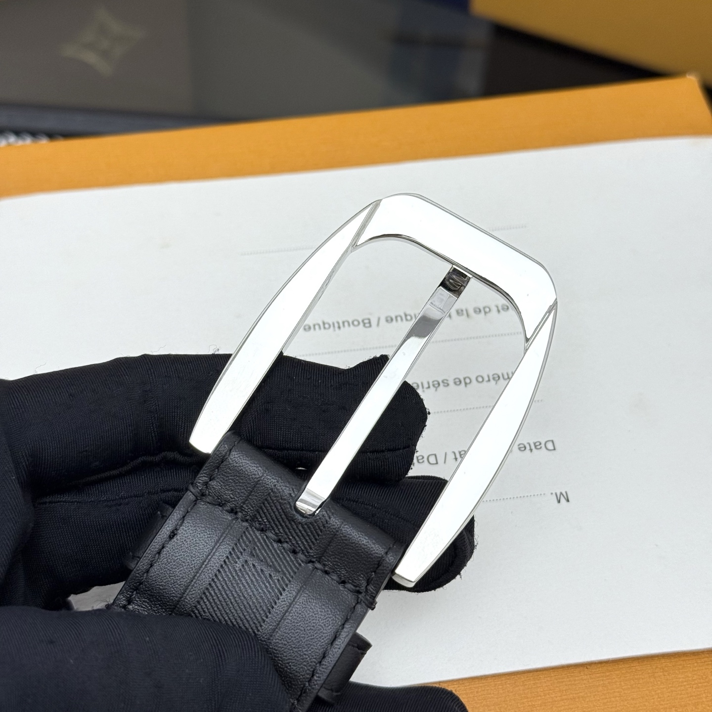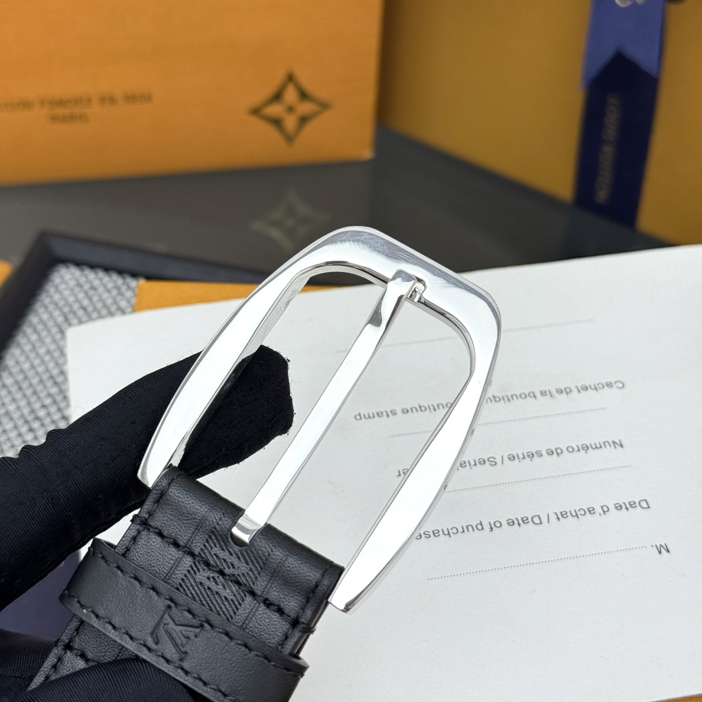 Heritage Italian original factory leather belt is made of grained and smooth leather, featuring a brushed metal curved buckle that highlights an elegant style. The LV pin adorns the end, making it suitable for formal attire. Width: 3.5cm