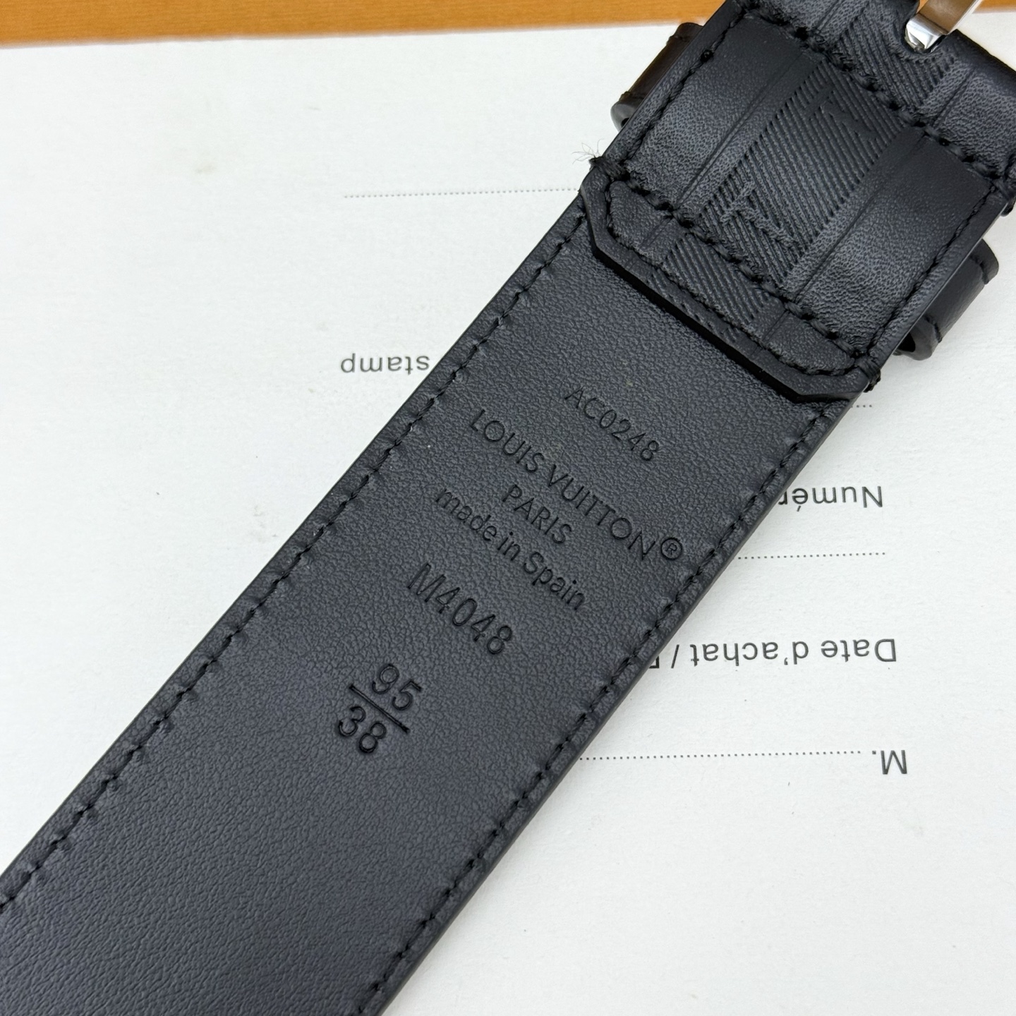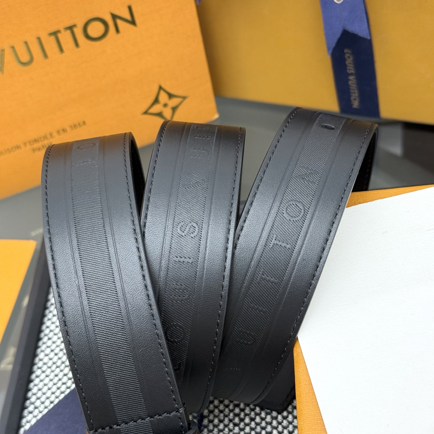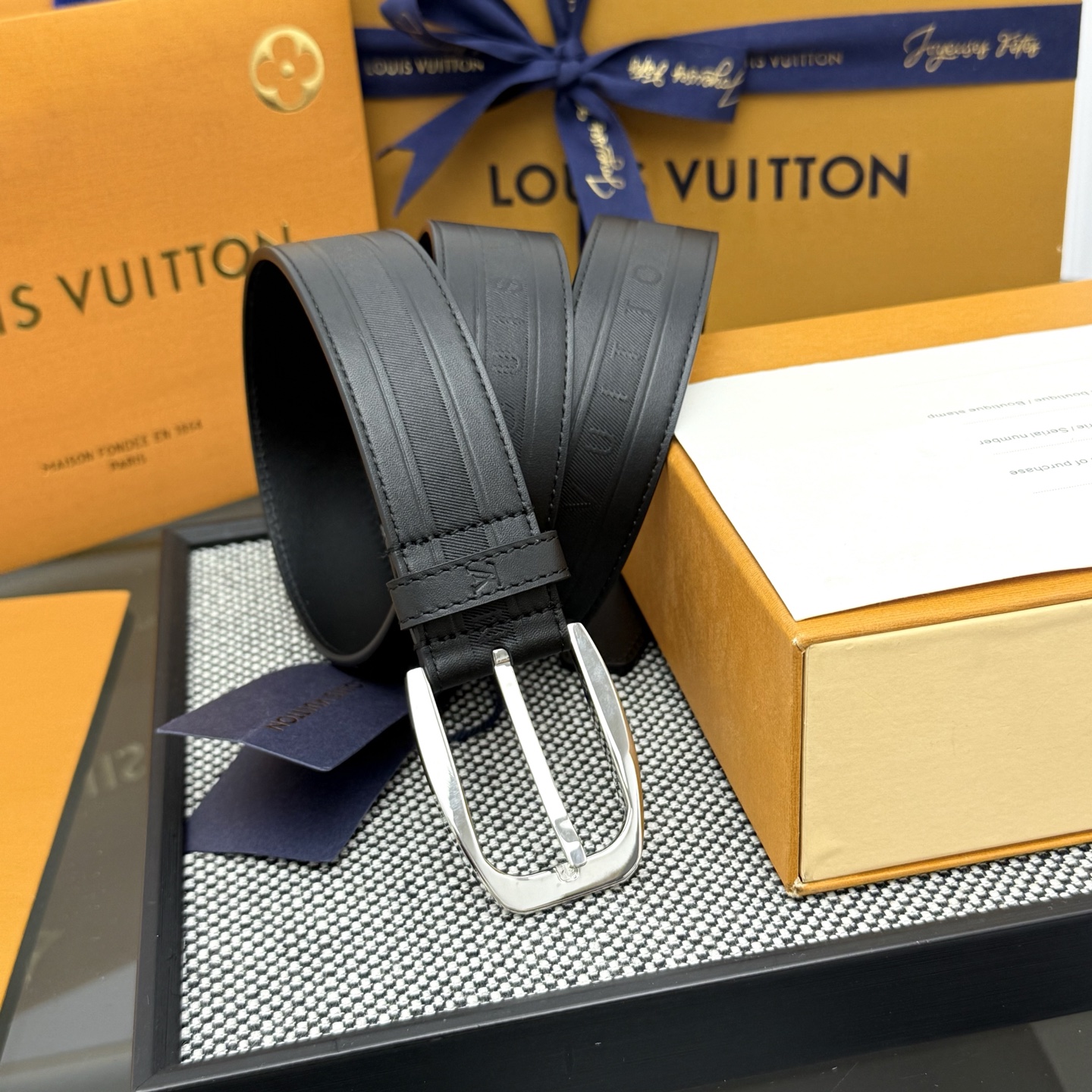 Heritage Italian original factory leather belt is made of grained and smooth leather, featuring a brushed metal curved buckle that highlights an elegant style. The LV pin adorns the end, making it suitable for formal attire. Width: 3.5cm