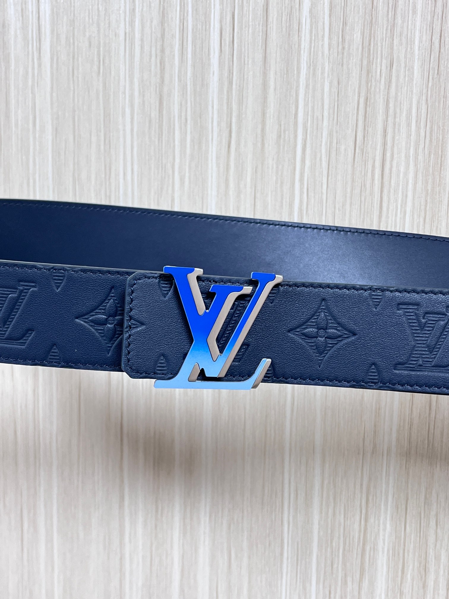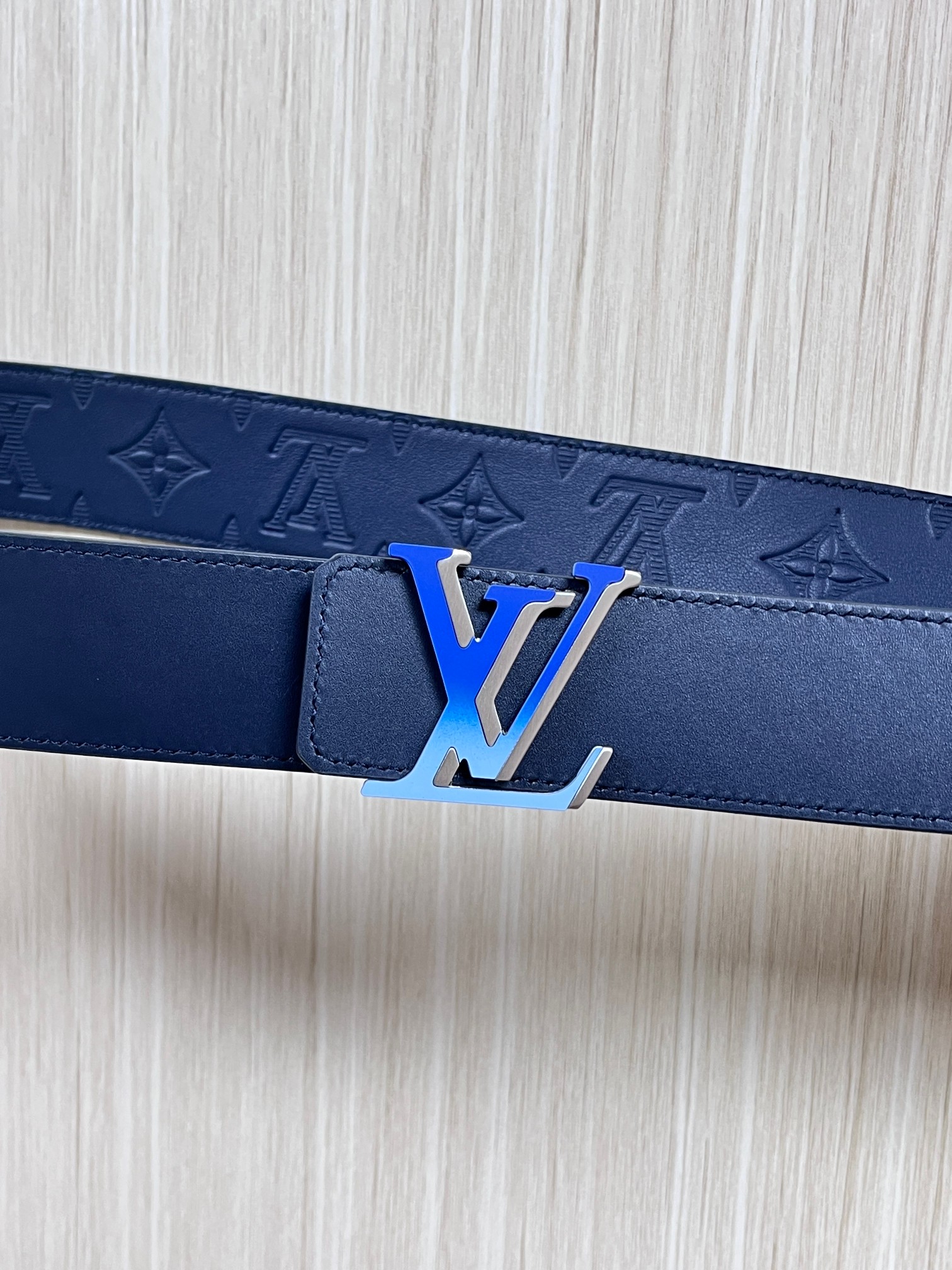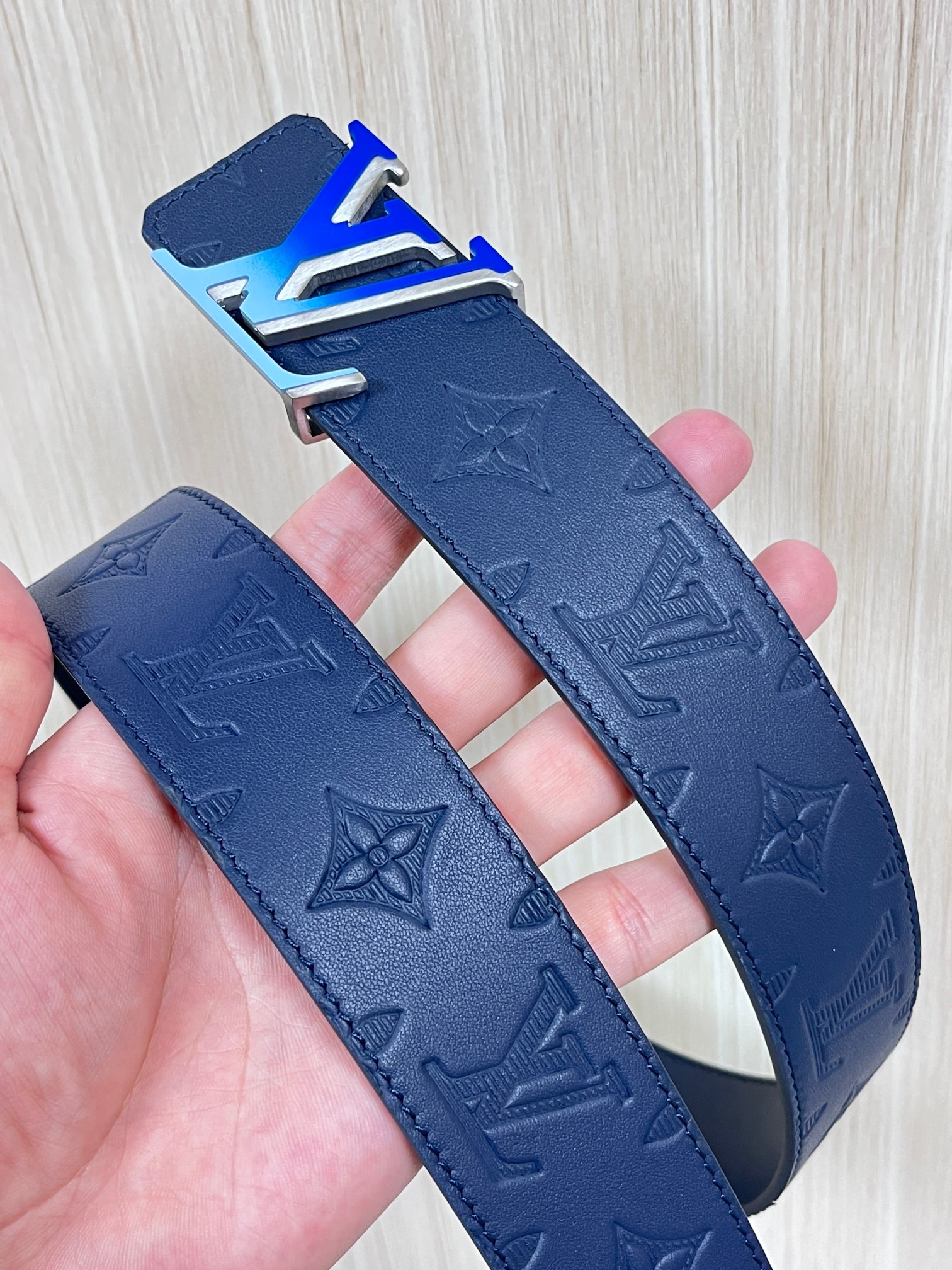4.0 width new season style, double-sided imported calfskin print, paired with premium gradient blue buckle official website head. Drip glue blue, gradient blue buckle