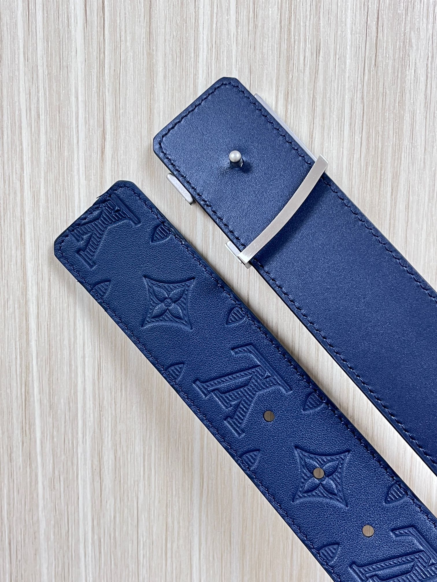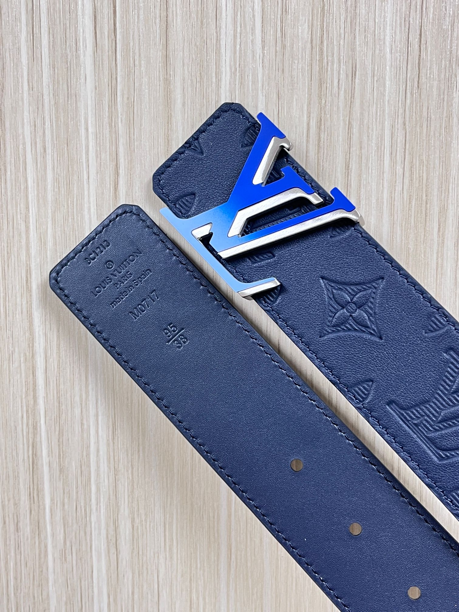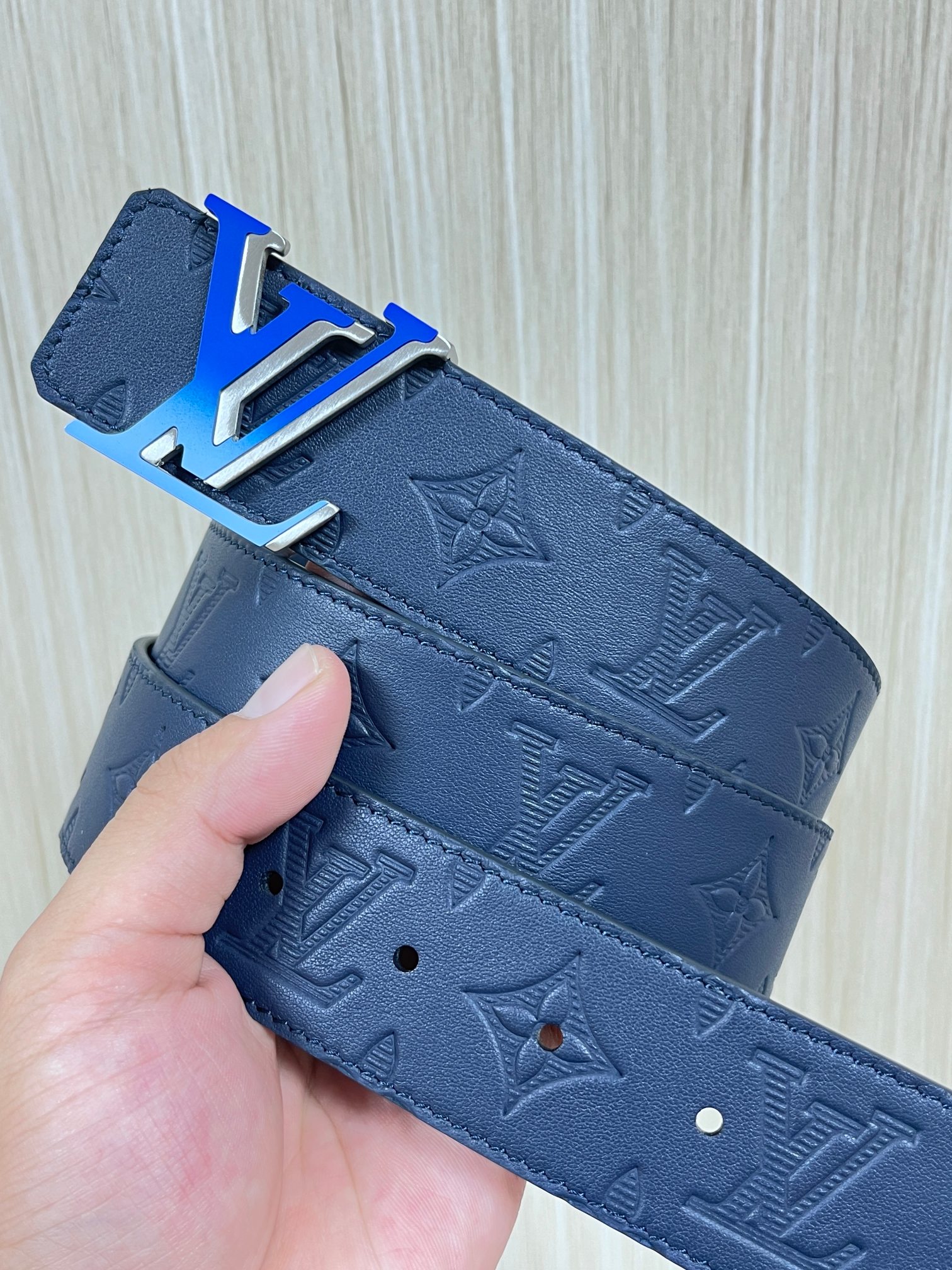 4.0 width new season style, double-sided imported calfskin print, paired with premium gradient blue buckle official website head. Drip glue blue, gradient blue buckle