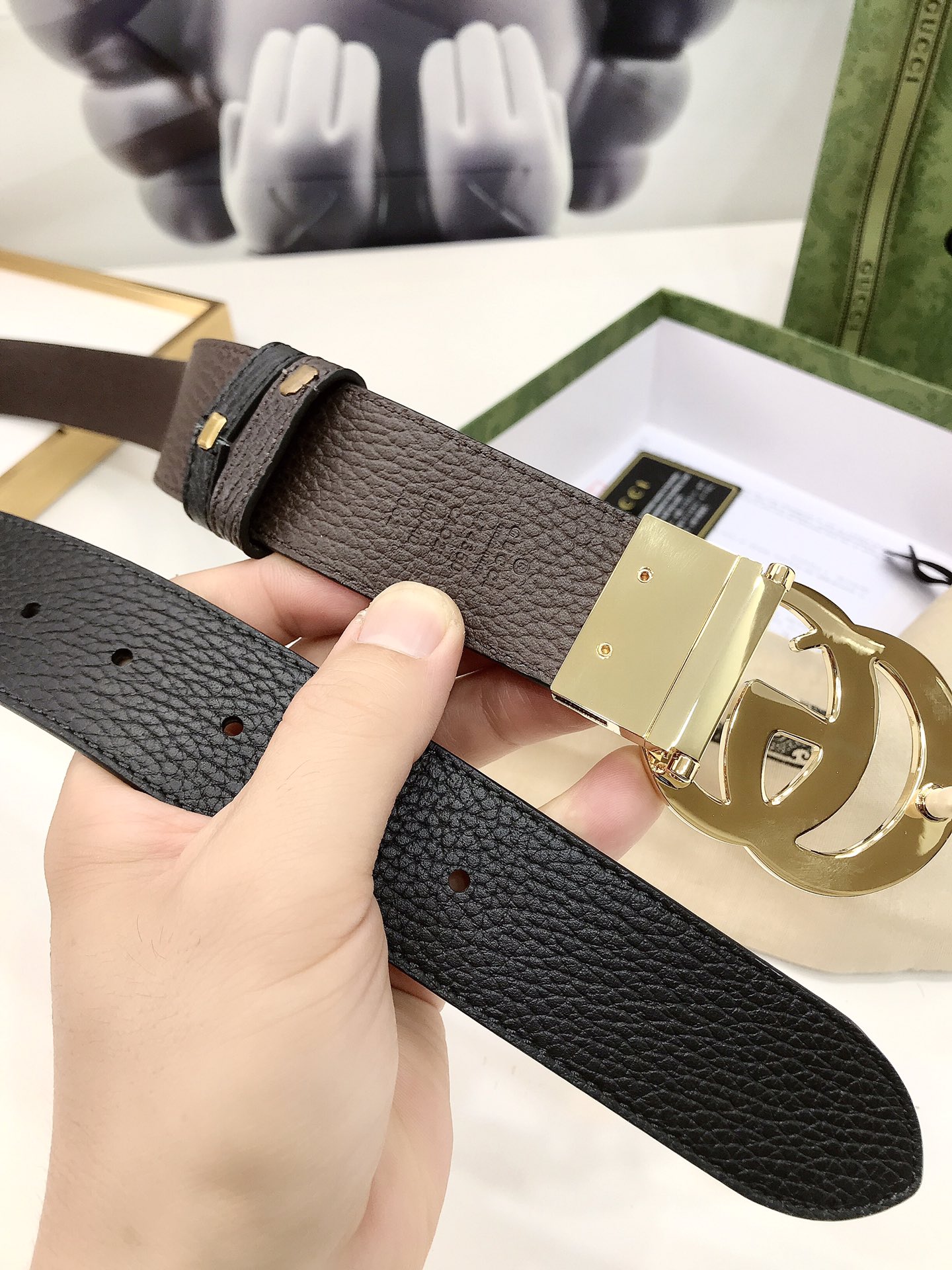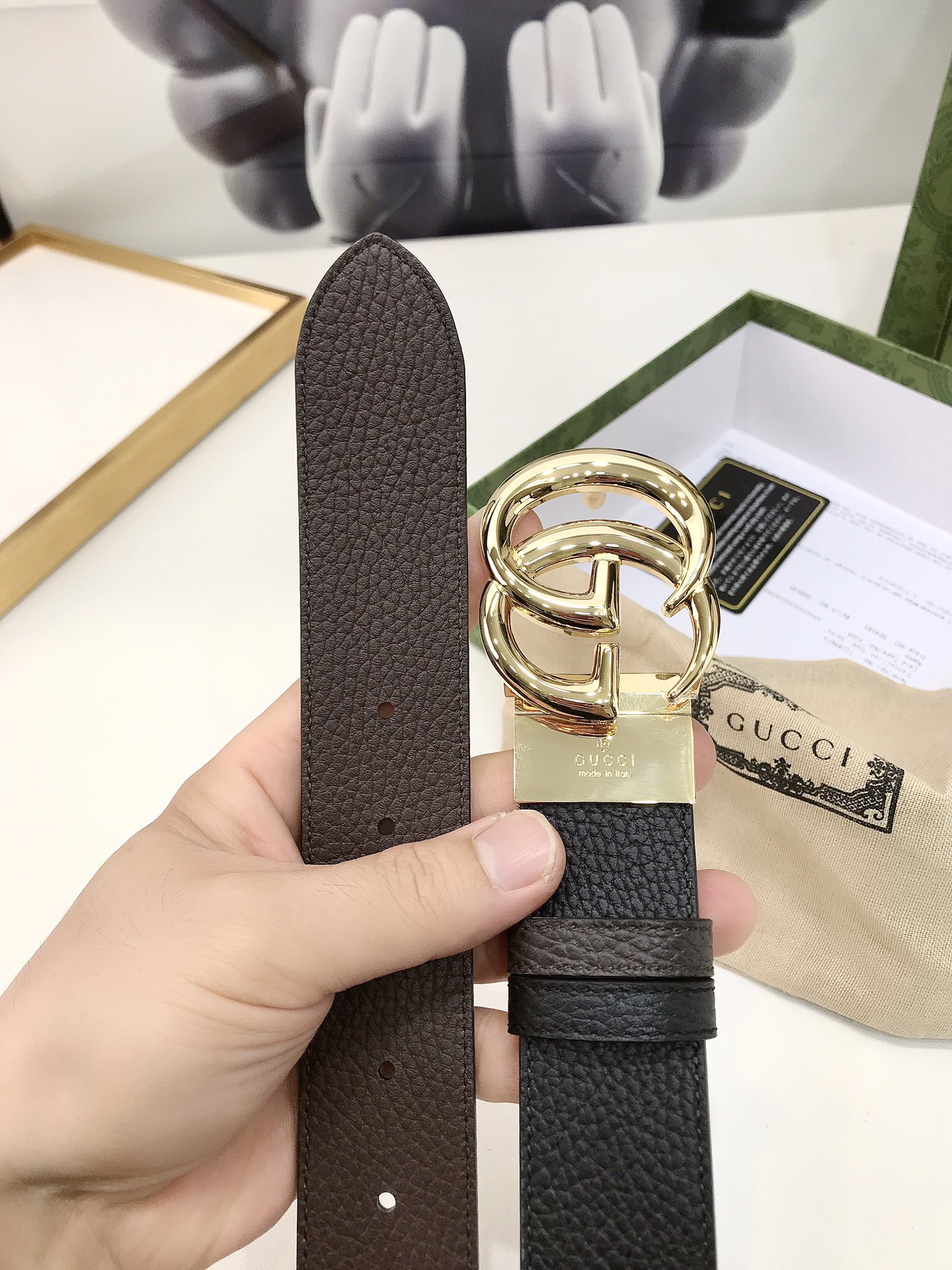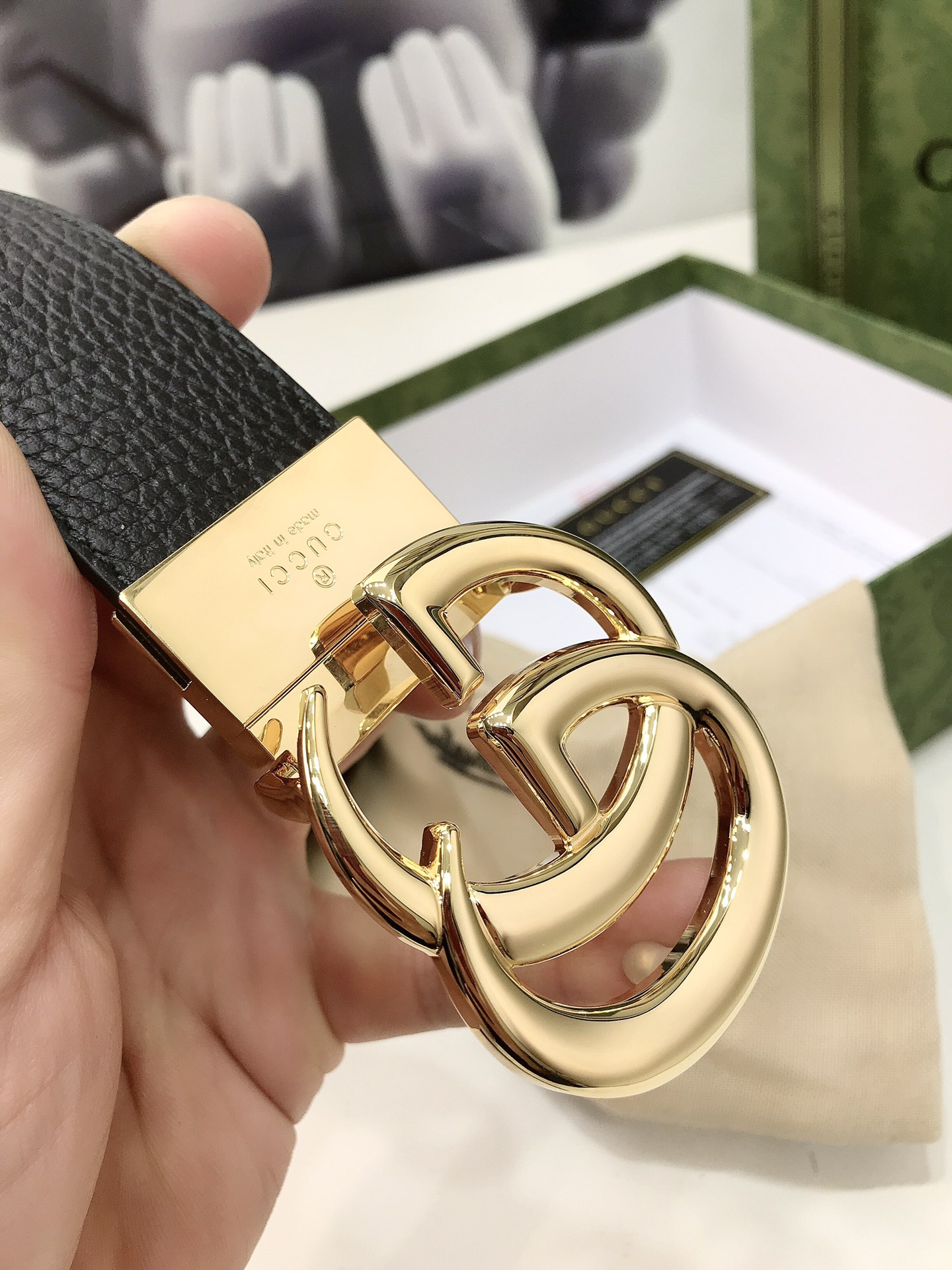 Gucci reversible leather belt, crafted from jacquard leather, adorned with a GG buckle. Metal accessories are reinterpreted, influenced by the brand's glorious classic designs from the 1970s. 3.7cm wide top