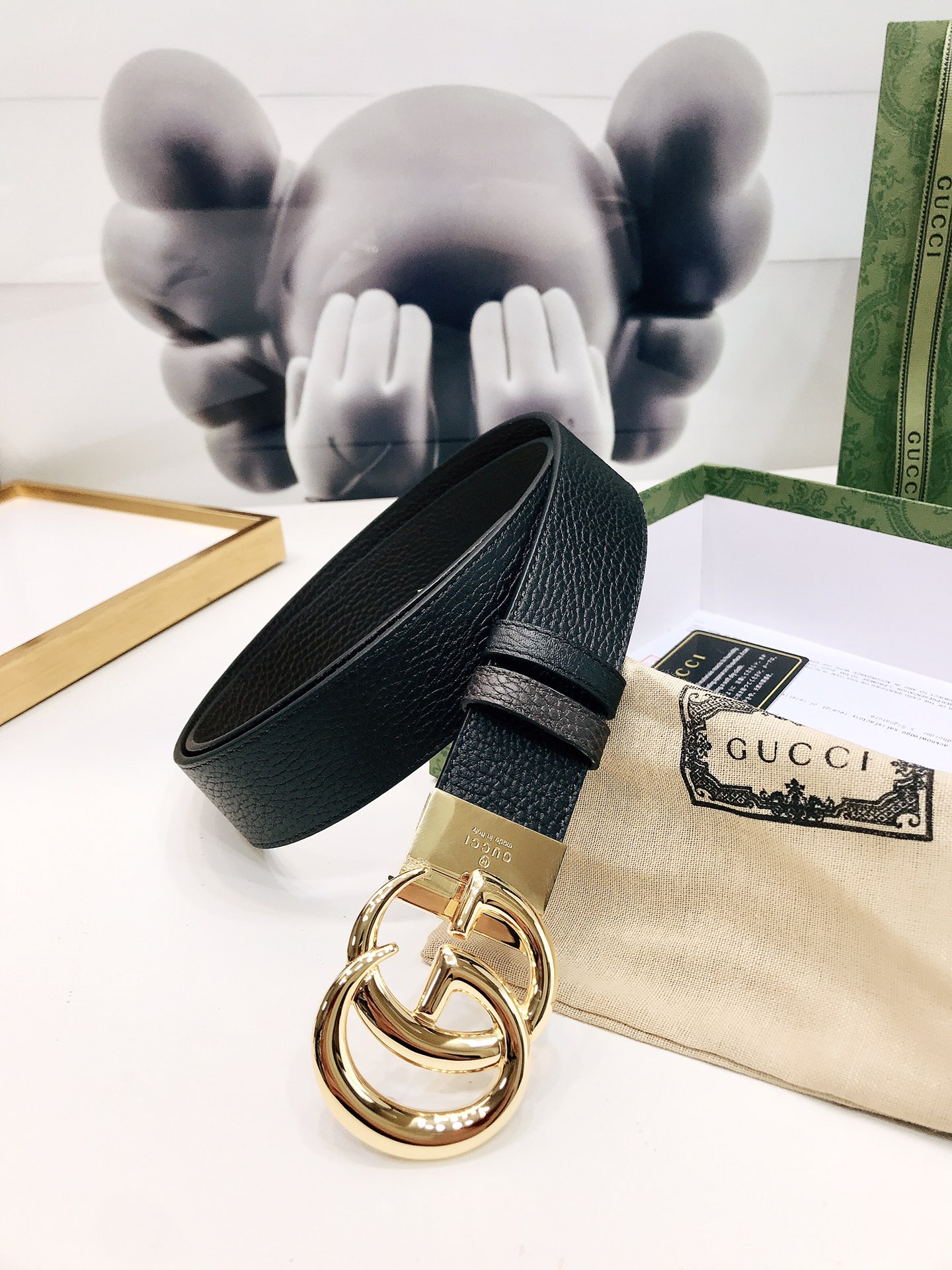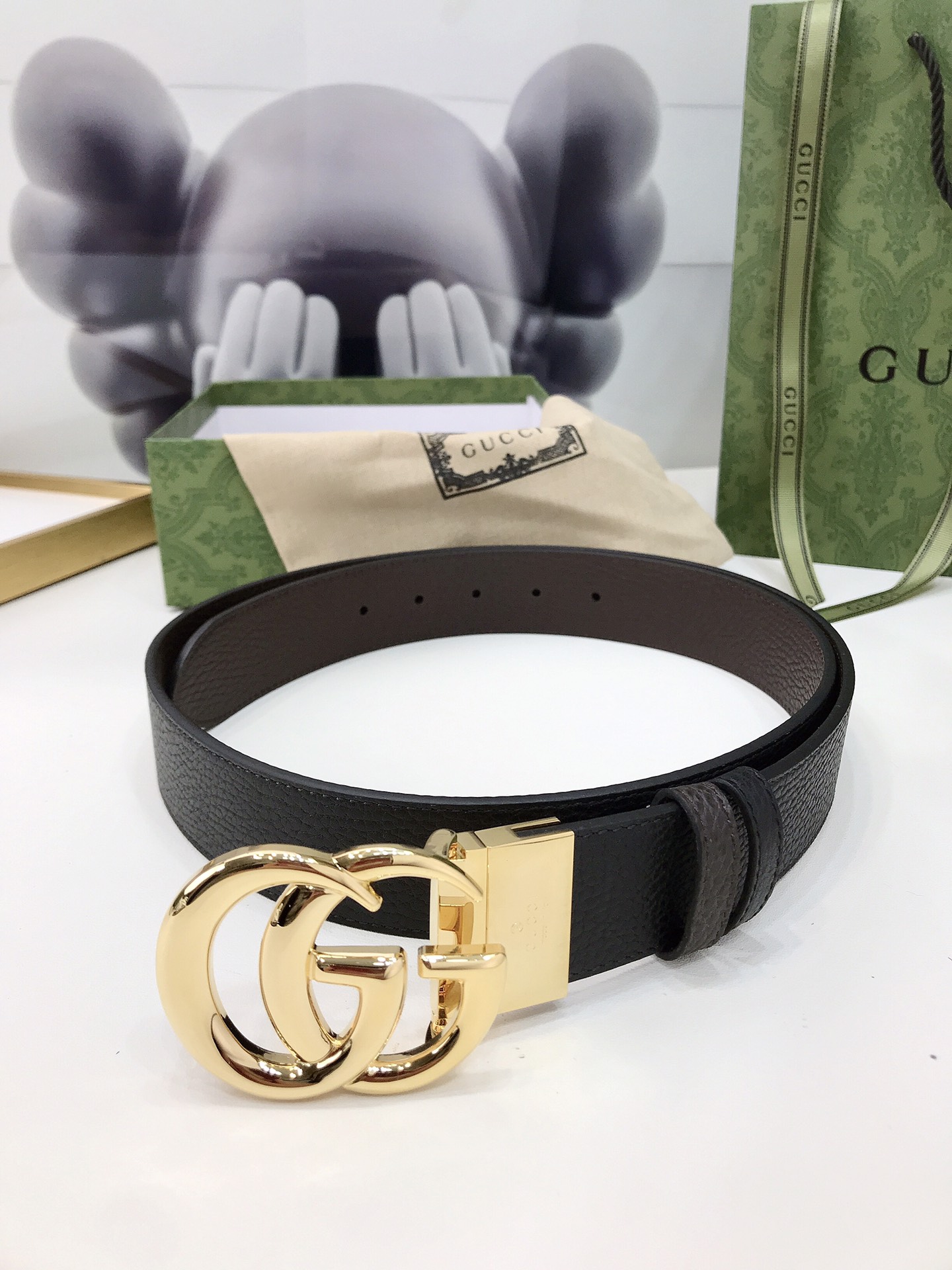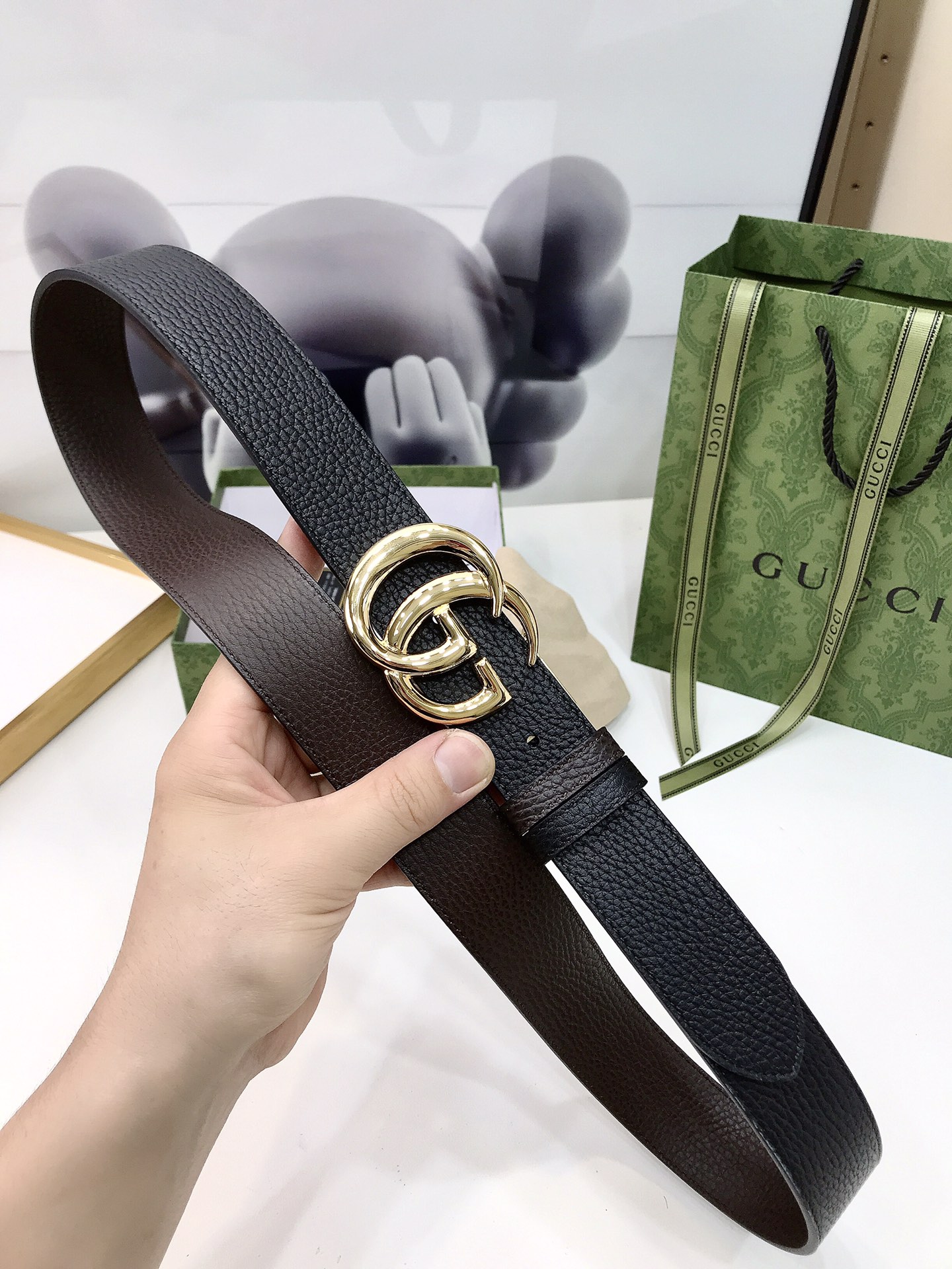 Gucci reversible leather belt, crafted from jacquard leather, adorned with a GG buckle. Metal accessories are reinterpreted, influenced by the brand's glorious classic designs from the 1970s. 3.7cm wide top