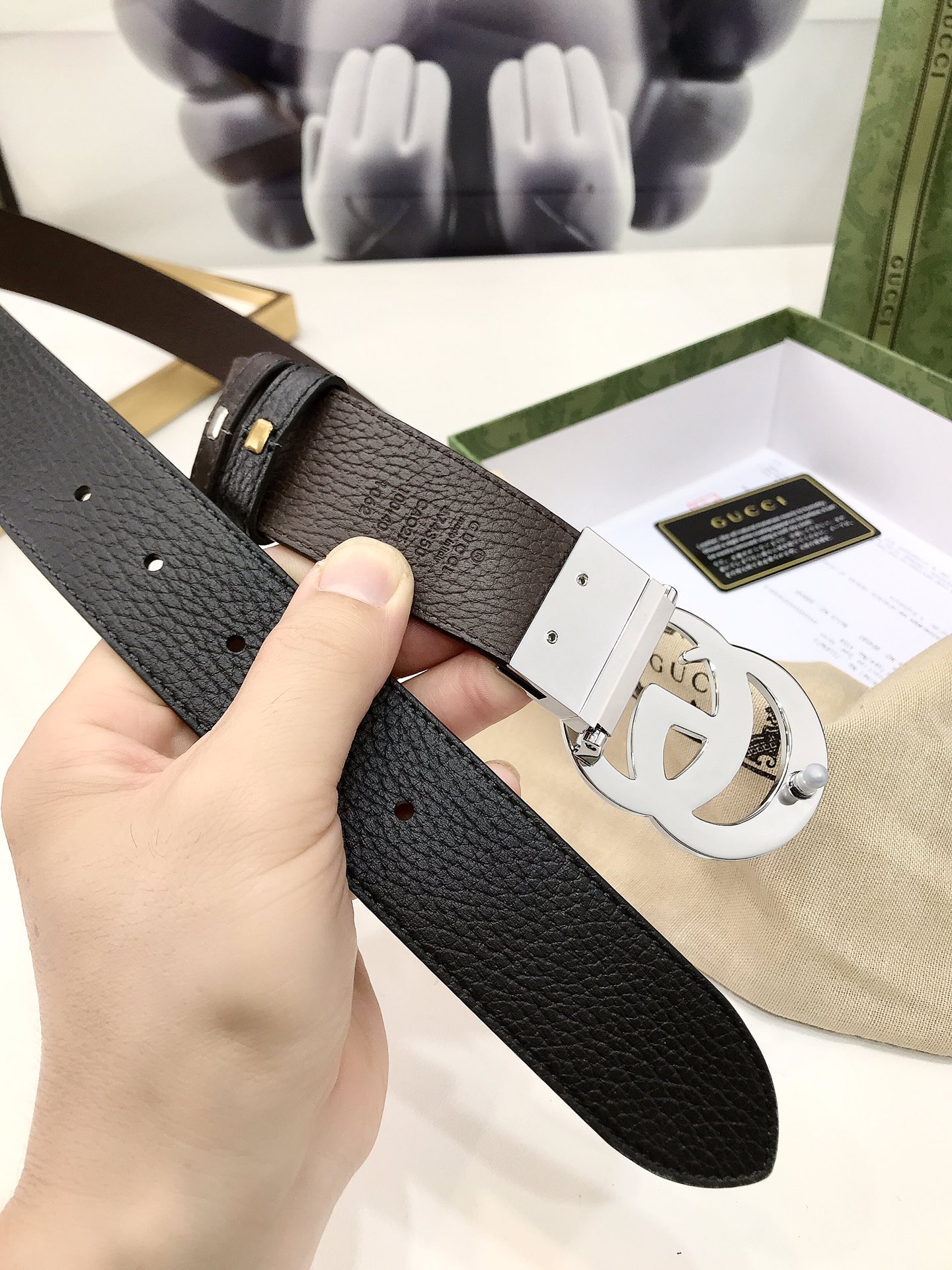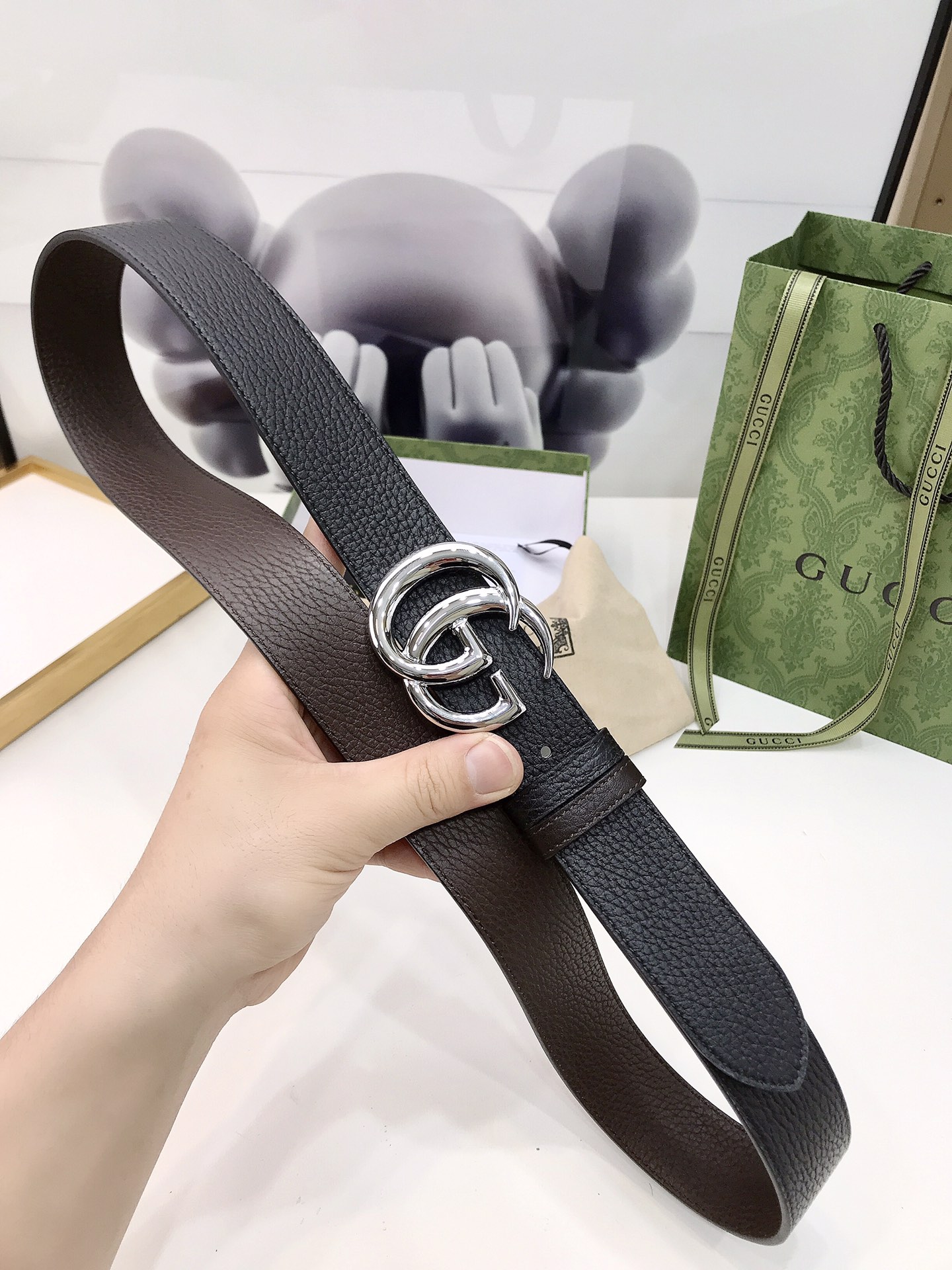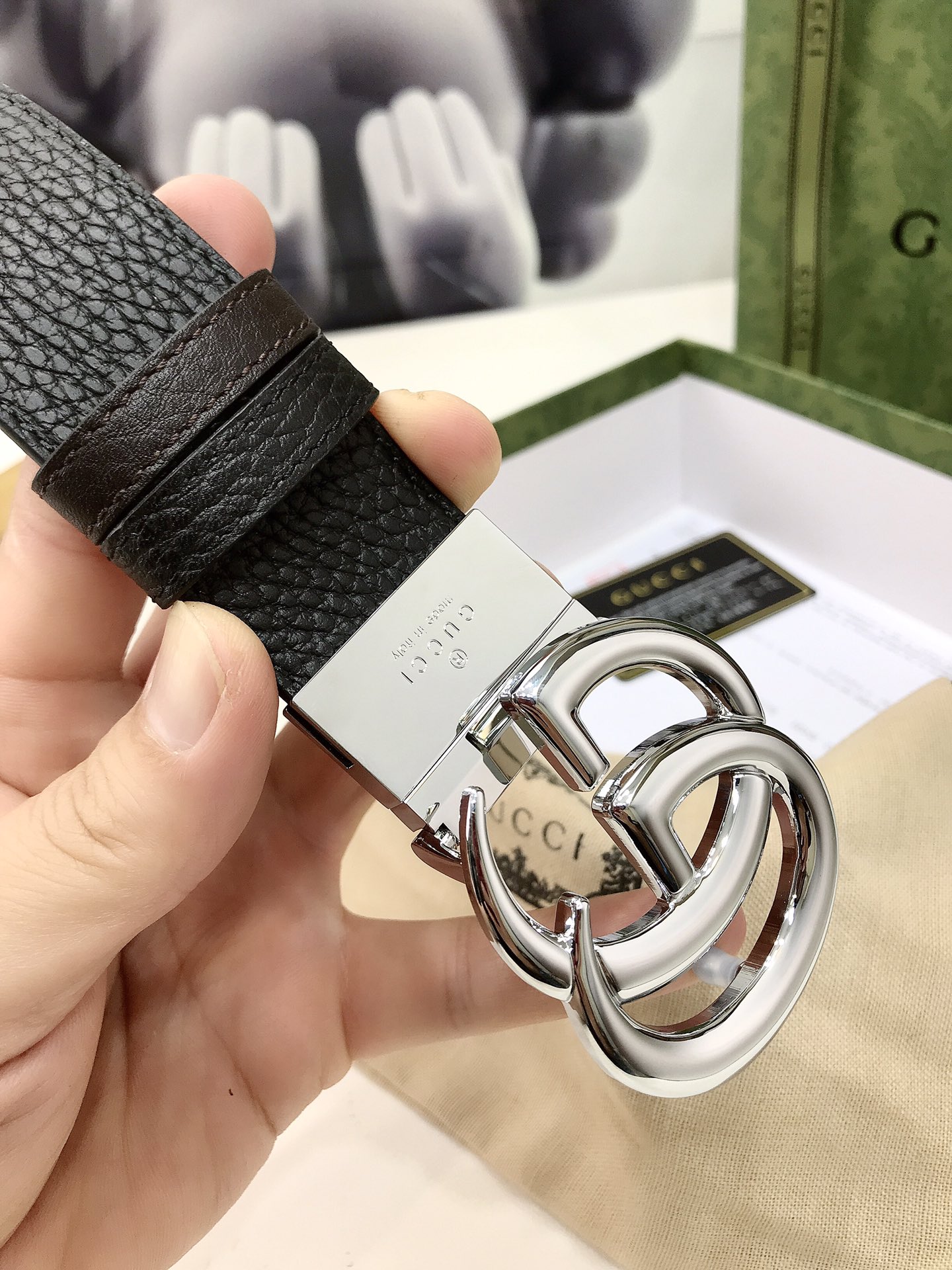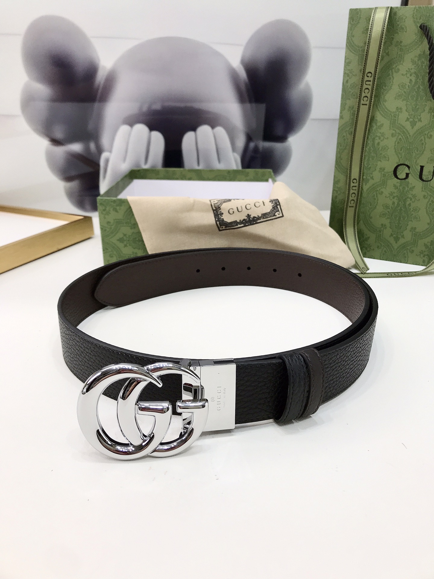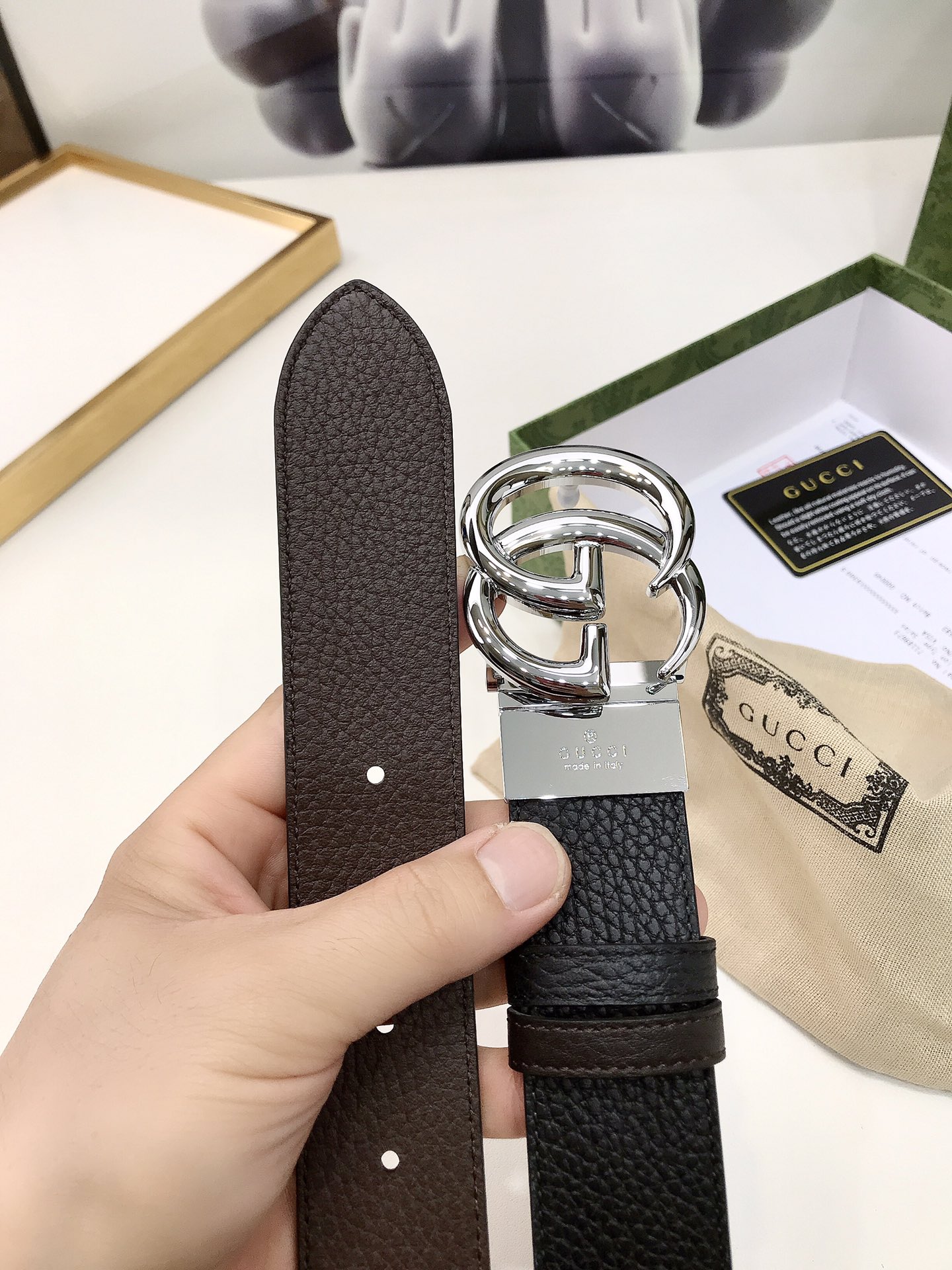 Gucci reversible leather belt, crafted from grained leather, adorned with a GG buckle. Metal accessories are reinterpreted, influenced by the brand's glorious classic designs from the 1970s. 3.7cm wide top