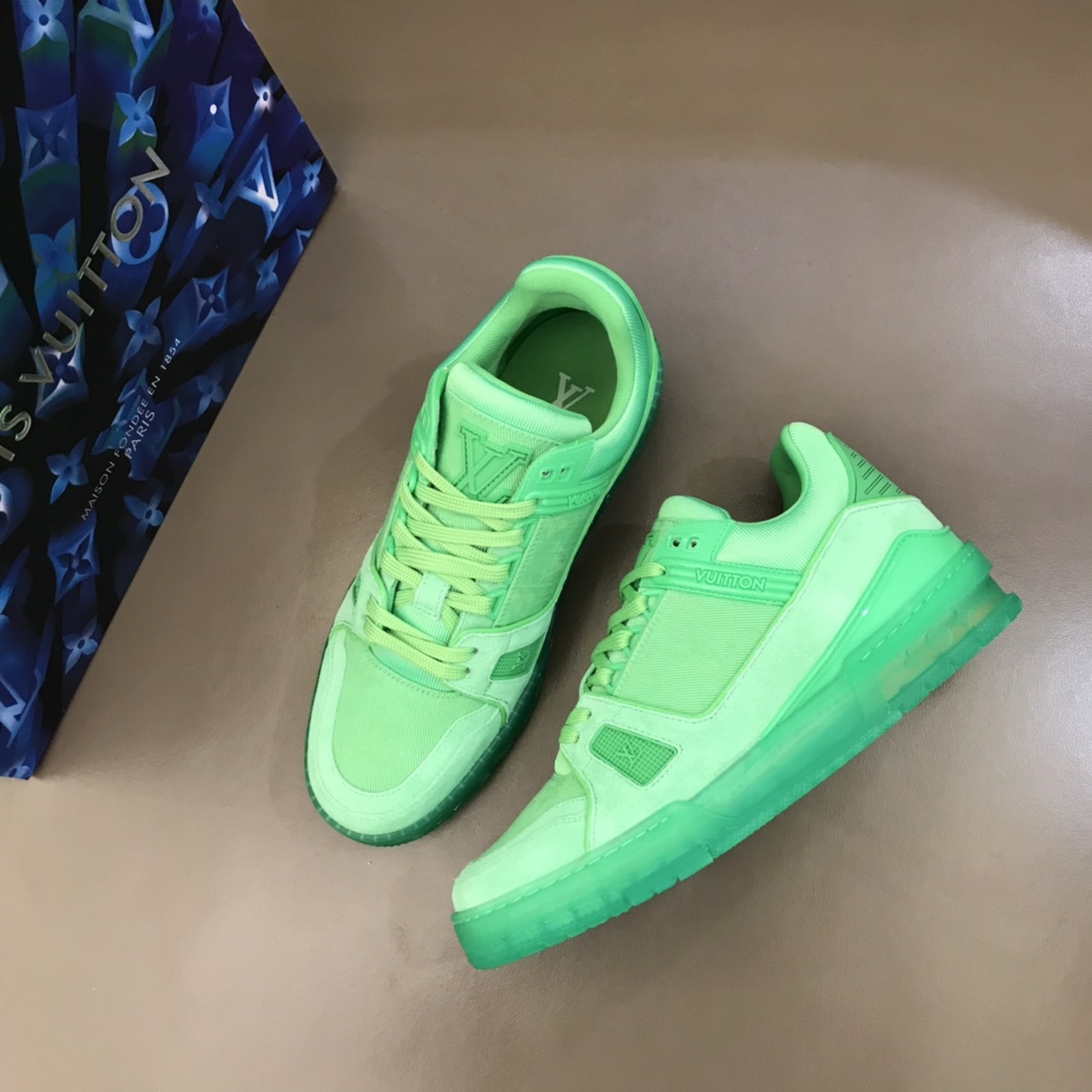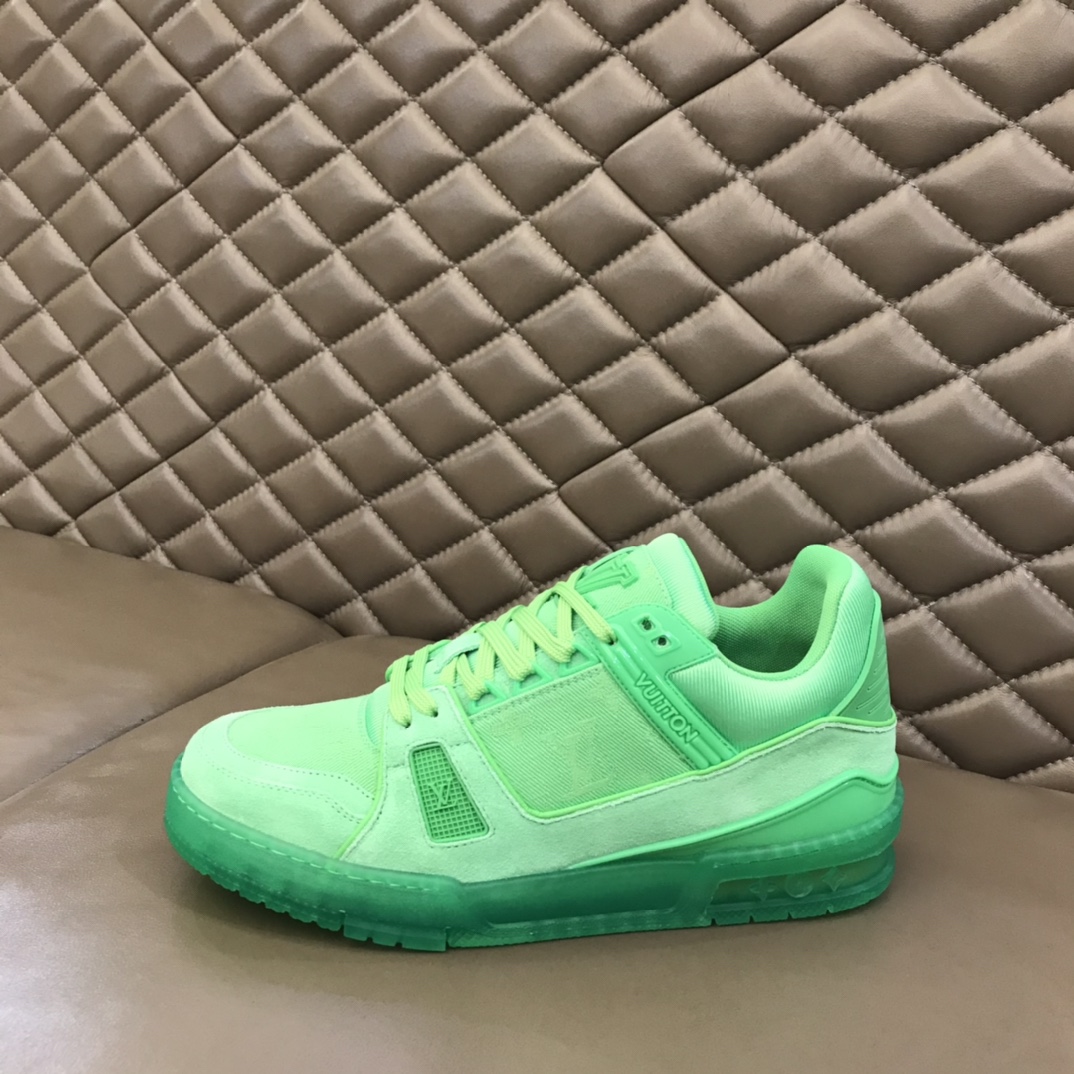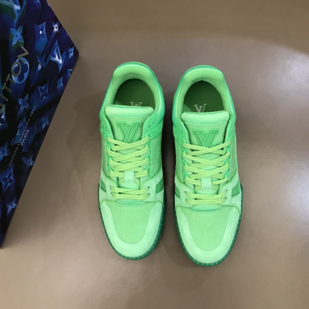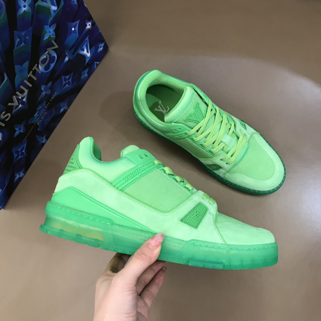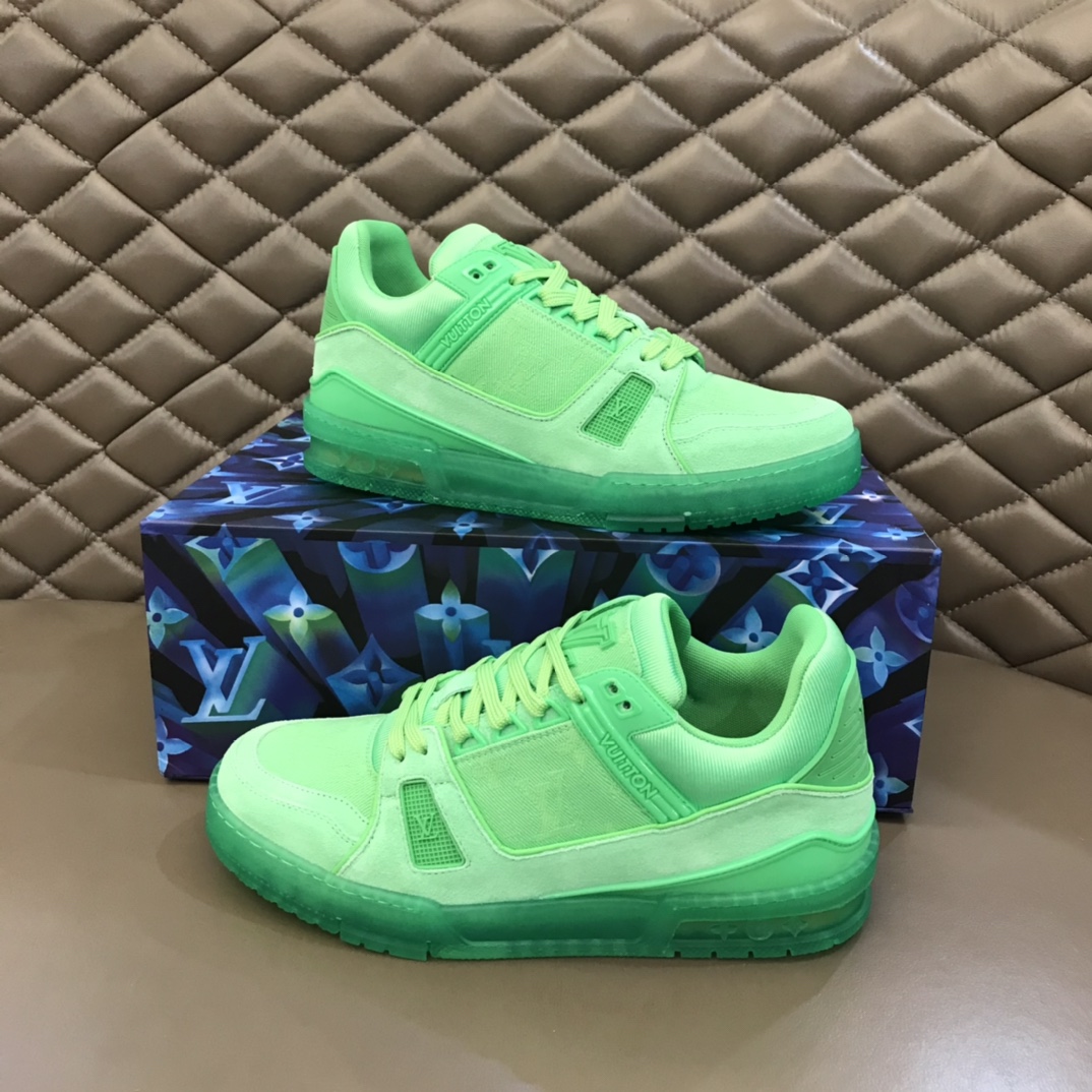 L 2021 New Spring/Summer Color Scheme, Men's Trainer Sneakers. Selected fluorescent Monogram denim fabric, reproducing Men's Artistic Director Virgil Abloh's inspirational interpretation of classic basketball shoes. This L Trainer sneaker appeared at the 2021 Spring/Summer Men's Fashion Show, featuring a striking contrast between plain leather and suede made from calfskin, showcasing exquisite craftsmanship throughout. The technical rubber outsole is equipped with an innovative gel insole, providing outstanding comfort. The outsole is decorated with a Monogram Flowers pattern. A classic basketball shoe style with high attention-grabbing appeal, easy to match, and offering breathable comfort when worn. Size: 38-45