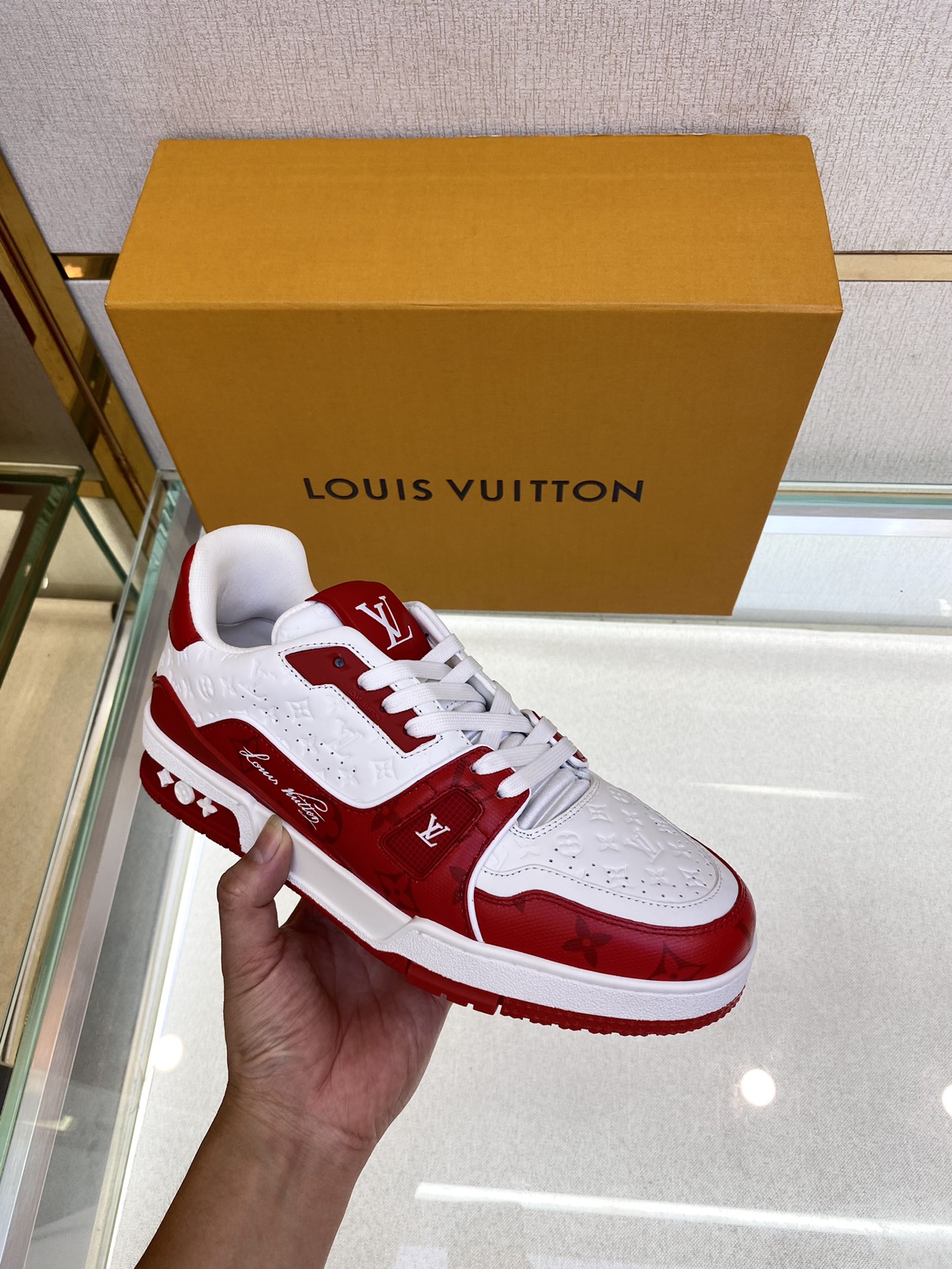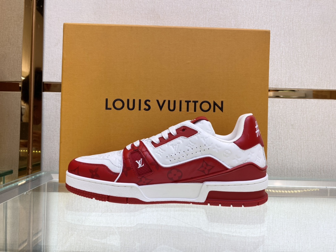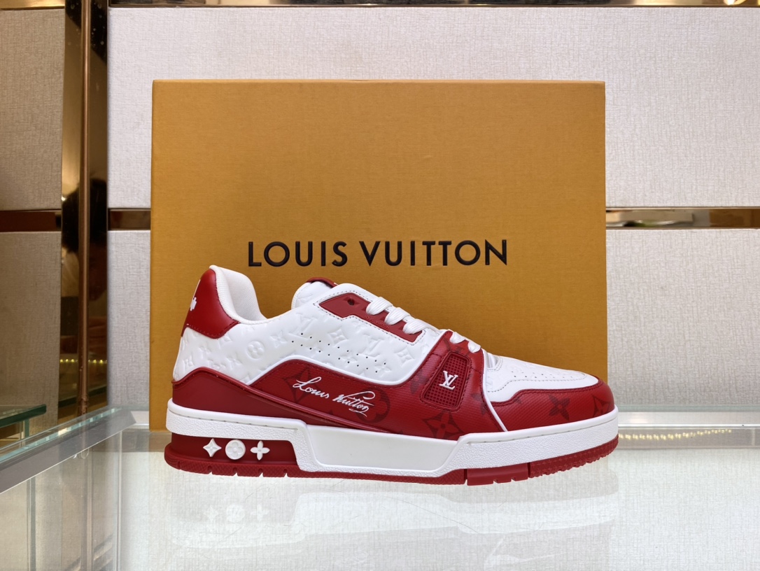 Louis V* Luxury Trainer Sneakers. These Trainer sneakers are made from imported calfskin. The design is simple, inspired by the retro basketball sneakers admired by Men's Artistic Director Virgil Abloh, with his handwritten Louis Vuitton English lettering on the side. The technical rubber outsole is equipped with an innovative gel insole, providing exceptional comfort. The outsole features Monogram Flowers pattern. A classic basketball sneaker style with high attention-grabbing appeal, easy to pair, and offers breathable comfort when worn! Sizes: Women 35-39, Men 39-44 (38, 45, 46 can be custom-made).