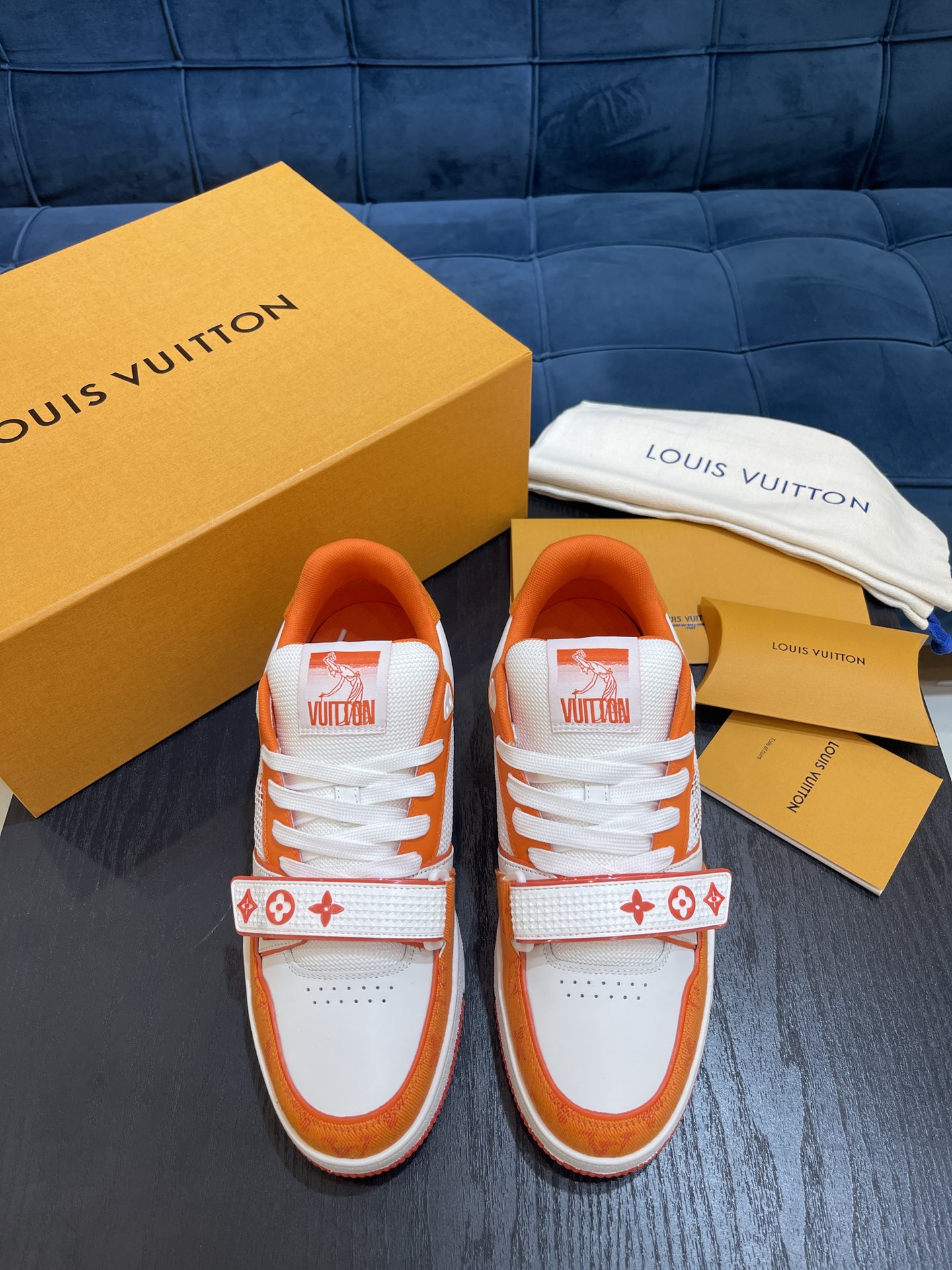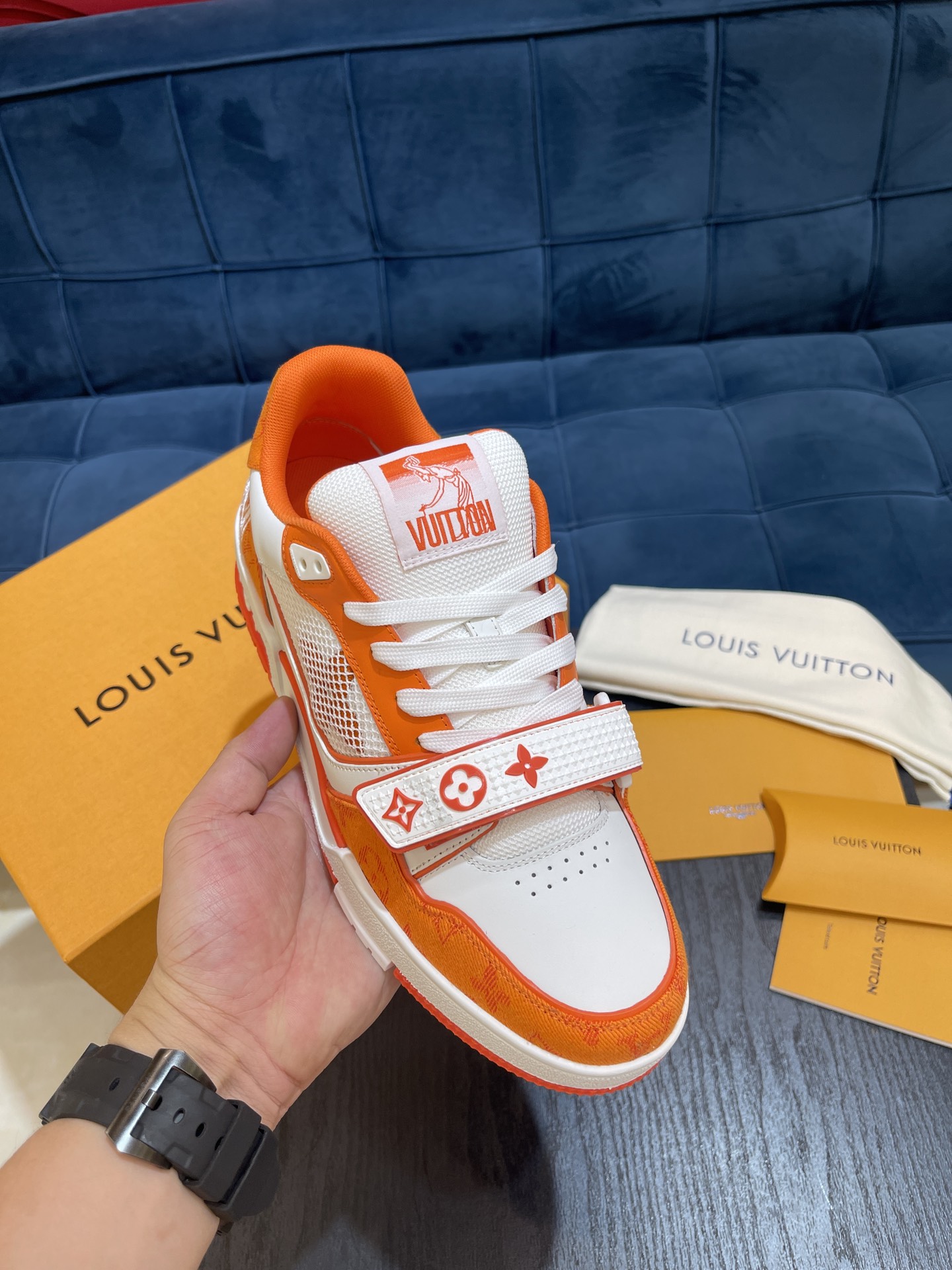 Virgil Abloh drew inspiration from retro basketball shoes to present the LV Trainer sneakers for Louis Vuitton, creating a new classic in the footwear collection. The Monogram denim construction is paired with Monogram flower hook-and-loop straps.