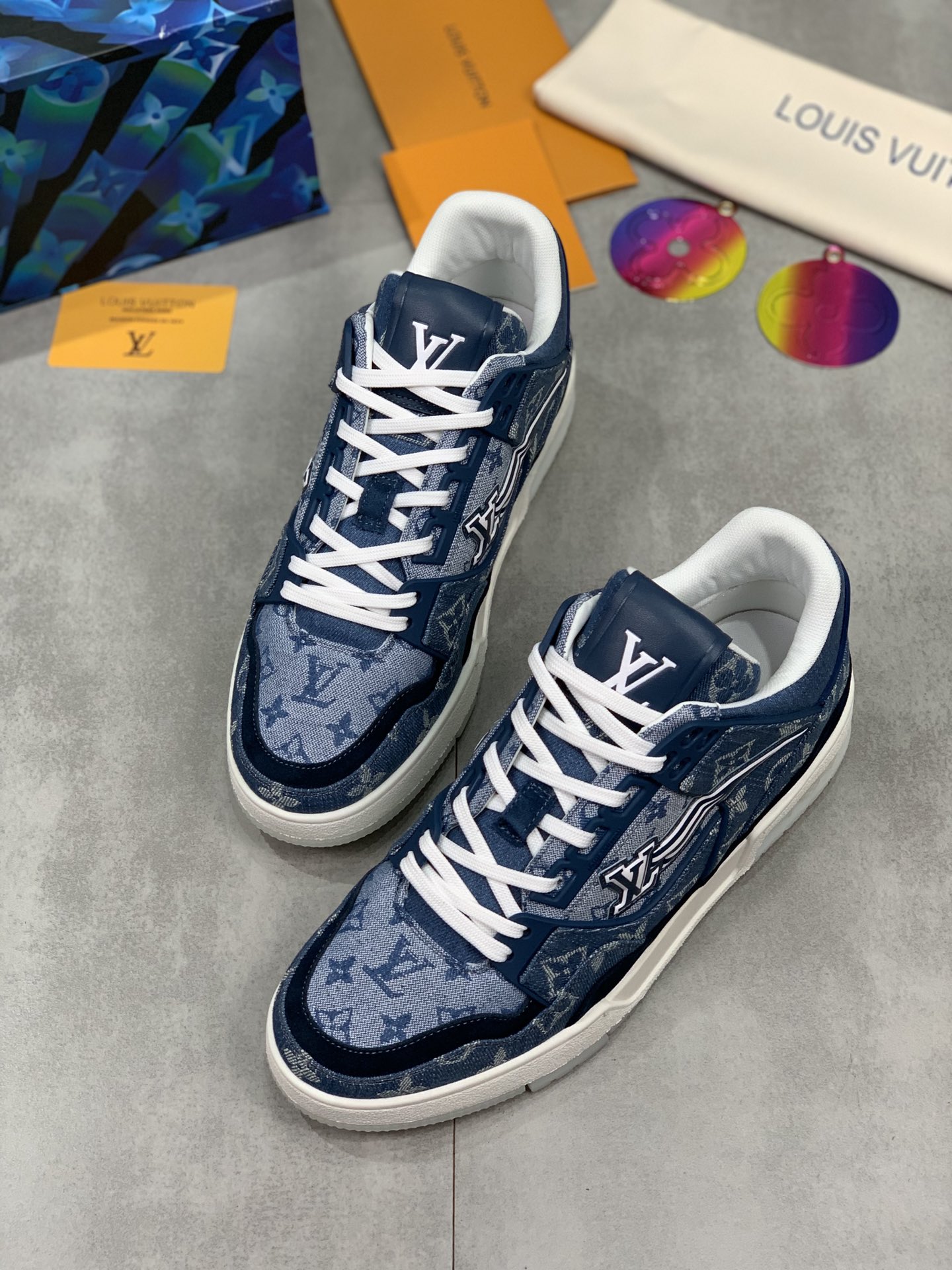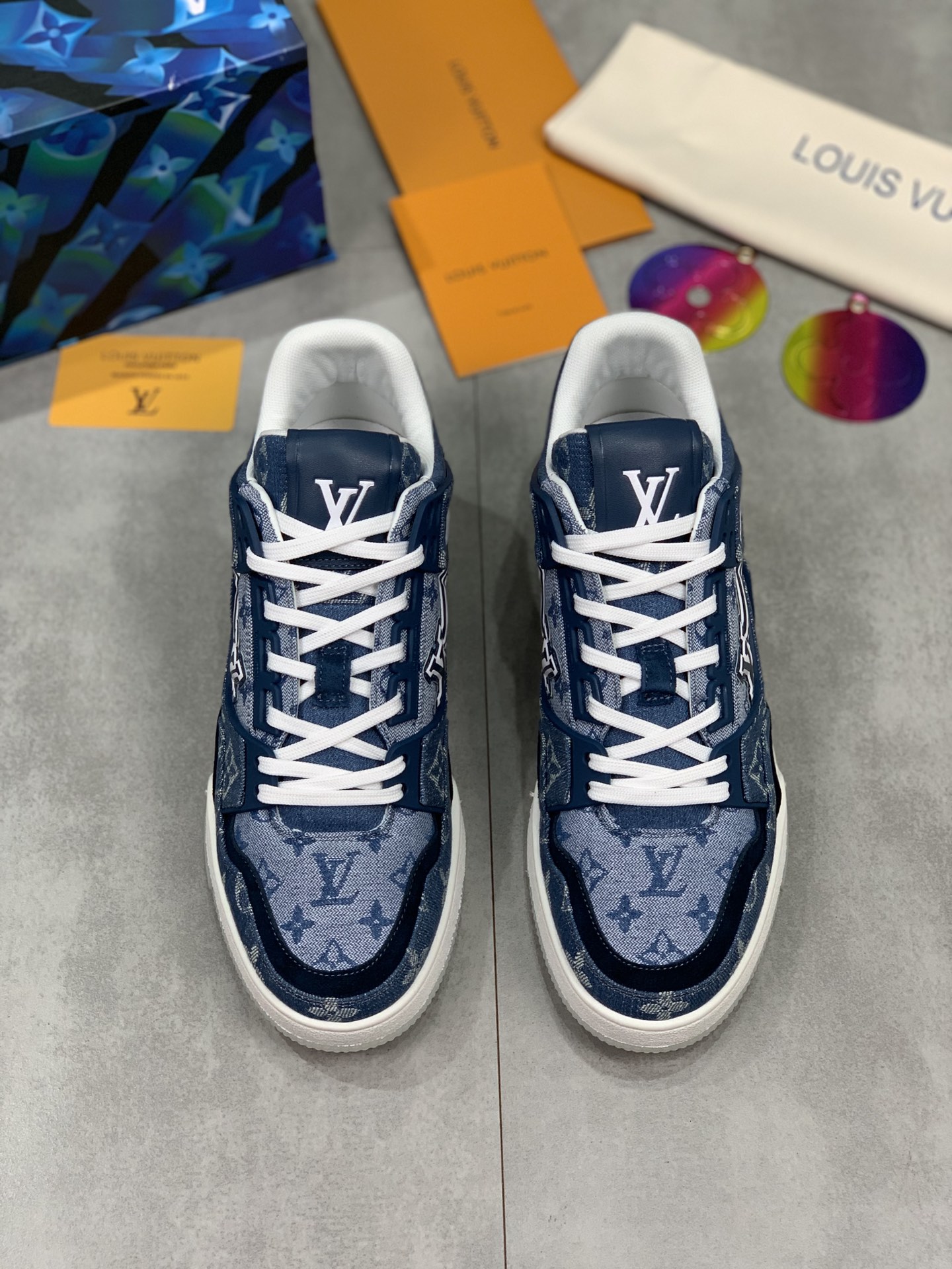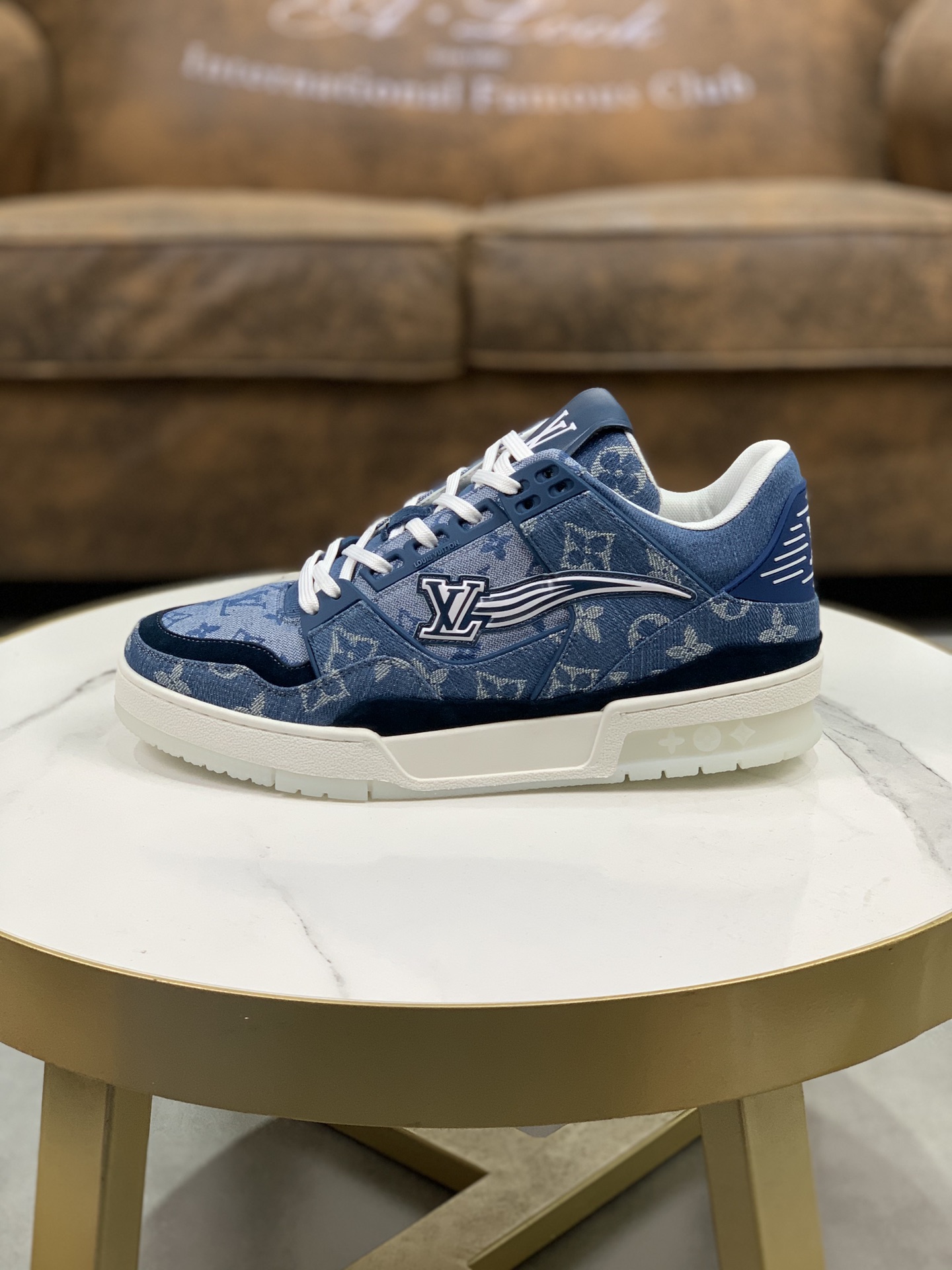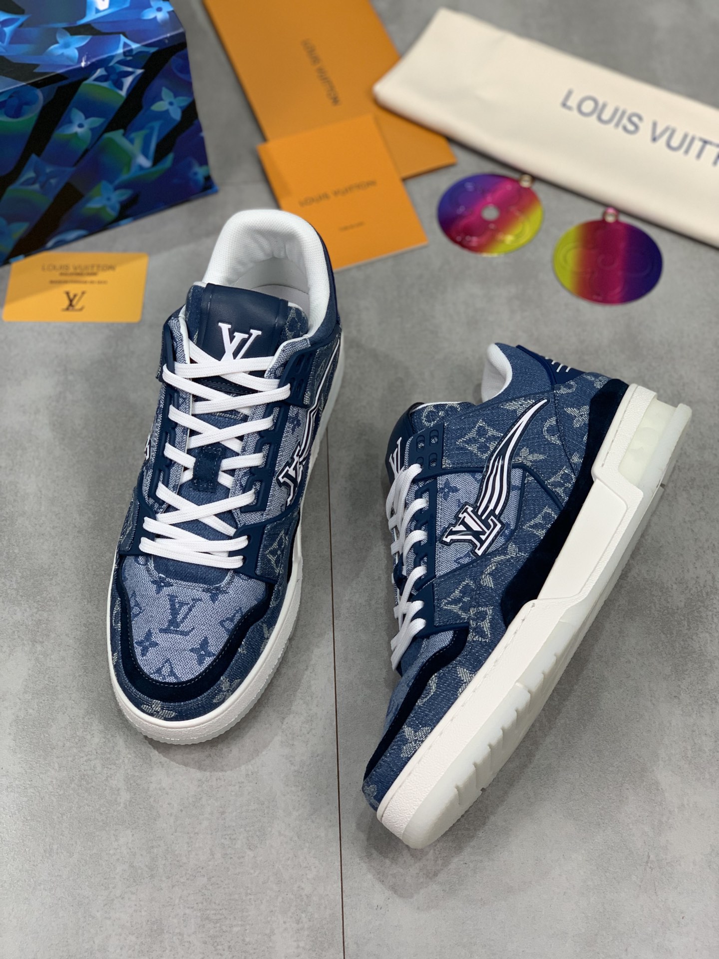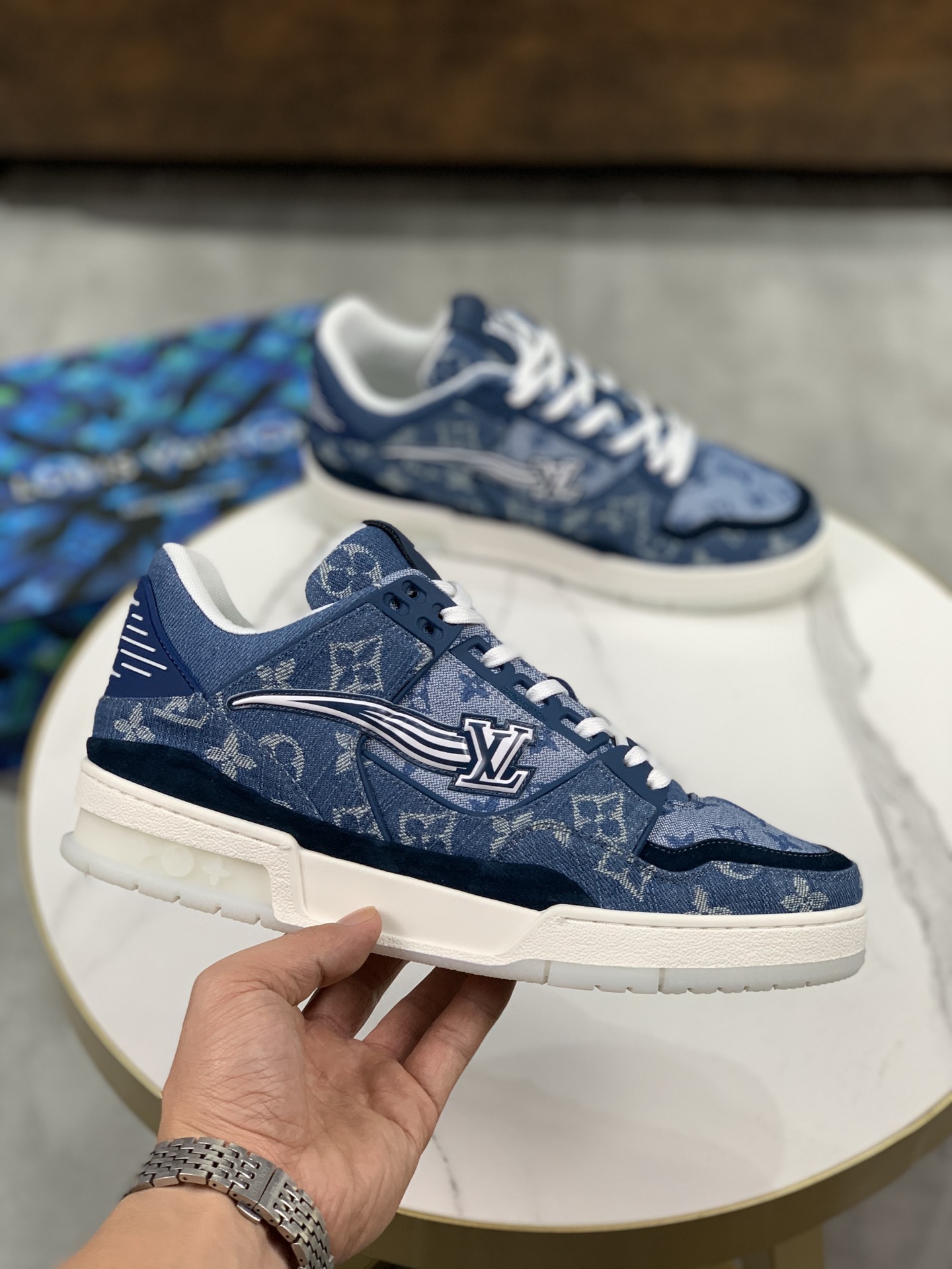 This design presents the interpretation of retro basketball shoes as LV Trainer sneakers. Made from Monogram denim in different shades of blue.