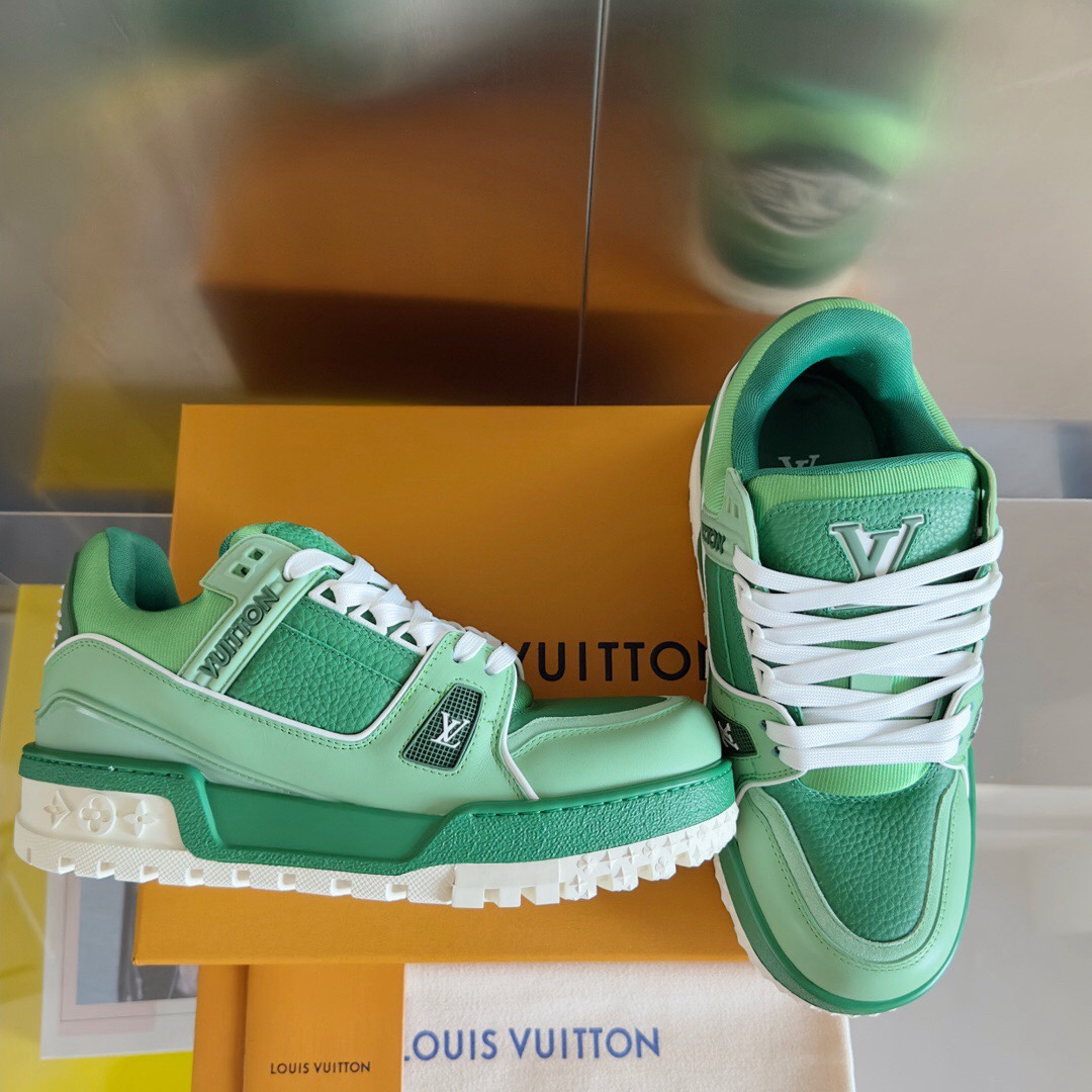 Original version purchased for development and production. This Trainer Maxi uses plain and grained calfskin, as well as suede made from calfskin to interpret color techniques, reinterpreting the Trainer in an enlarged proportion. The thick EVA outsole upgrades for a lightweight feel. Letters and the Vuitton logo are featured on the upper.