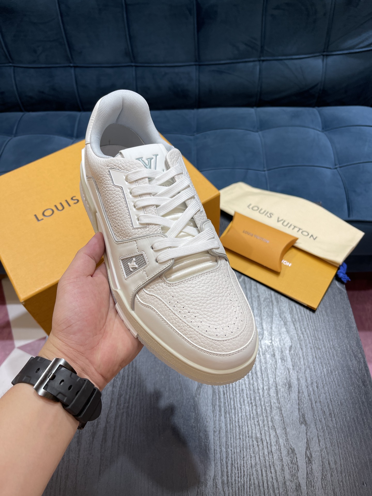Rubber outsole Tongue, sides, and back adorned with LV letters Sides decorated with Vuitton logo