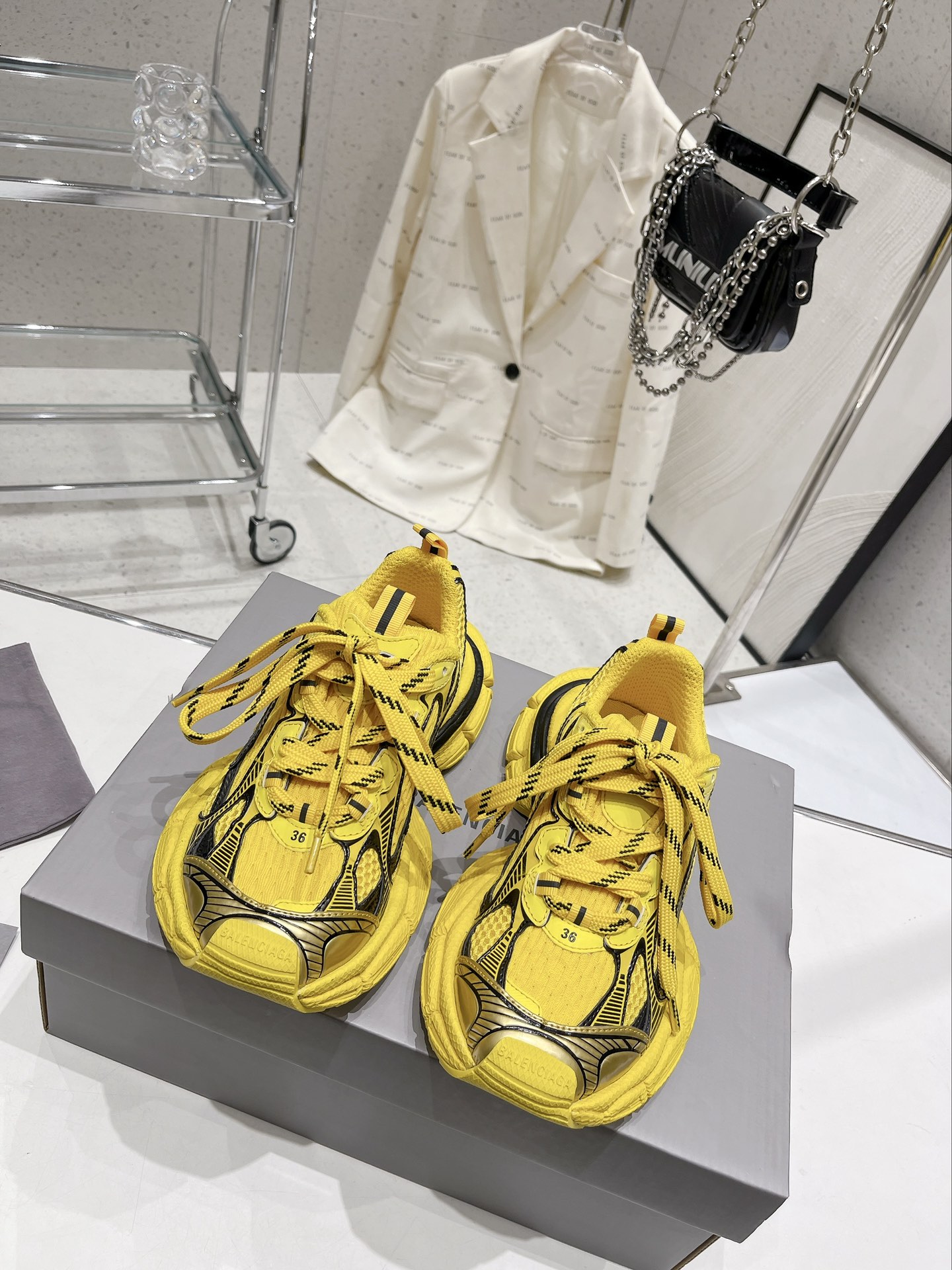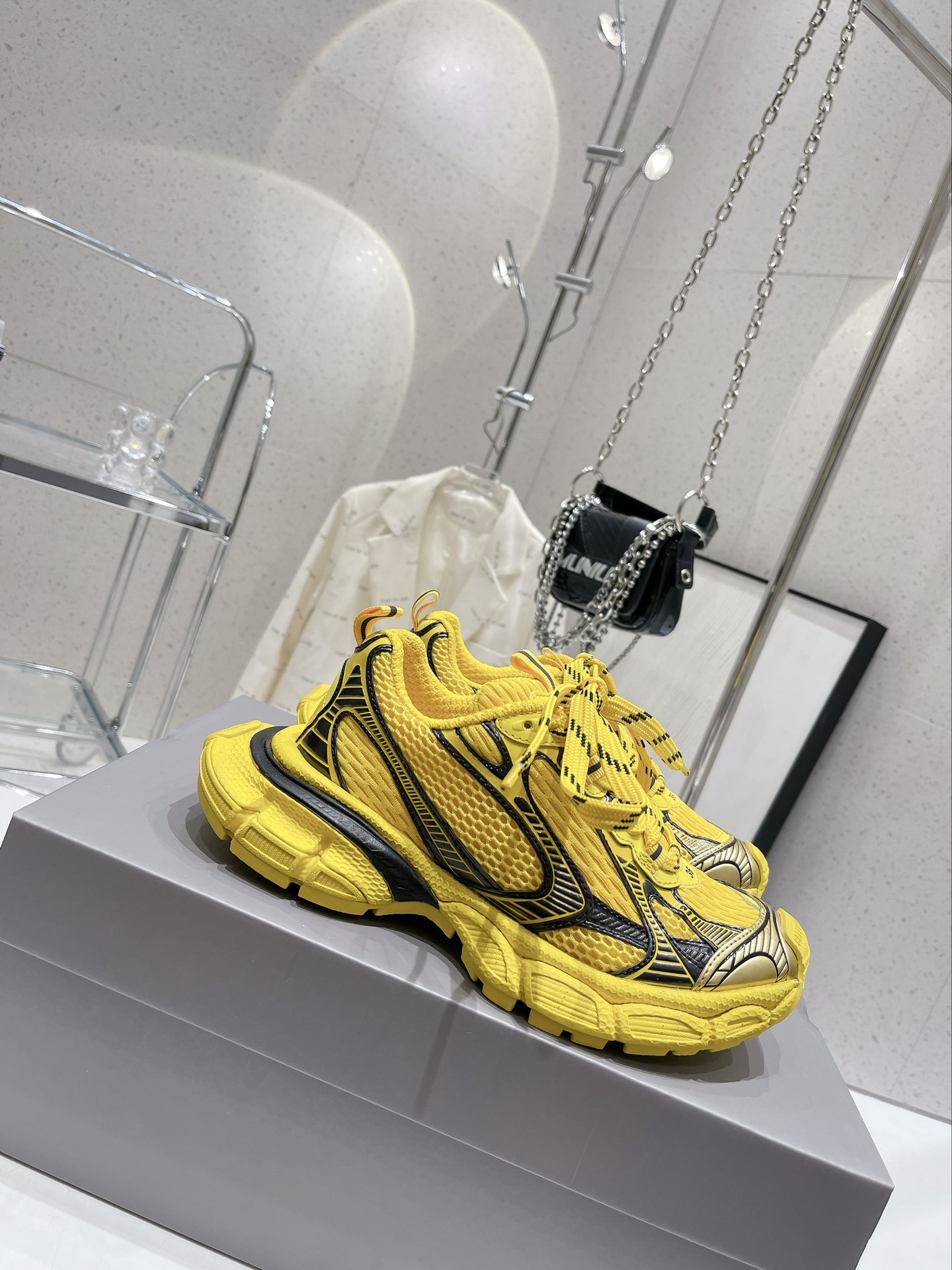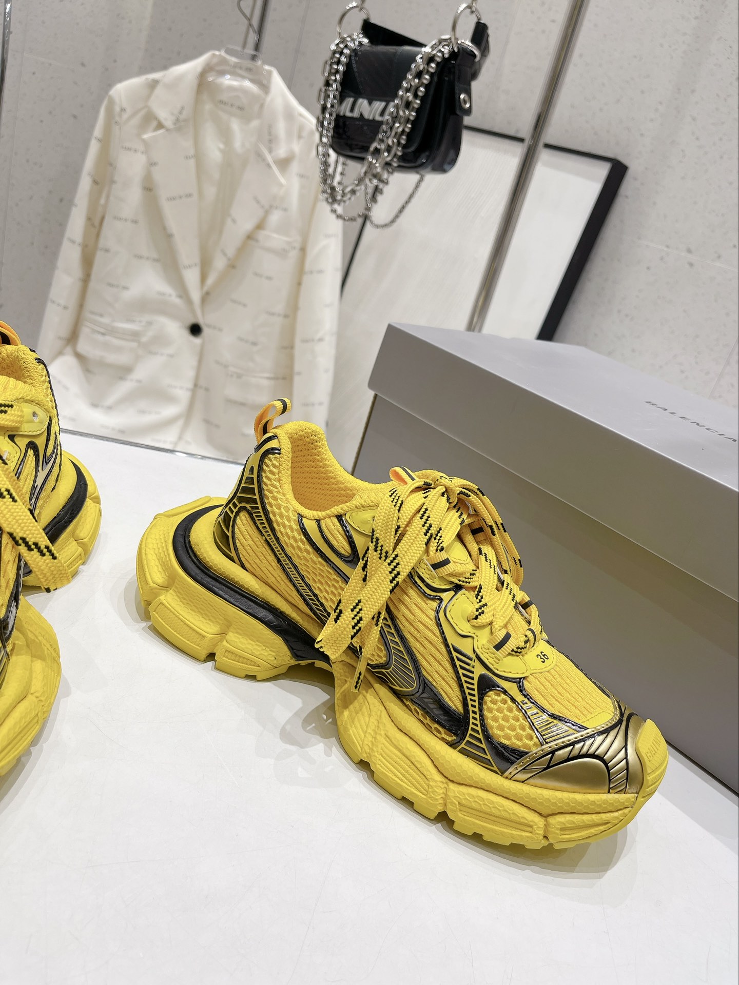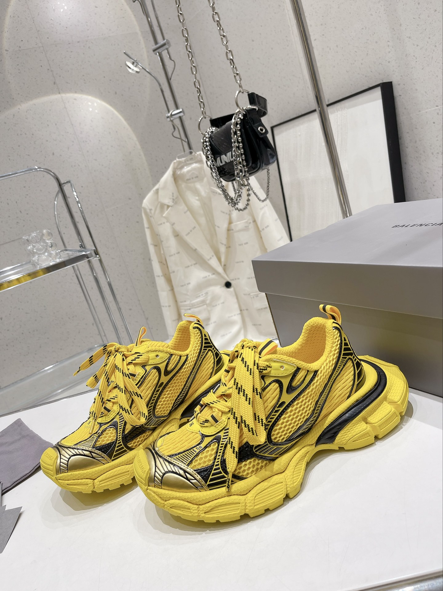 Original version purchased for development, production of Balenciaga 3XL Sneaker. The overall shoe design draws inspiration from the creative concepts of both the Balenciaga Track and Balenciaga Runner models. It's like taking off the outer frame of the Track upper while inheriting the streamlined shape of the Runner and the flat toe of the Track. An additional pair of tied laces is added to the front of the upper for styling.