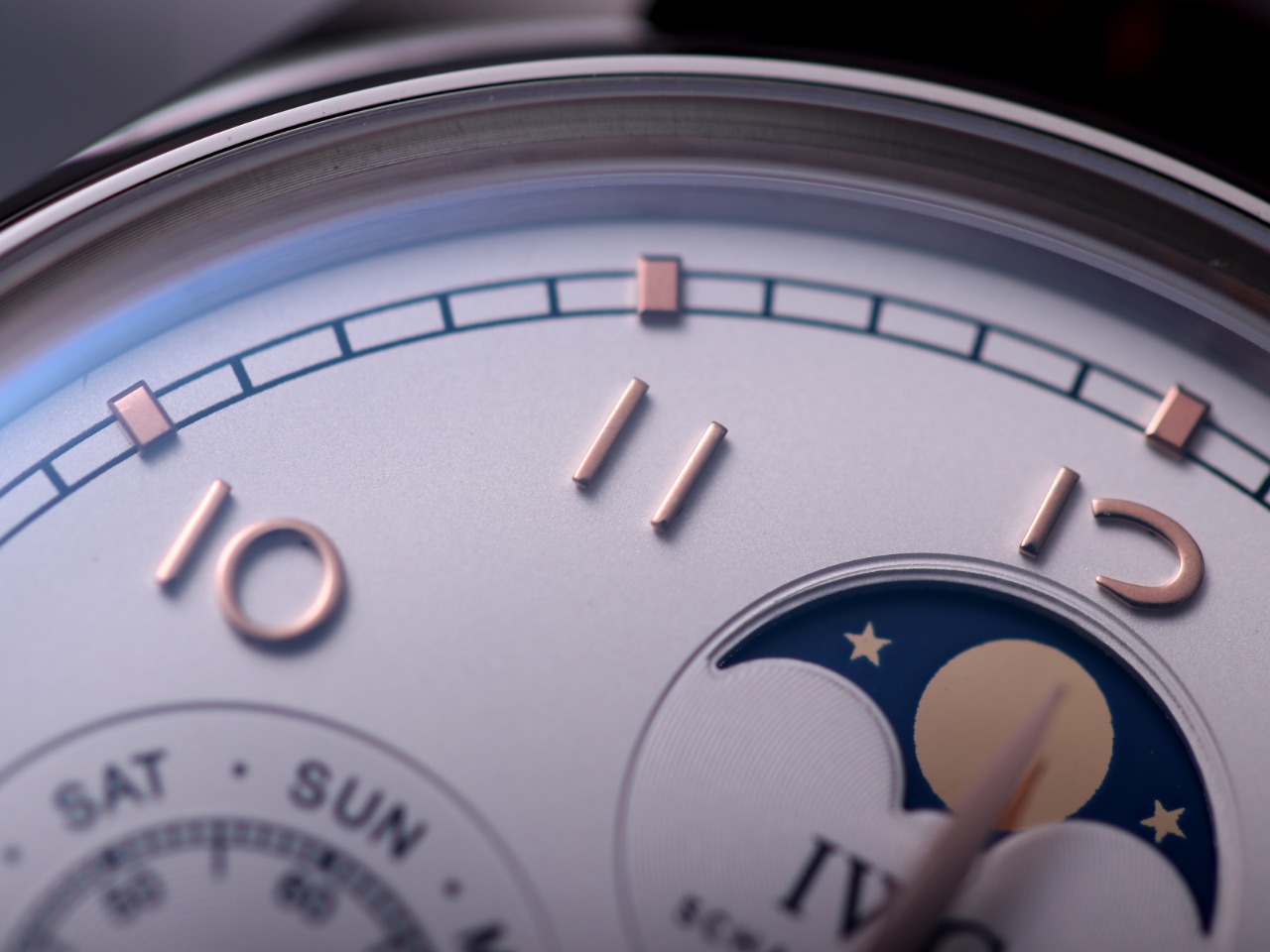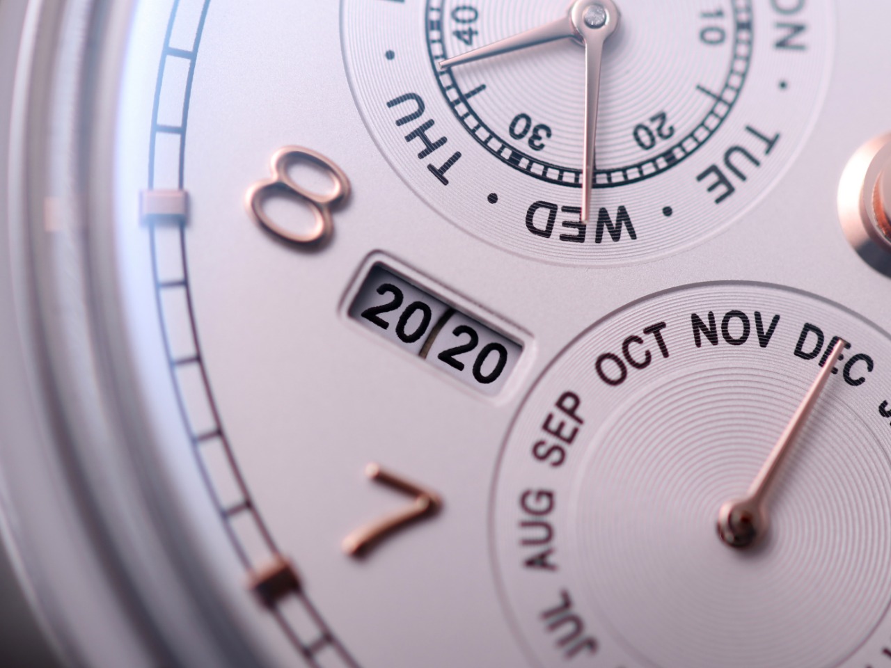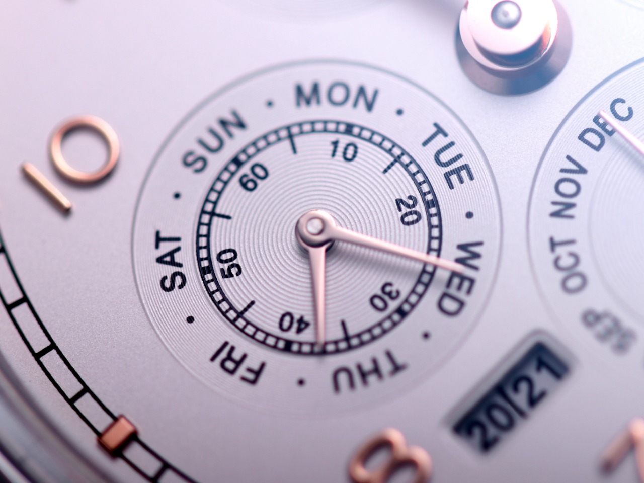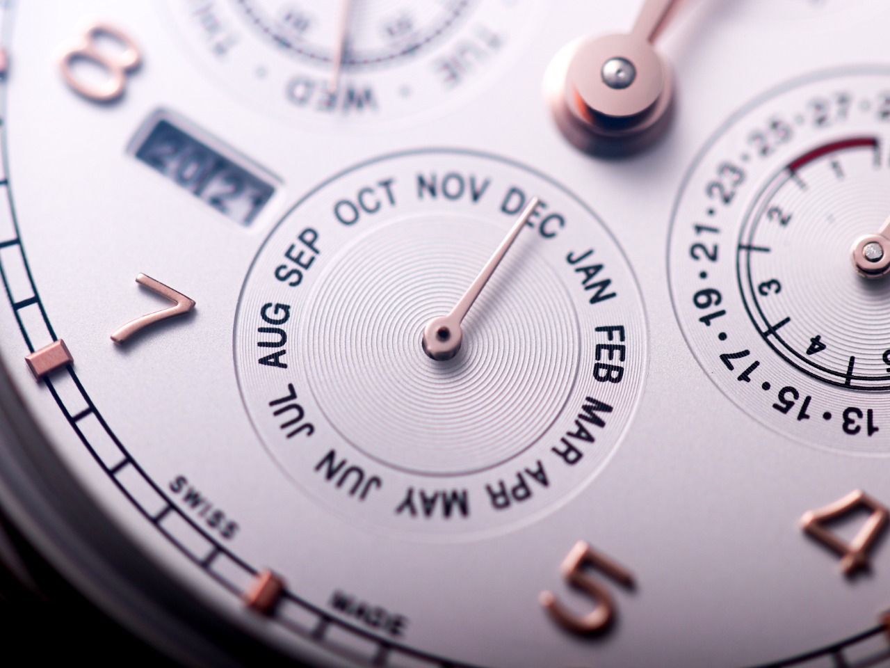 2. 【Date, Month, Day】— The date (3 o'clock position), month (6 o'clock position), and day (9 o'clock position) all operate normally via transmission and can be manually adjusted (date is adjusted bidirectionally by pulling the crown to the second position; month is adjusted via the hidden button at 8 o'clock; day can be adjusted by moving the hands).
