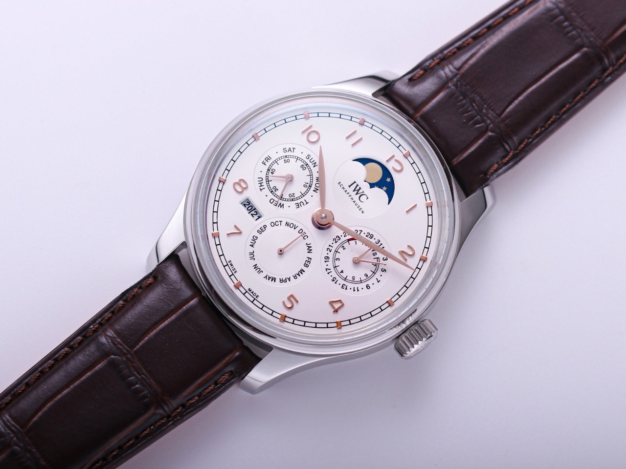 V9 IWC Portuguese Series True Perpetual Calendar, the first perpetual calendar IWC replica in the replica industry. It uses an imported high-precision movement as the base, upgraded to a replica of the 52610 movement. Not only does it achieve most of the perpetual calendar functions, but it also offers stable timekeeping and an extremely low return rate. This is a rare, highly durable complex function watch in the replica market.