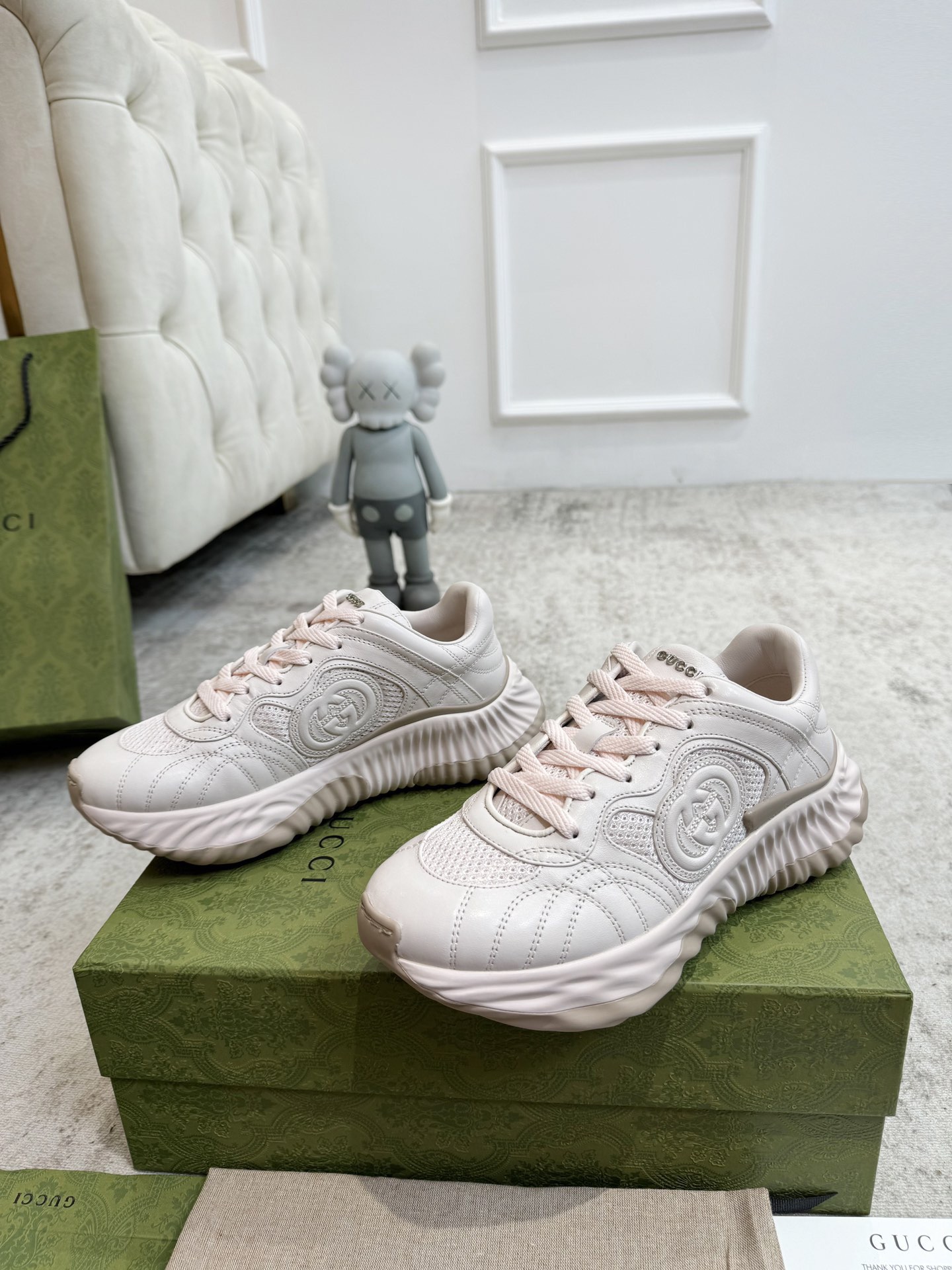 35–40 39—45 Gucci Rife series sneakers are crafted with innovative stitching techniques, creating a fluid texture like water. The leather design is paired with three-dimensional interlocking double G leather appliqués and Gucci letter metal fittings, achieving a free-flowing texture with 3D effects throughout the entire shoe.