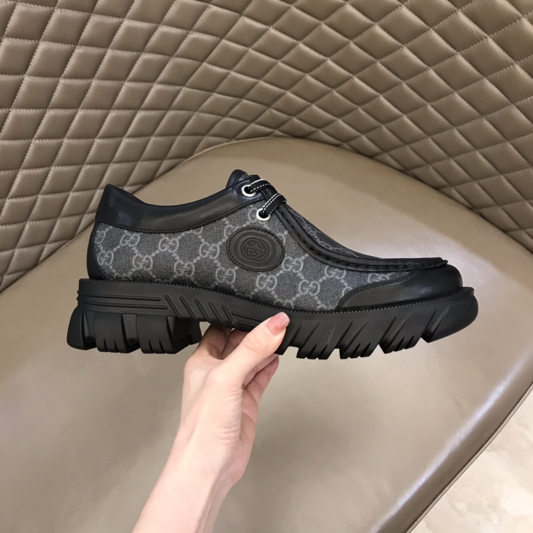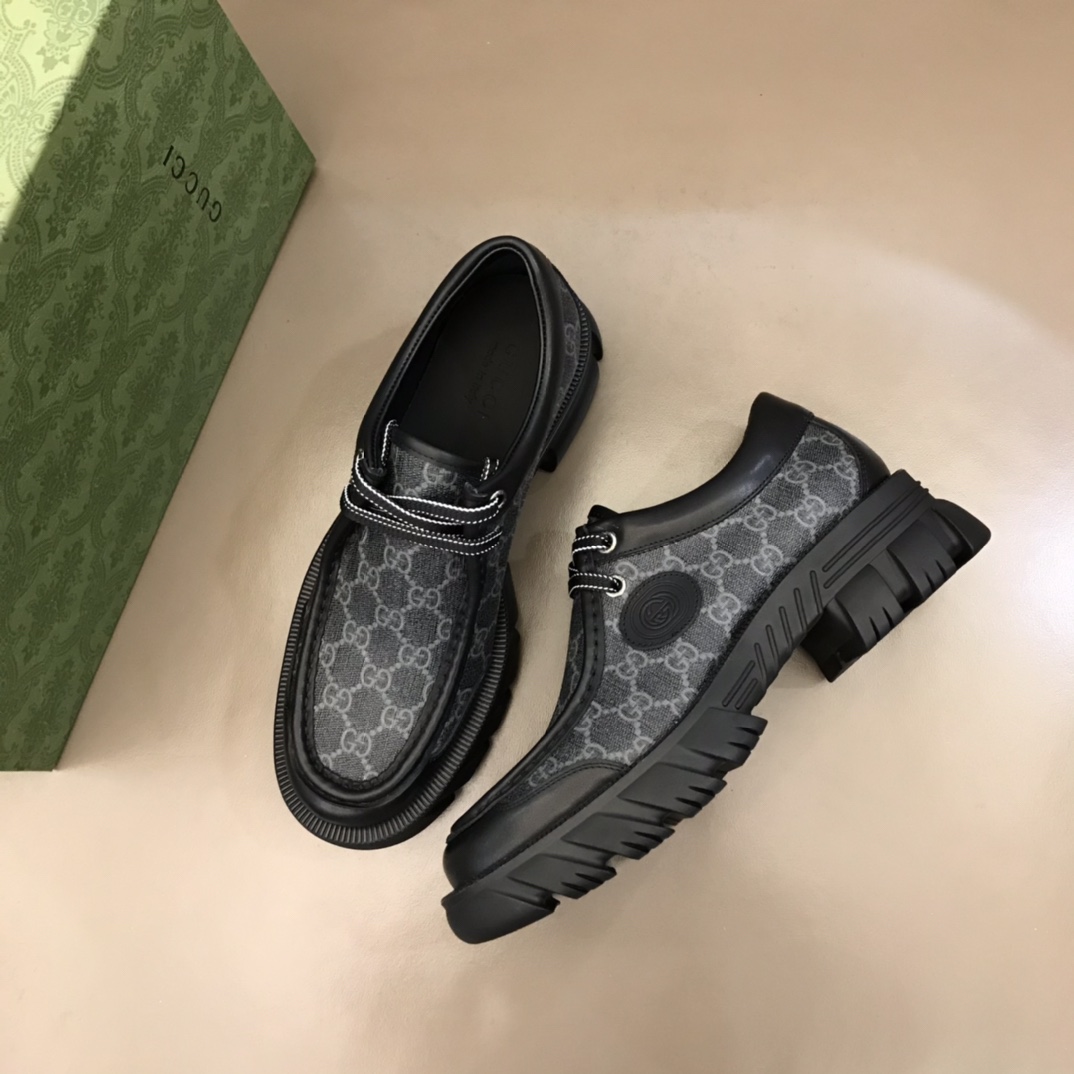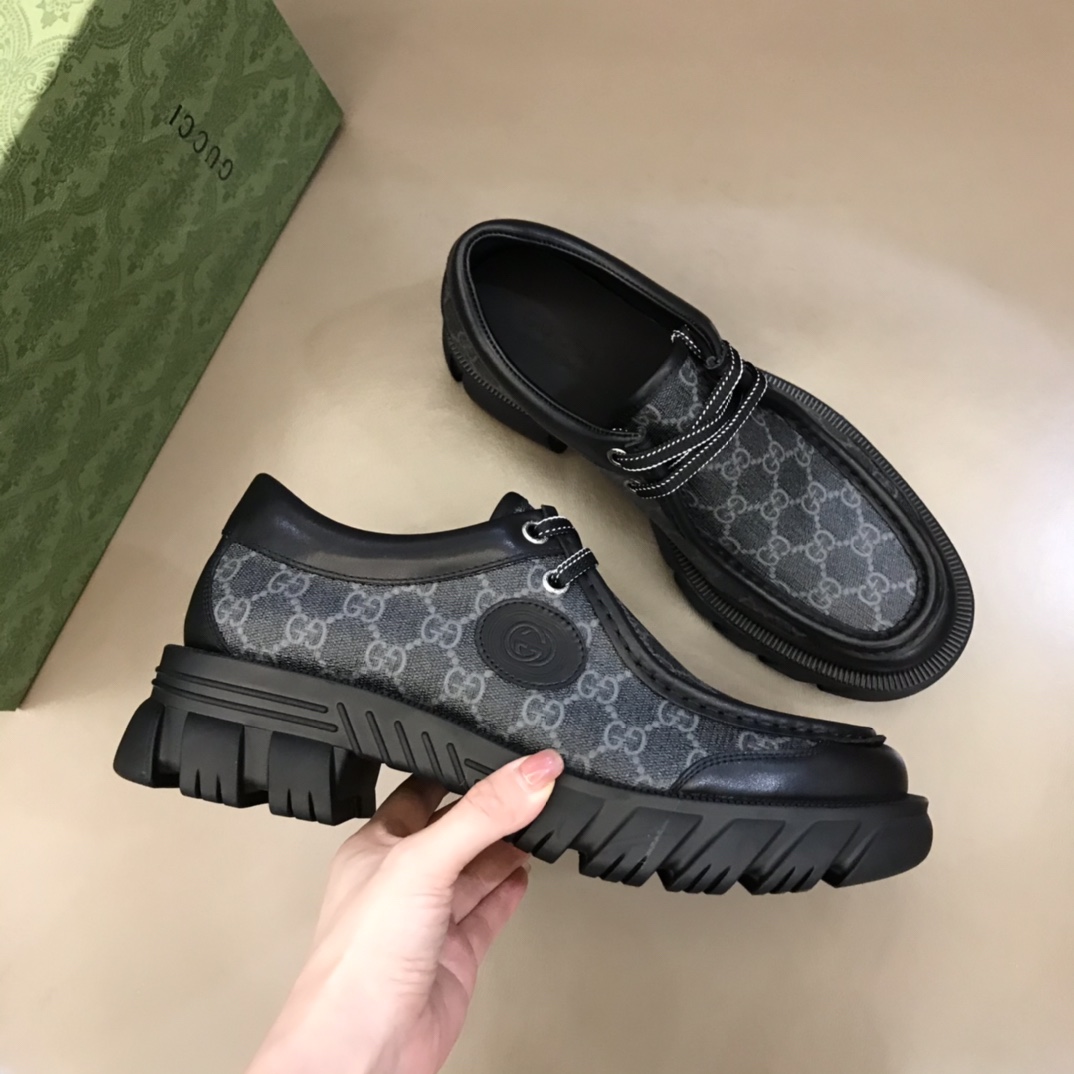 Top version Gucci 2021 autumn and winter men's black GG Supreme canvas double G loafer, thick sole, height increase, kills all general versions. If you need original high quality, please recognize our store. The retro style and classic details blend together, conveying the brand's love for trend elements from different eras. This lace-up shoe is made of black GG Supreme canvas, lined with calfskin, and meticulously decorated with an oval interlocking double G leather detail. The double G letter pattern has different interpretations in different periods, paying tribute to the brand founder Mr. Guccio Gucc*. The rubber grooved sole, every detail exudes elegance!