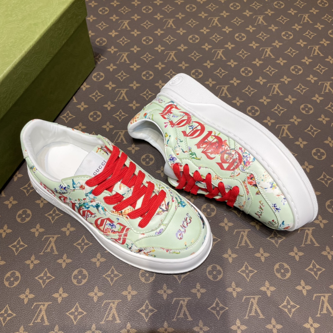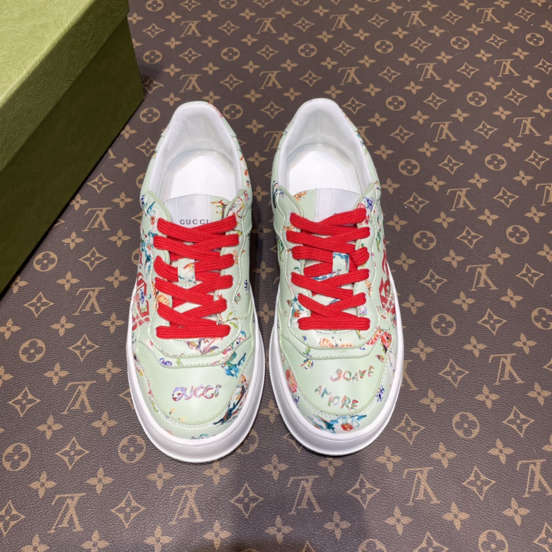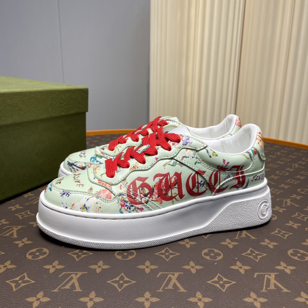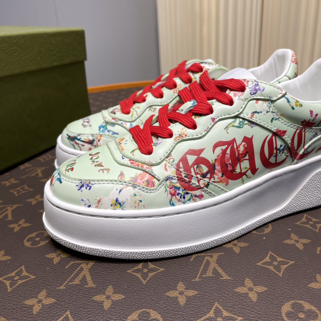Couple's G-family retro webbing sneakers The inspiration for the brand's classic webbing element comes from Gucci's equestrian origins. Each season, it is reinterpreted through various novel and unique designs and styles. It is presented on this leather sneaker with red and blue details, embodying the brand's advocated design philosophy that blends sport and leisure. The thick sole design gives the sneakers a retro feel.
