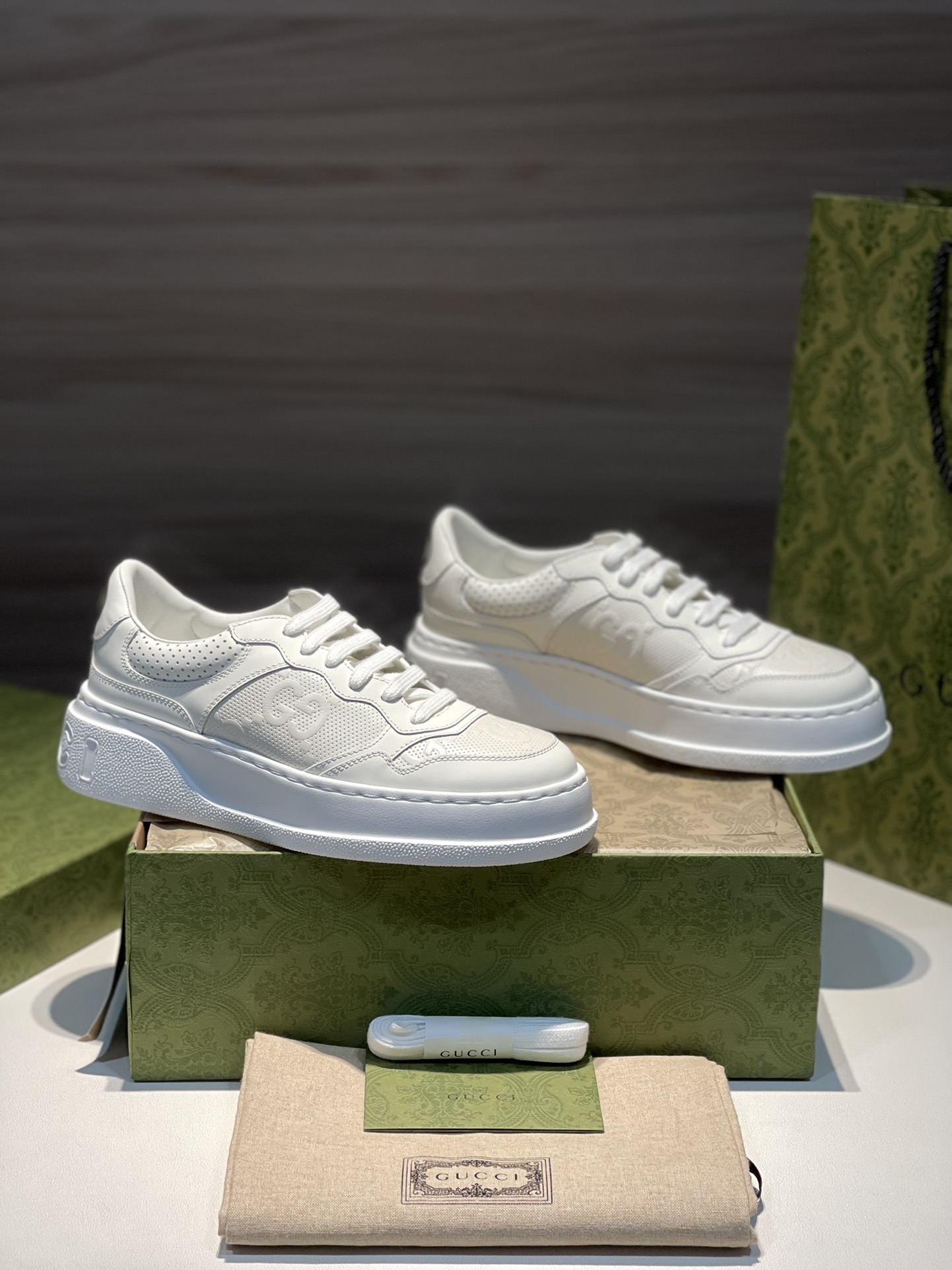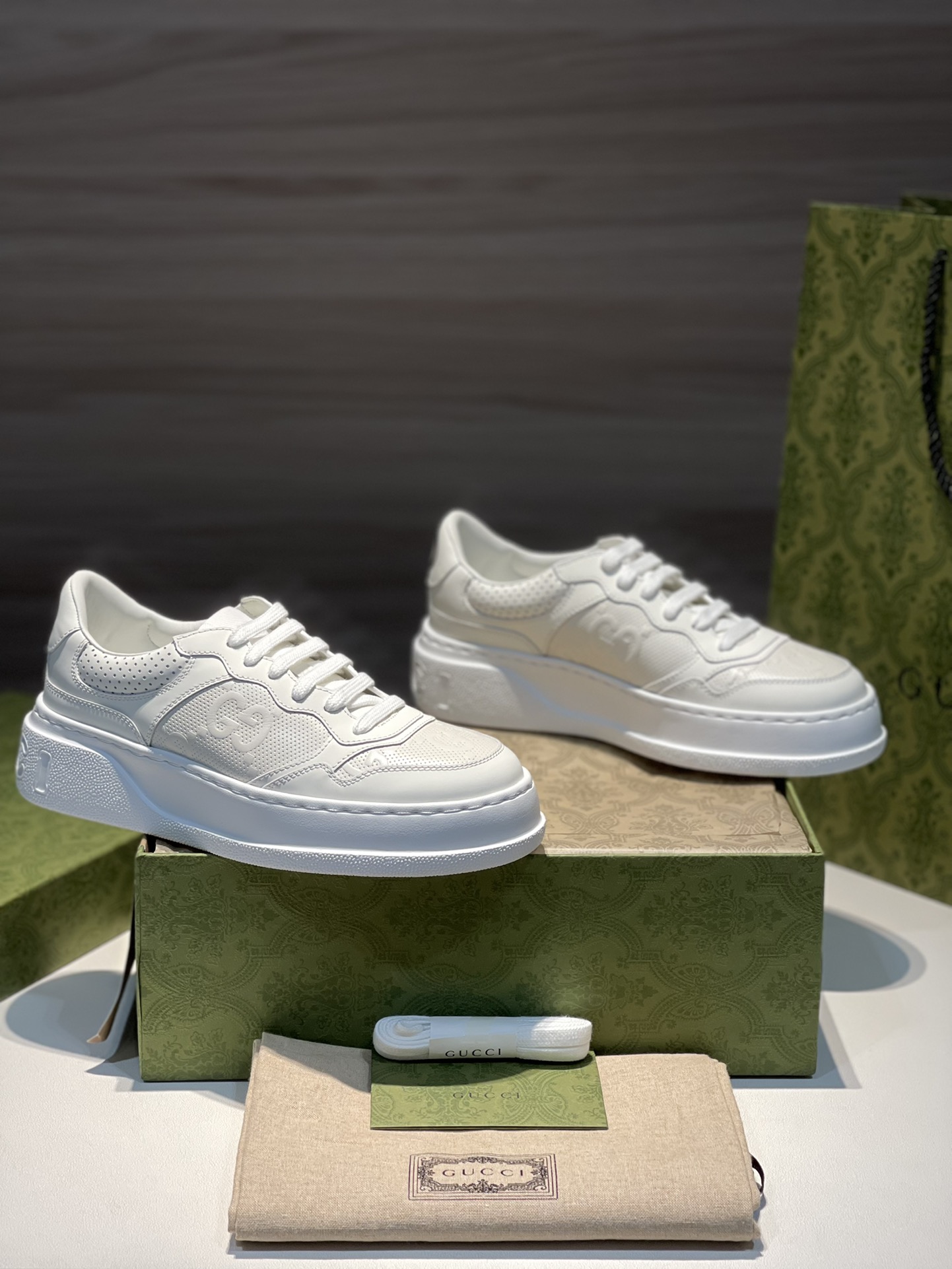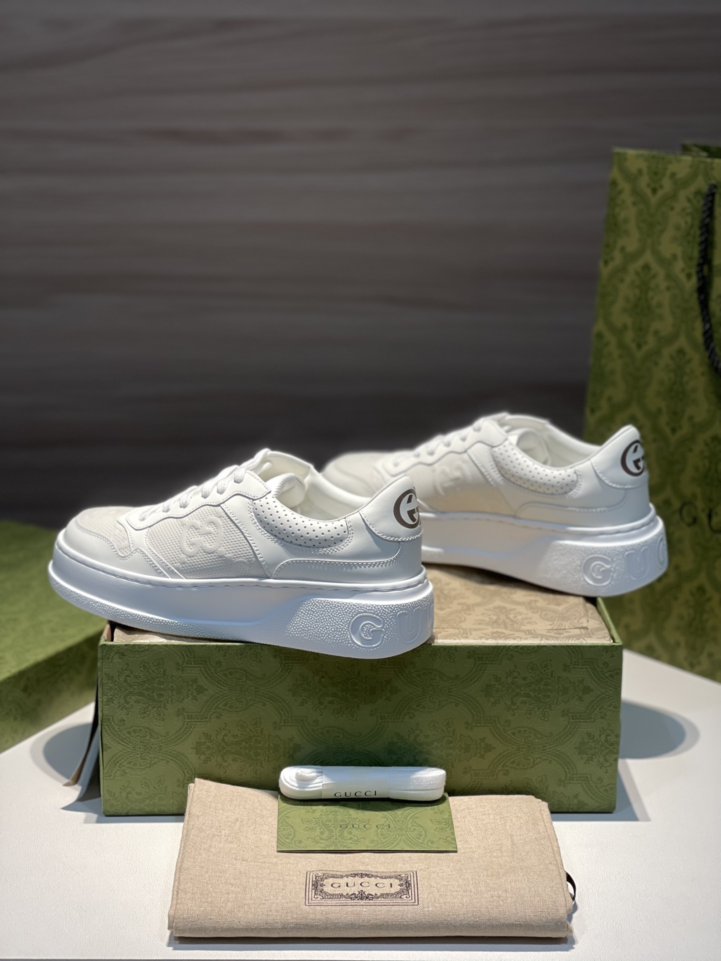 Gucci new men's shoes women's shoes men's women's white sneakers casual shoes purchasing level Gucci retro classic GG embossed Chunky B couple style height-increasing sneakers! Size: ♀ women's sizes 35, 36, 37, 38, 39, 40 / Size: ♂ men's sizes 39, 40, 41, 42, 43, 44, 45 Heel: 5cm (extremely height-increasing!) overseas customer-supplied YC imported cowhide + precision air pressure 3D GG embossed punching process + customer-supplied YC sheepskin lining, insole + YB consistent one-piece high-memory rebound private mold EVA insole + YC private mold thickened height-increasing TPU outsole