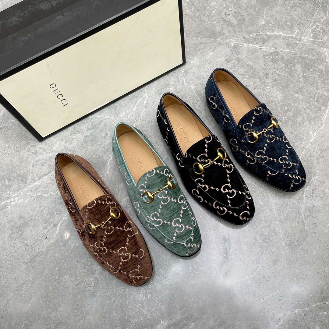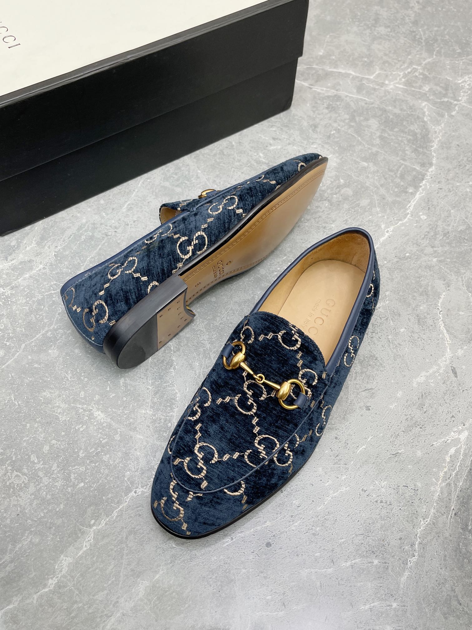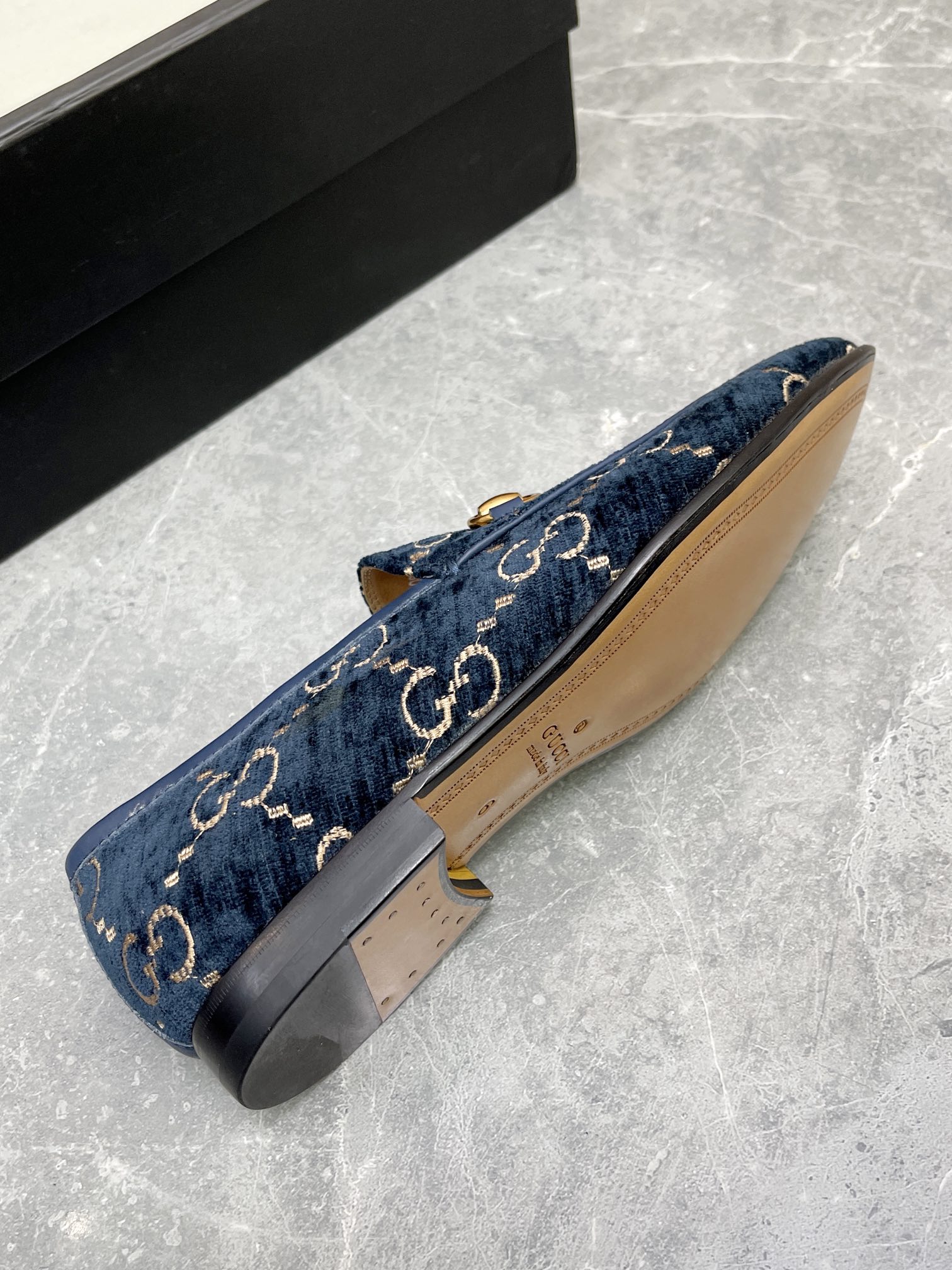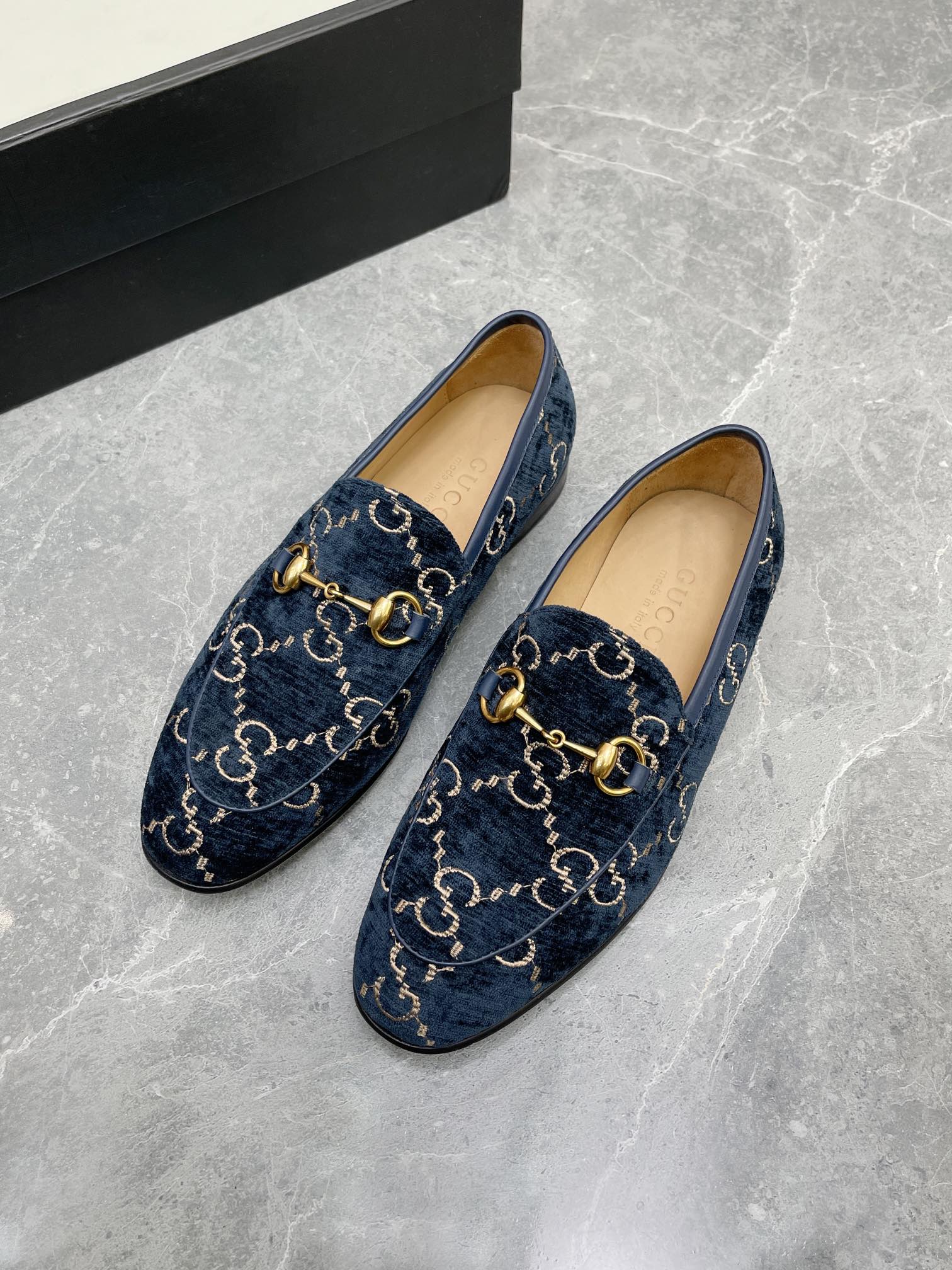 Official price RMB, 600 features a slender toe and minimalist silhouette, showcasing the exquisite craftsmanship of loafers and the brand's distinct fashion style. Since its debut in the 1950s, this classic design has continuously reinvented the classic academic style with new forms and materials. These shoes are meticulously crafted from GG velvet fabric inspired by archival designs, lined with natural calfskin, and feature Italian leather soles. Calfskin trim and horsebit buckle details add the perfect finishing touch. Marked shoe sizes: 38–44 (45 can be custom-made).
