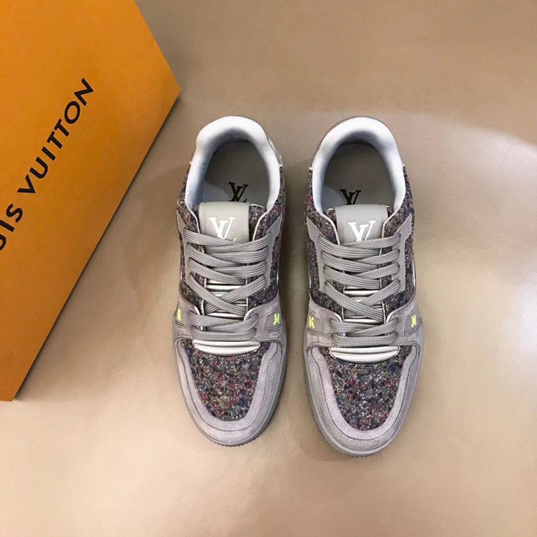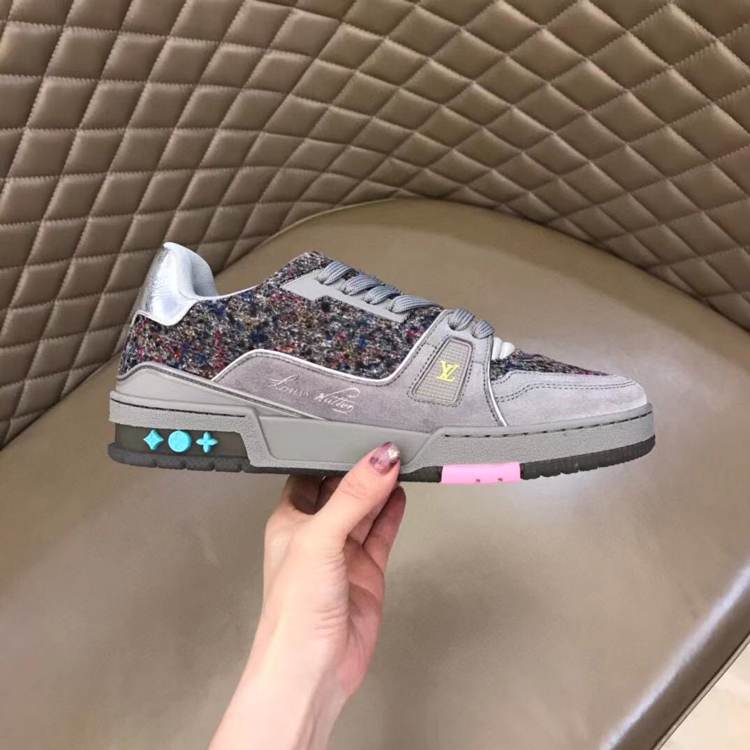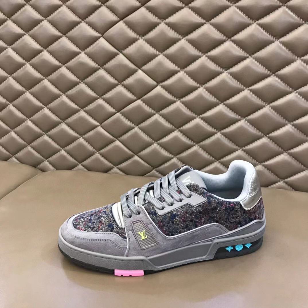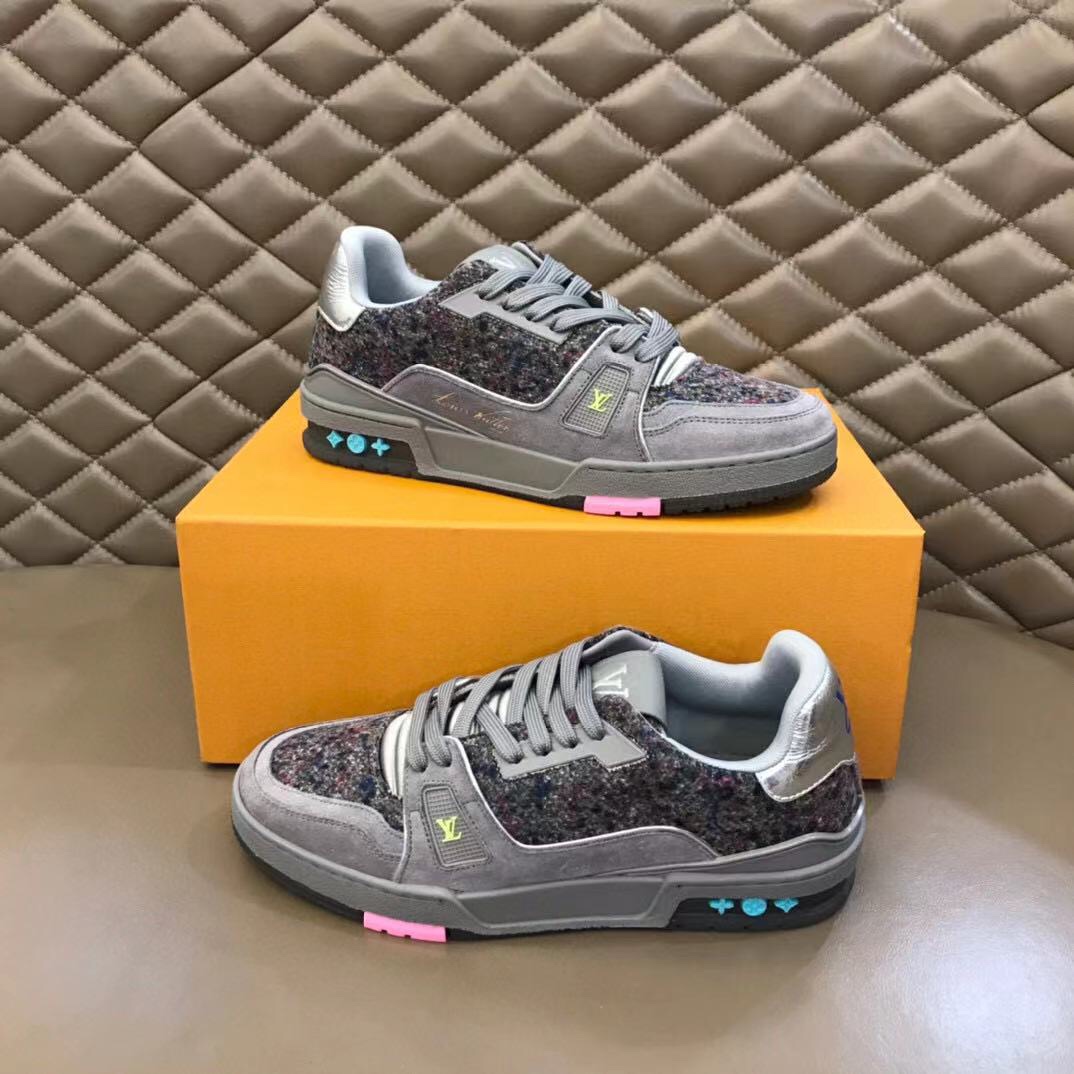 L 2021 New Men's Trainer Sneakers, made from calfskin suede and felt, highlight the new season's material concept. Rubber elements inject bright colors, and metallic leather trims adorn the back. Handwritten annotations indicate the shoe's construction, and clear stitching can be cut by customers to complete the design, showcasing exquisite craftsmanship throughout. The technological rubber outsole is equipped with an innovative gel insole, providing outstanding comfort. The outsole is decorated with Monogram Flowers pattern. A classic basketball shoe style, highly eye-catching, easy to match, and offering breathable comfort when worn! Sizes: 38-45
