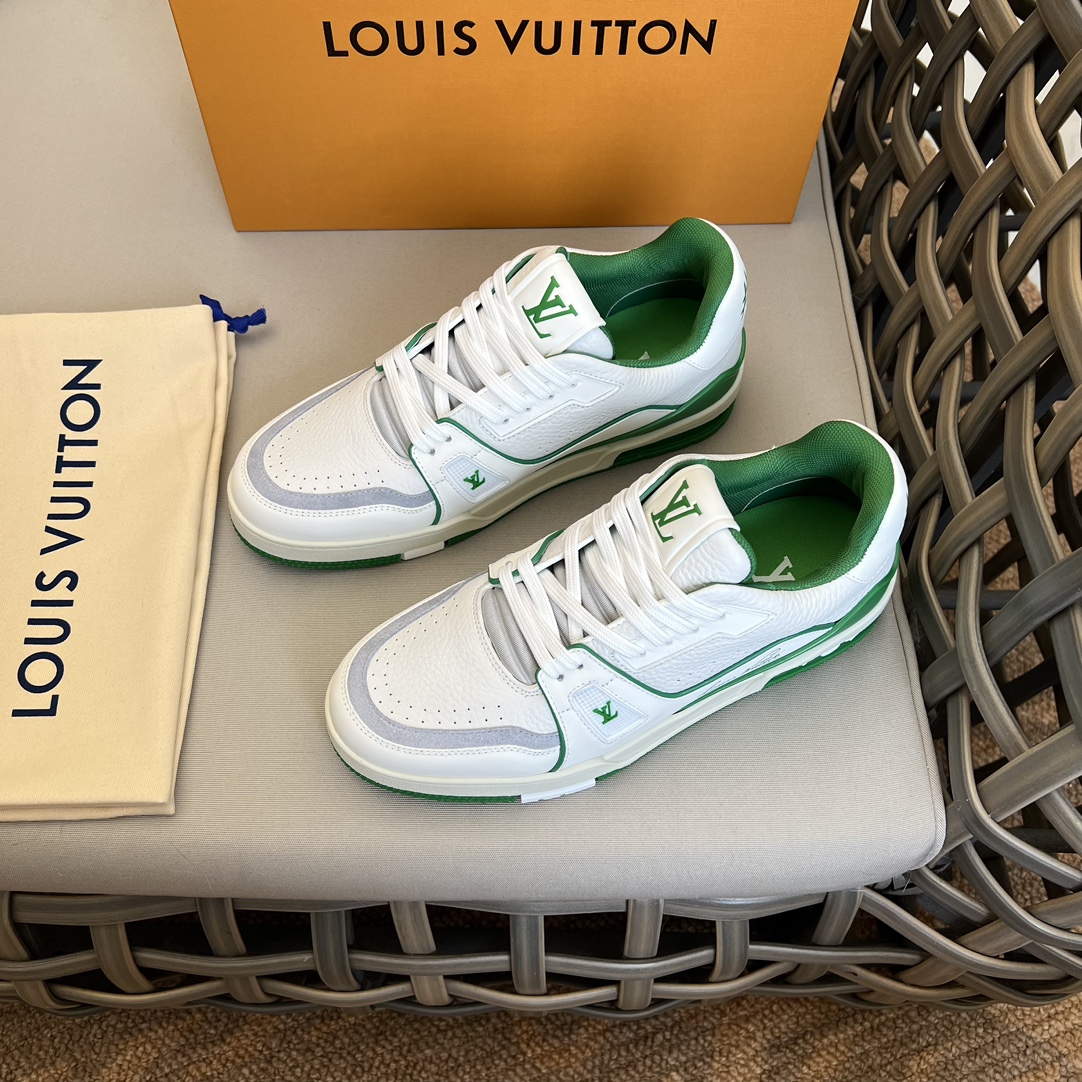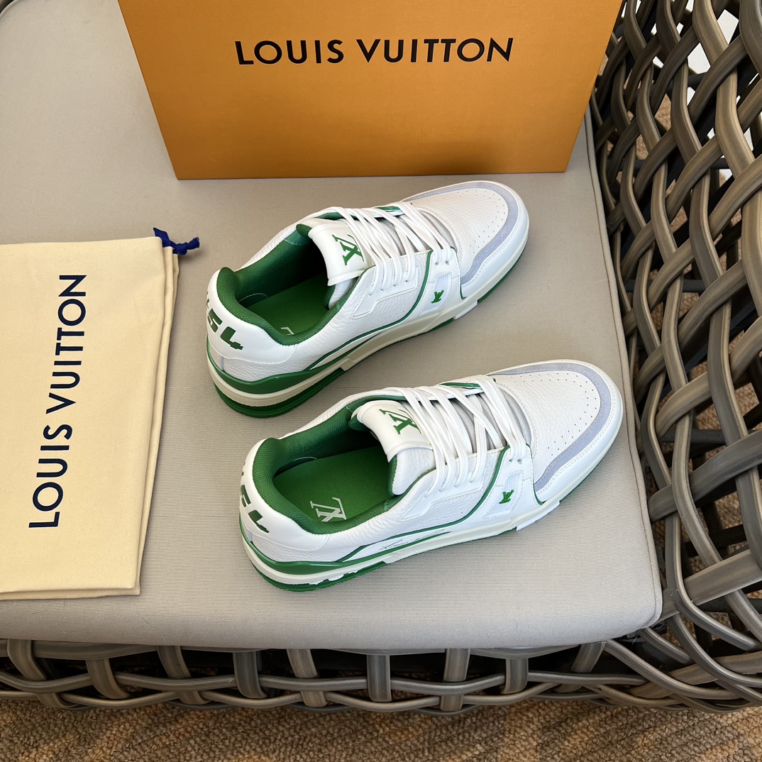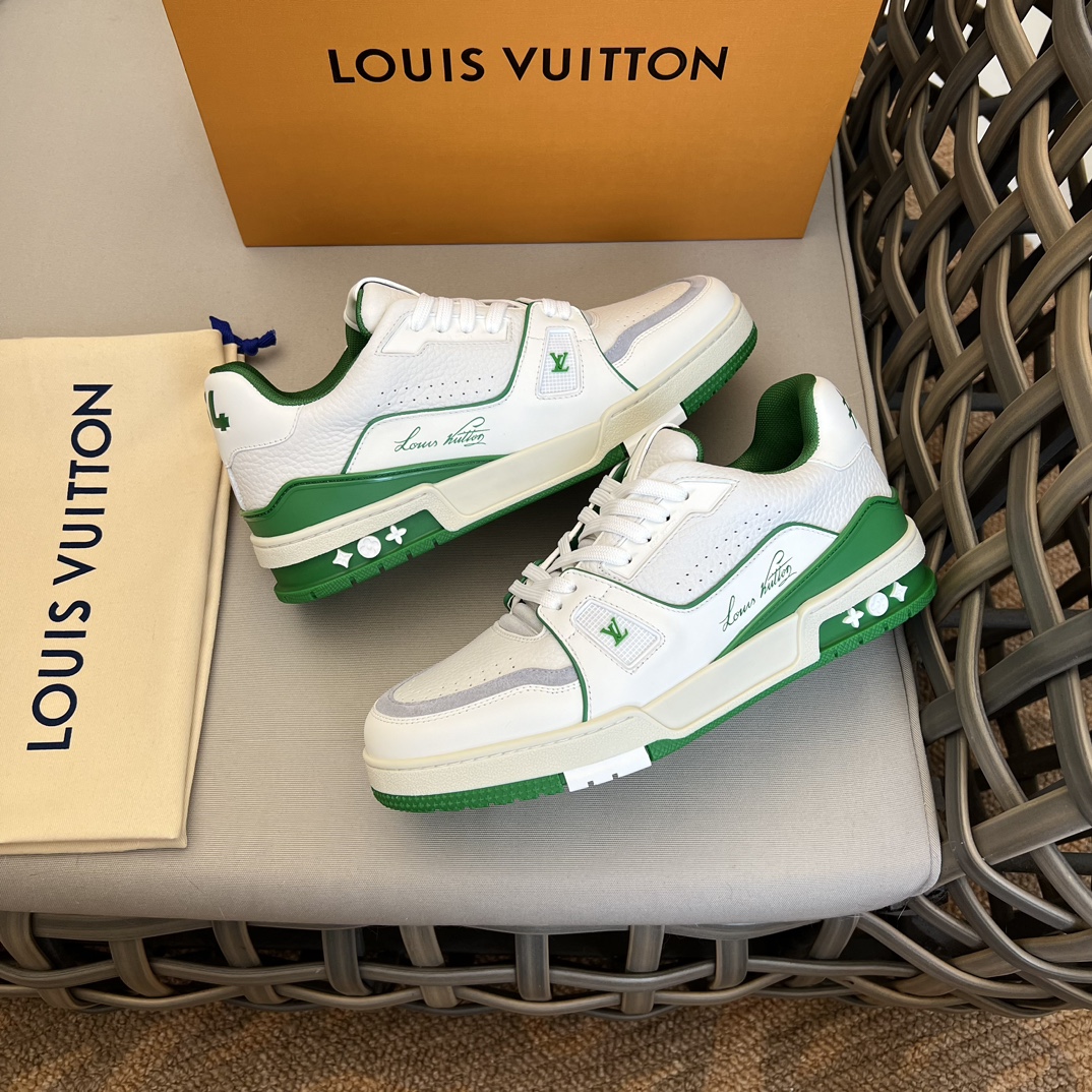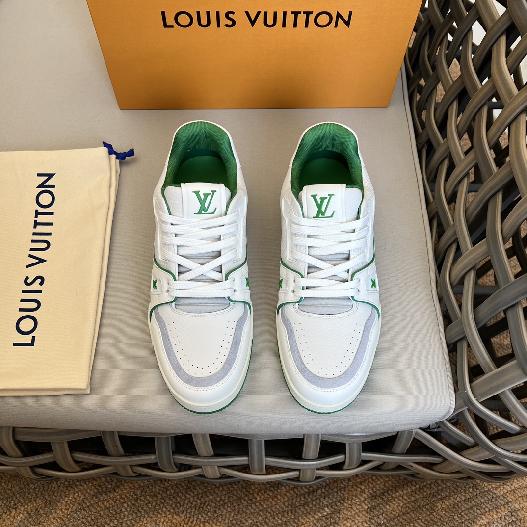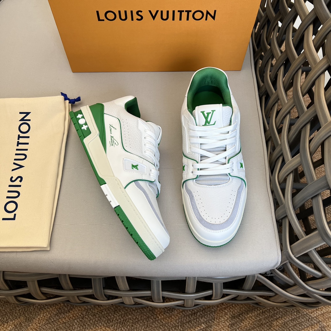 New Colorway LV TRAINER Sneakers|Virgil Abloh draws inspiration from retro basketball shoes|Creating the highly sought-after LV Trainer sneakers|This style features grained calfskin embossed with the iconic Monogram pattern|Combined with smooth calfskin to achieve a new classic design|Adorned with LV letters on the tongue and Vuitton branding on the side, continuing the iconic elements|Monogram flowers bloom on the molded rubber outsole|Tongue features LV letters|Side features Vuitton branding|Comes standard with memory foam insoles|Very comfortable to wear