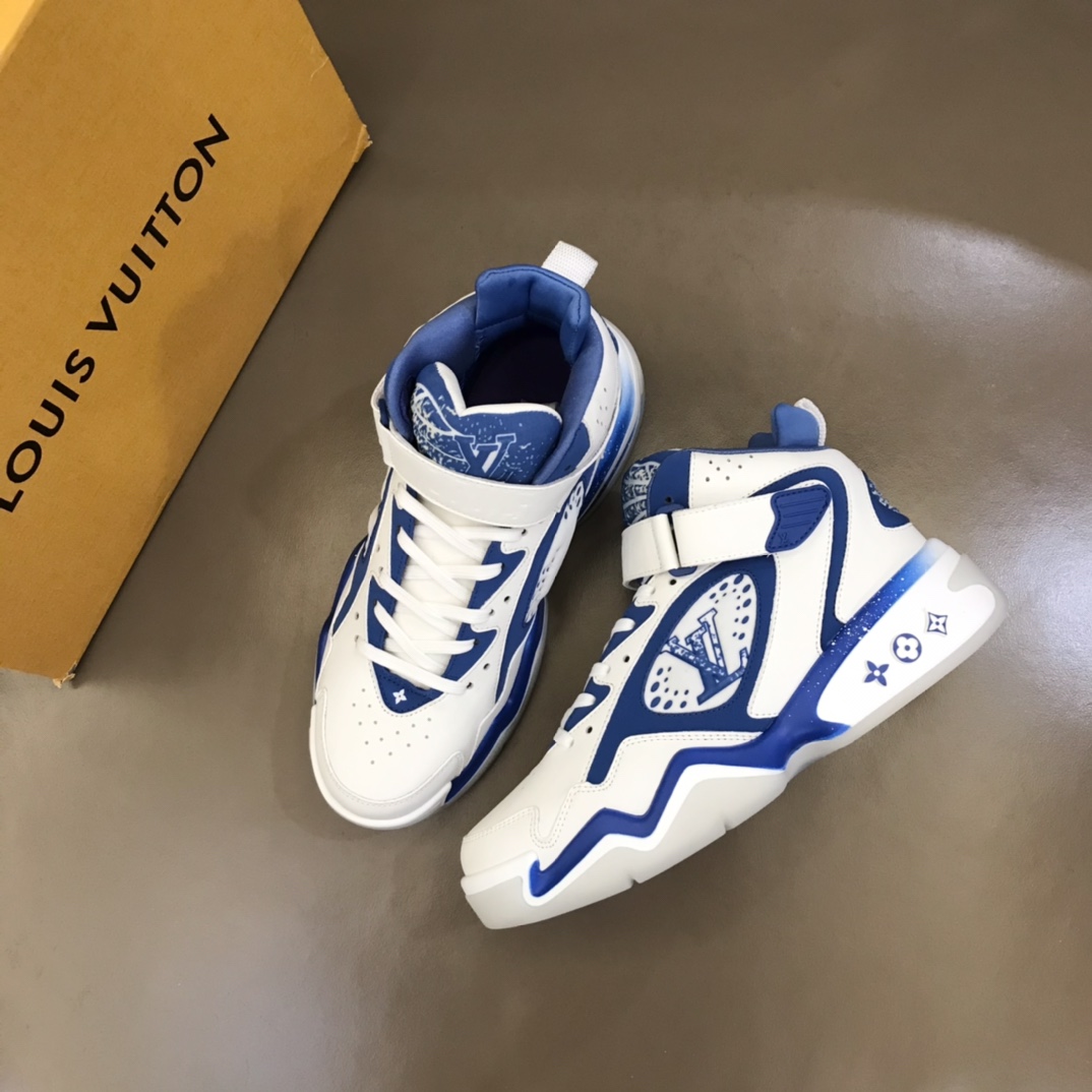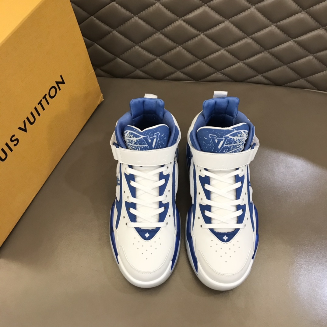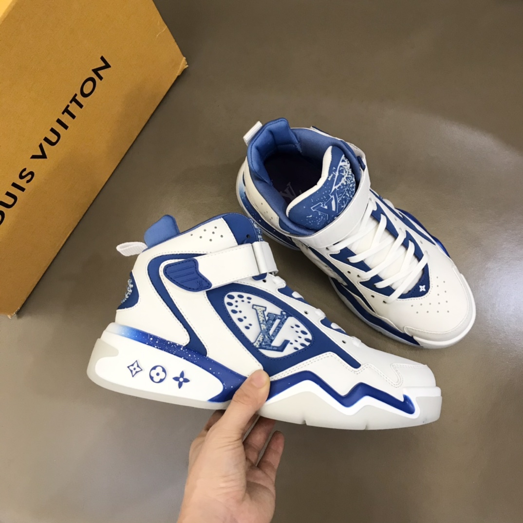 L* Trainer 2 New autumn-winter men's high-top sneakers, surprisingly debuted at the Louis 2022 autumn-winter show. Leather upper with padded collar, continuing Virgil Abloh's initial design based on retro basketball shoes. L* basketball logo adorns the tongue, while Loui* and Vuitto* logos are respectively marked on the Velcro straps, releasing dynamic energy whether open or closed. Size: 38-46
