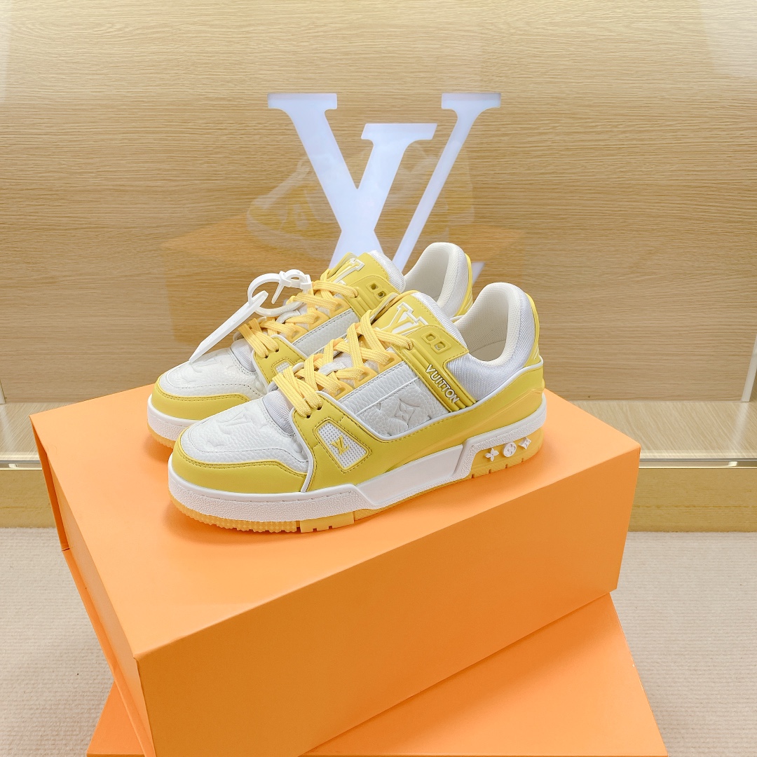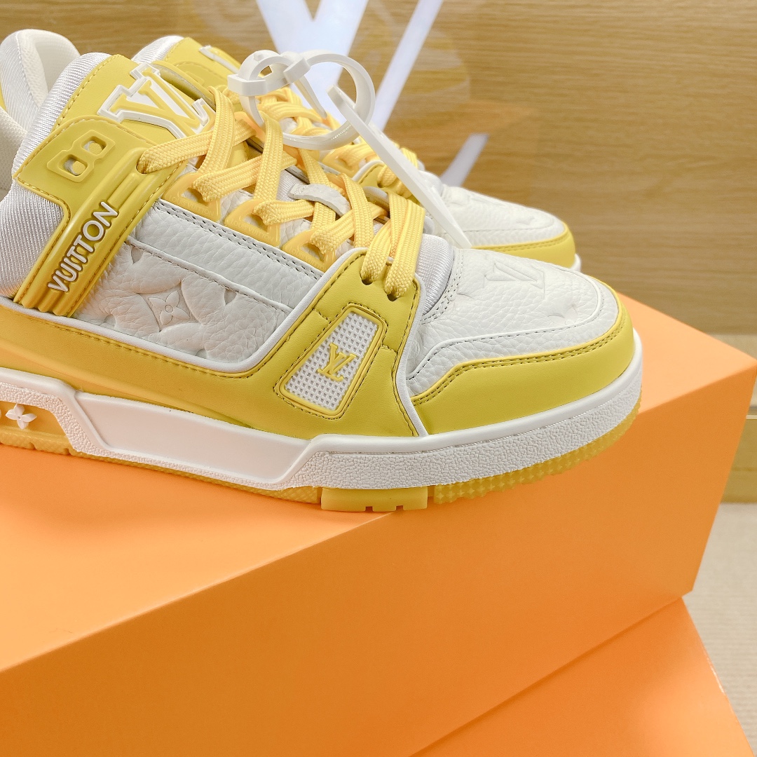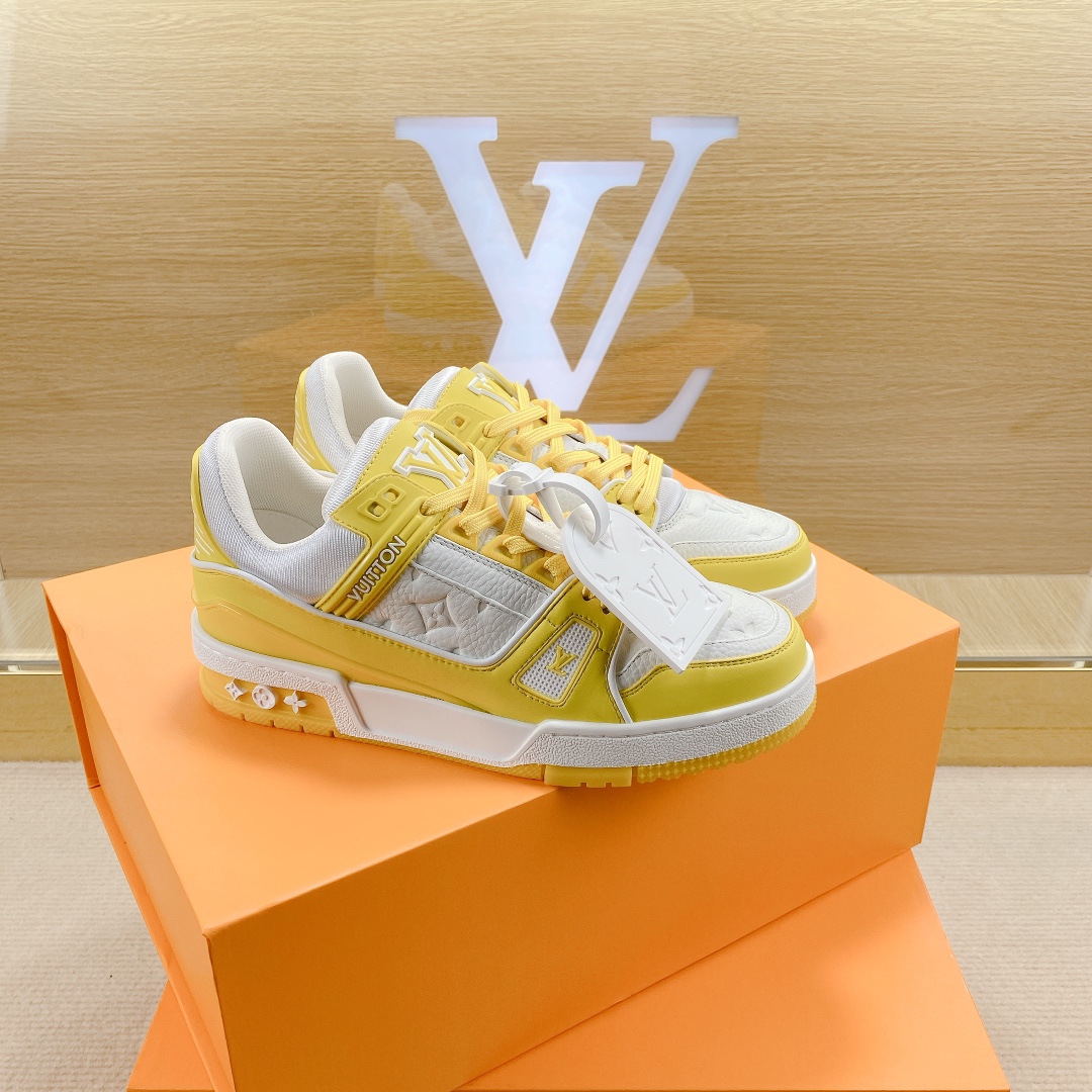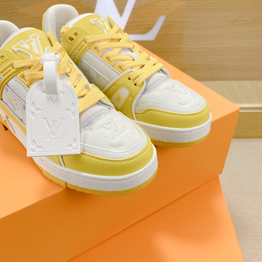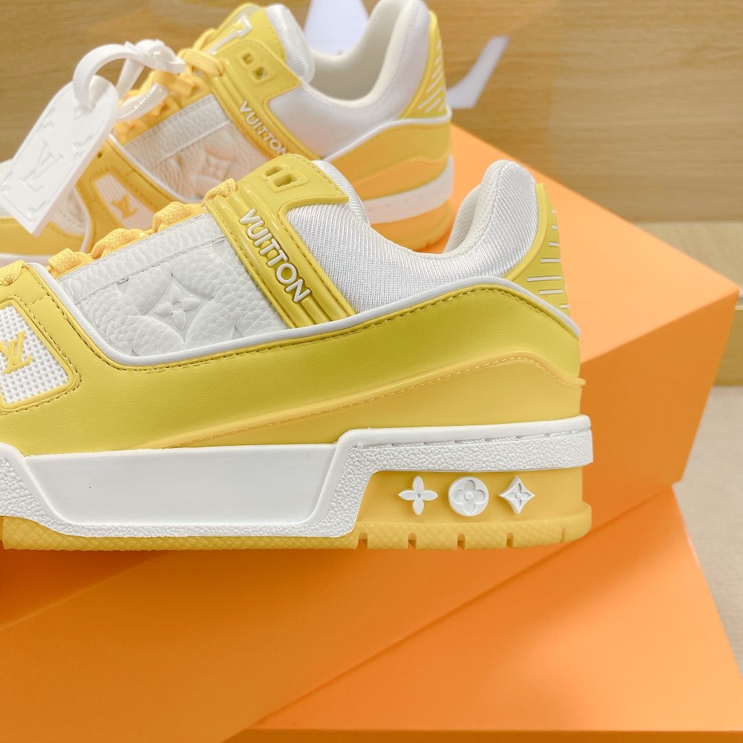 Virgil Abloh style number 1AA6Y8 draws inspiration from retro basketball shoes, creating the highly sought-after LV Trainer sneakers. This shoe features grained calfskin embossed with the iconic Monogram pattern and smooth calfskin, together achieving a new classic design.