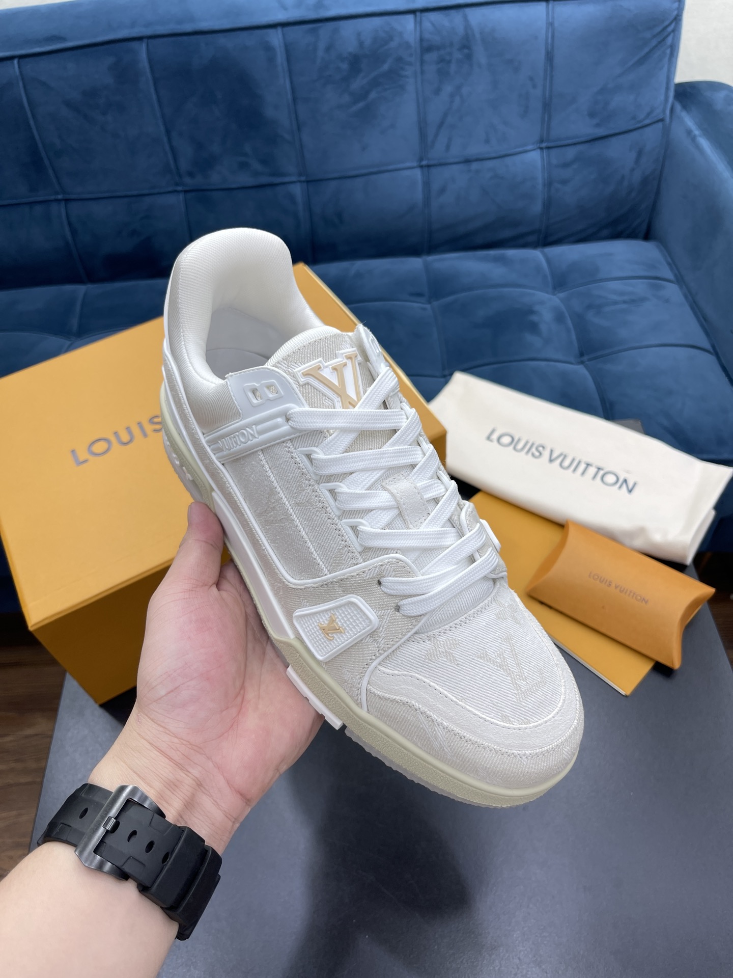 Rubber outsole. Tongue, sides, and back adorned with LV letters. Sides feature the Vuitton logo.