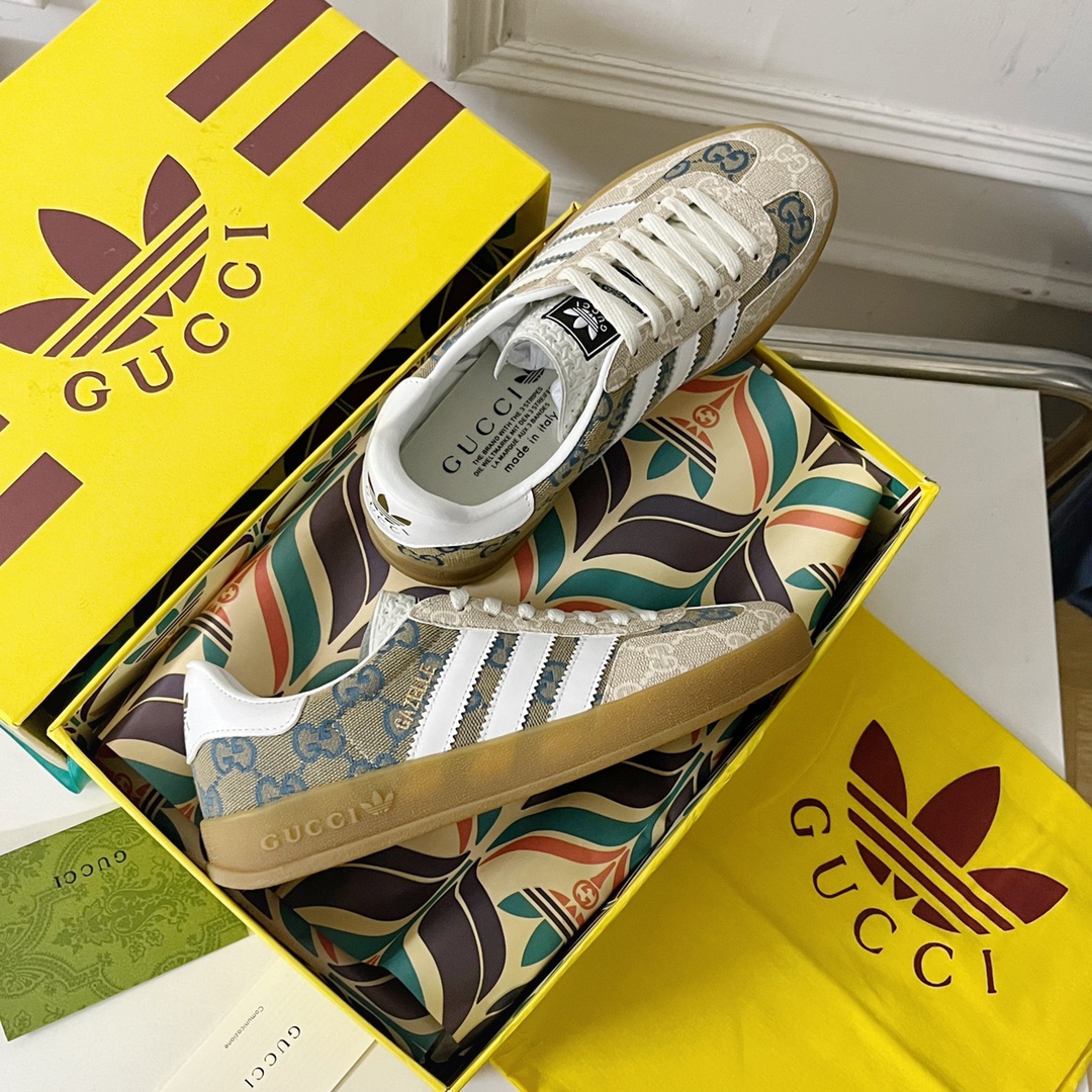Original purchase development production Adidas x Gucci century collaboration hit combines the rich and long-standing archival elements of both brands. The adidas x Guzzi collaboration series inherits the brand history and iconic design language through the combination of three stripes. Creative Director Alessandro Michele draws inspiration from fond memories of the 80s and 90s, creating an outstanding series that blends nostalgic style with modern气质. This Gazelle sneaker features Trefoil print and clover stripe.