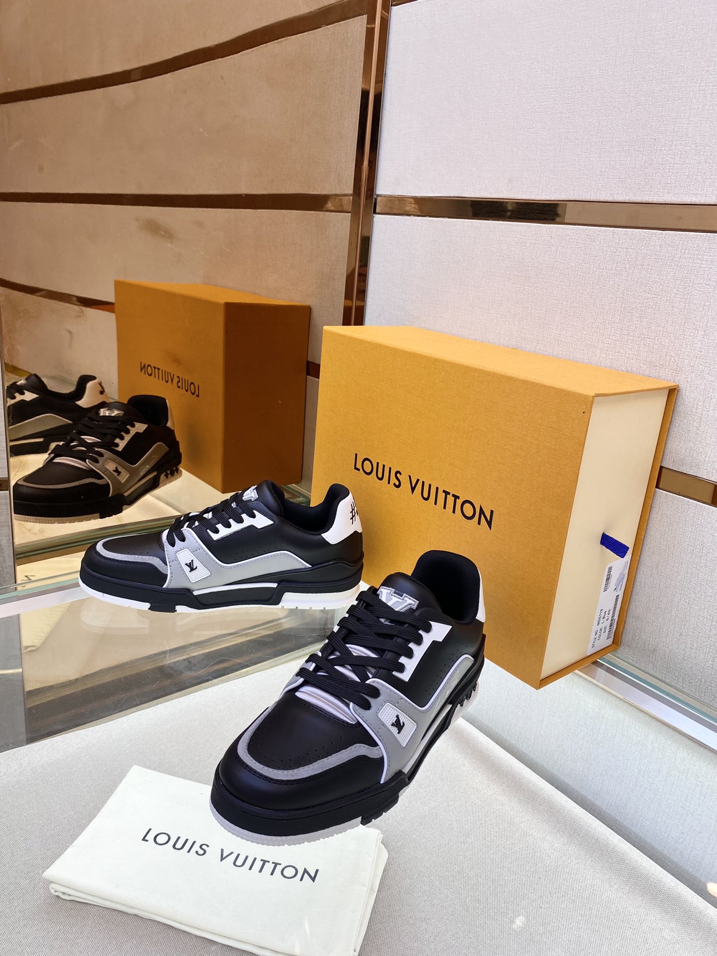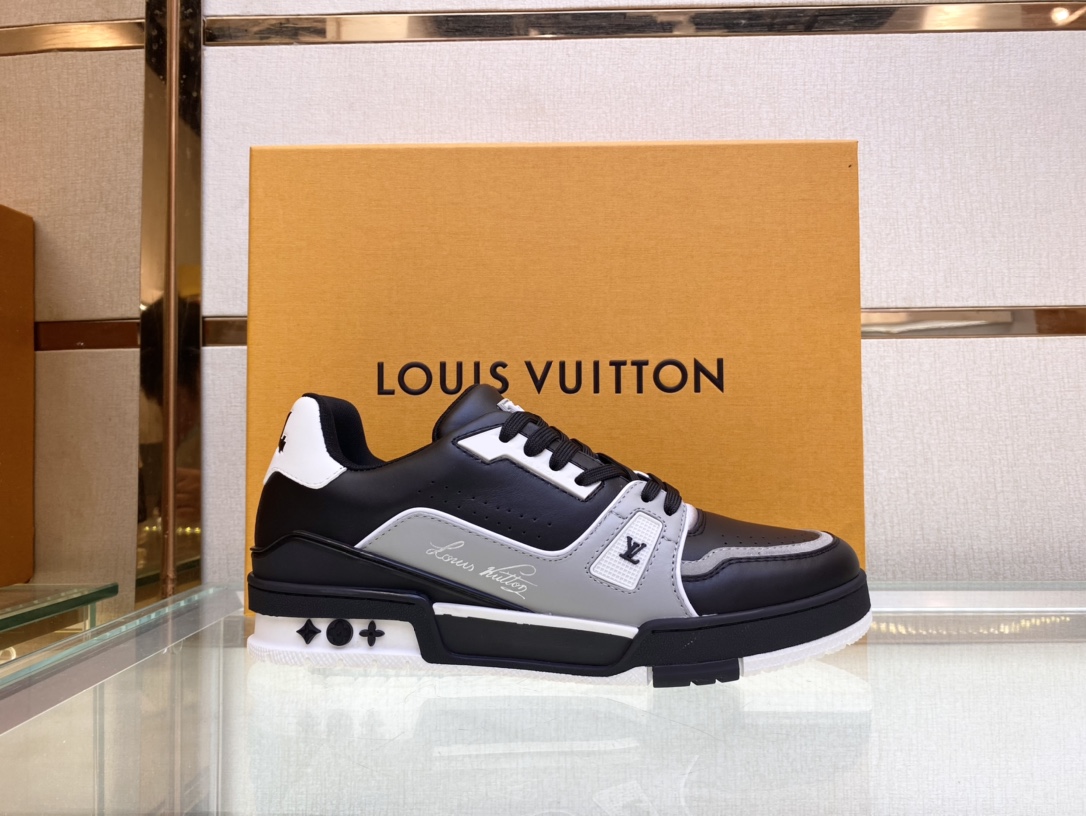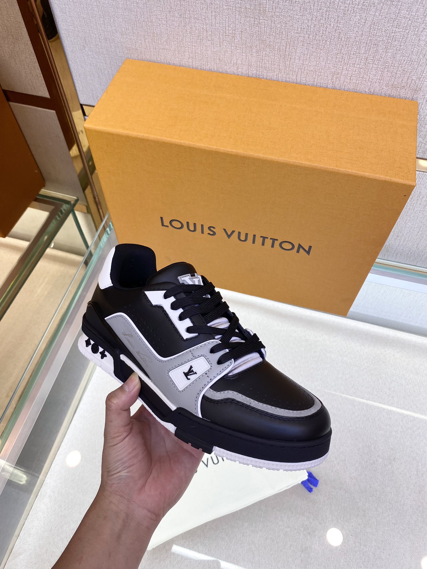 LOUIS VUITTON* 2022 New Men's Trainer Sneakers, crafted from top-grain leather, highlighting the new season's material concept. Rubber elements are infused with bright colors, and handwritten annotations indicate the shoe's construction. Clear stitching can be cut by customers to complete the design, showcasing exquisite craftsmanship throughout. The technical rubber outsole is equipped with an innovative gel insole for superior comfort. The outsole is adorned with Monogram Flowers pattern. A classic basketball shoe style with high appeal, easy to pair, breathable and comfortable on the feet! Size: 38-44 (45 custom-made)