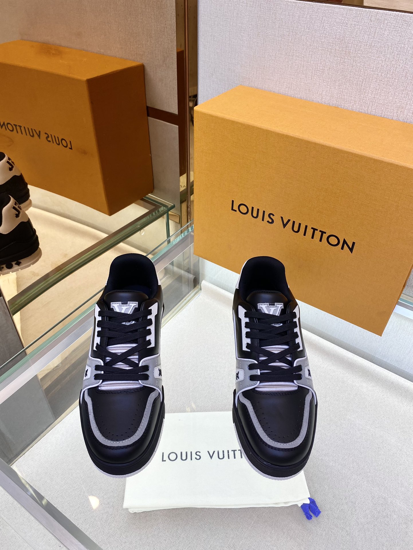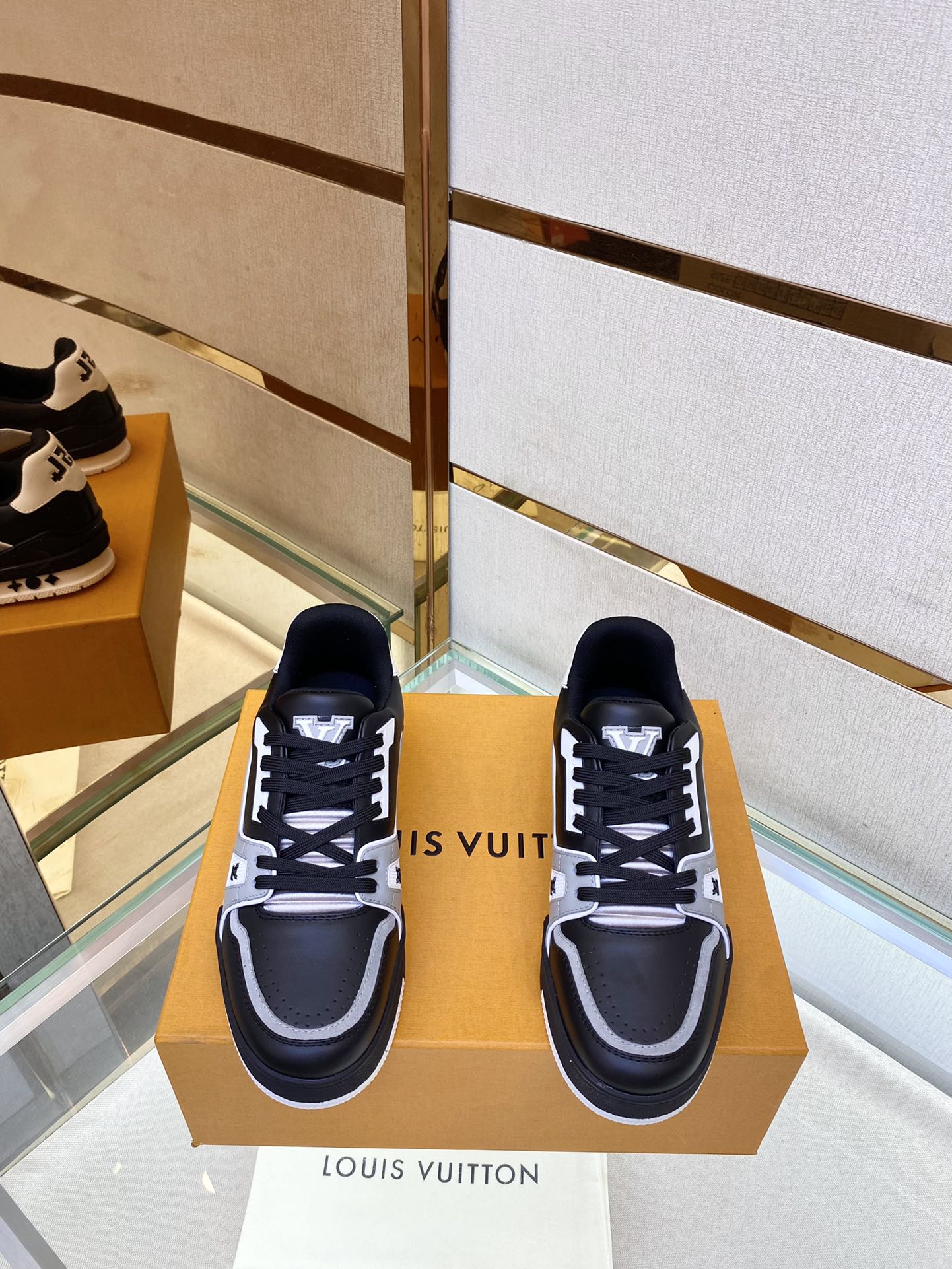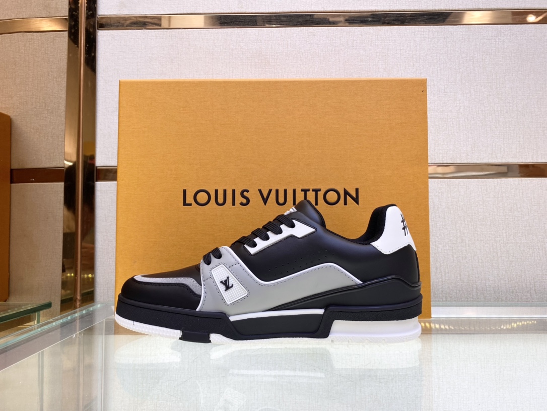 LOUIS VUITTON* 2022 New Men's Trainer Sneakers, crafted from top-grain leather, highlighting the new season's material concept. Rubber elements are infused with bright colors, and handwritten annotations indicate the shoe's construction. Clear stitching can be cut by customers to complete the design, showcasing exquisite craftsmanship throughout. The technical rubber outsole is equipped with an innovative gel insole for superior comfort. The outsole is adorned with Monogram Flowers pattern. A classic basketball shoe style with high appeal, easy to pair, breathable and comfortable on the feet! Size: 38-44 (45 custom-made)