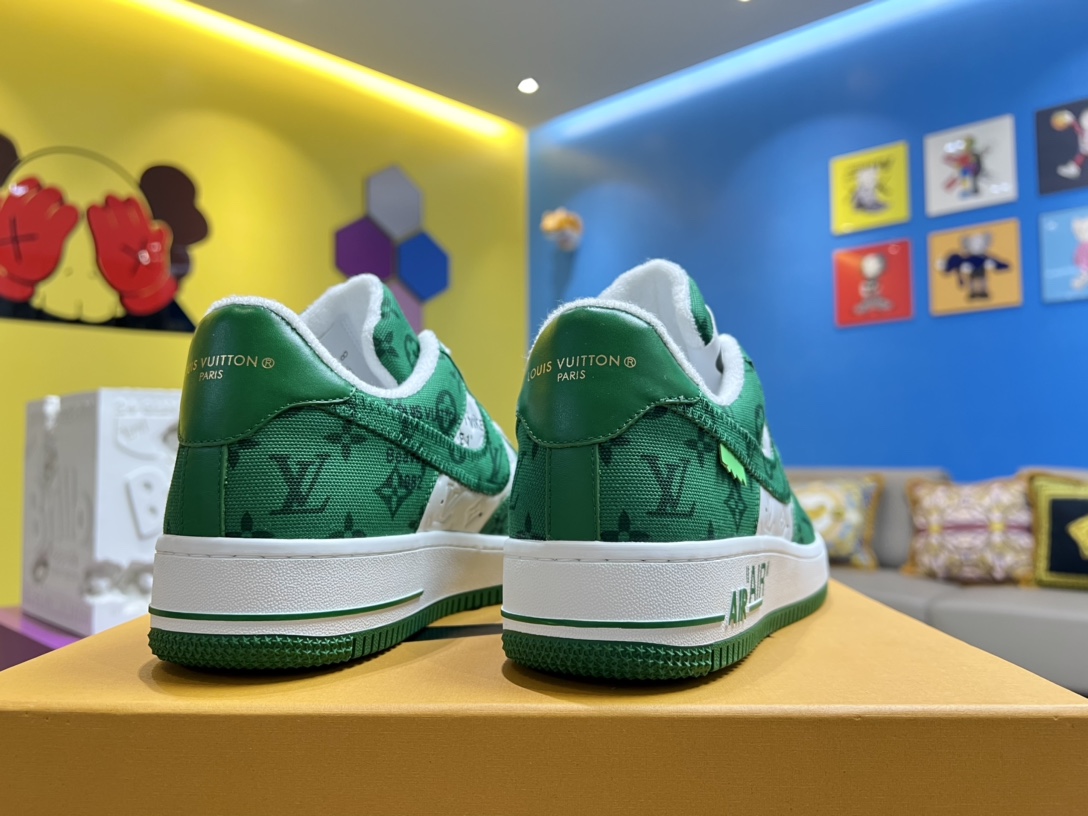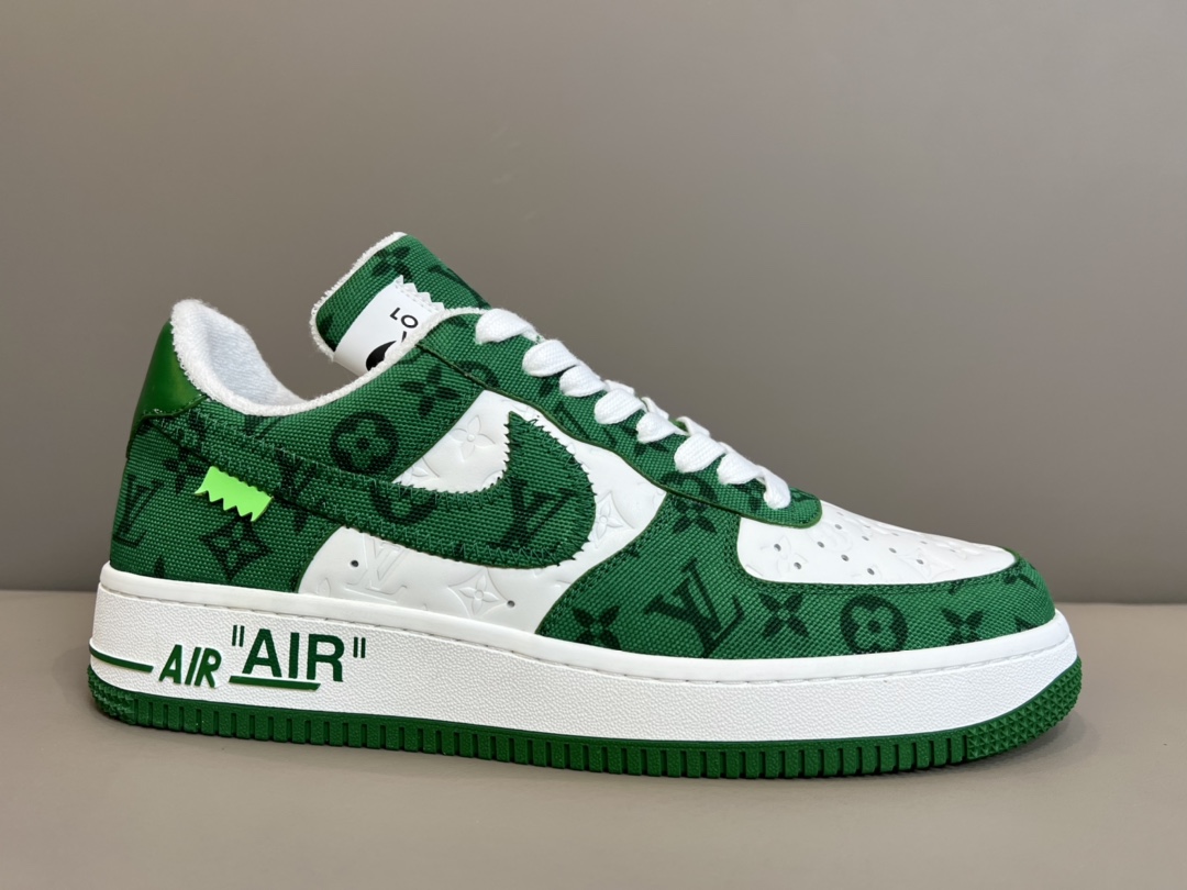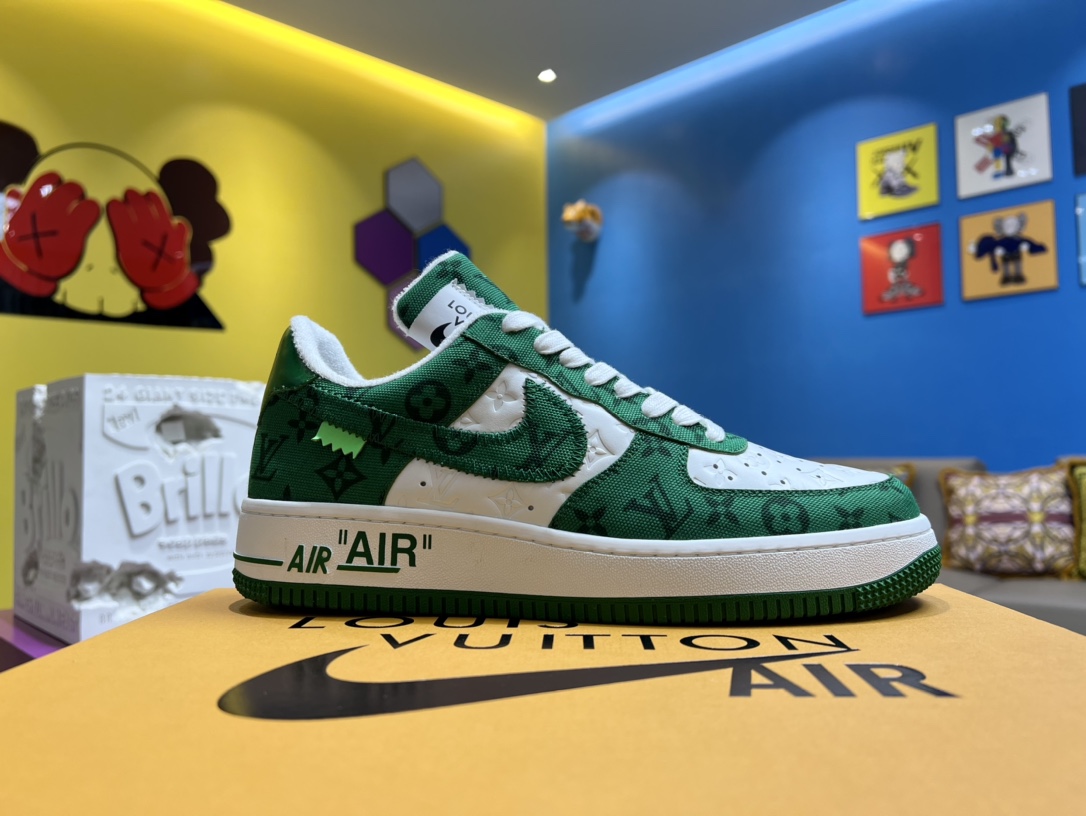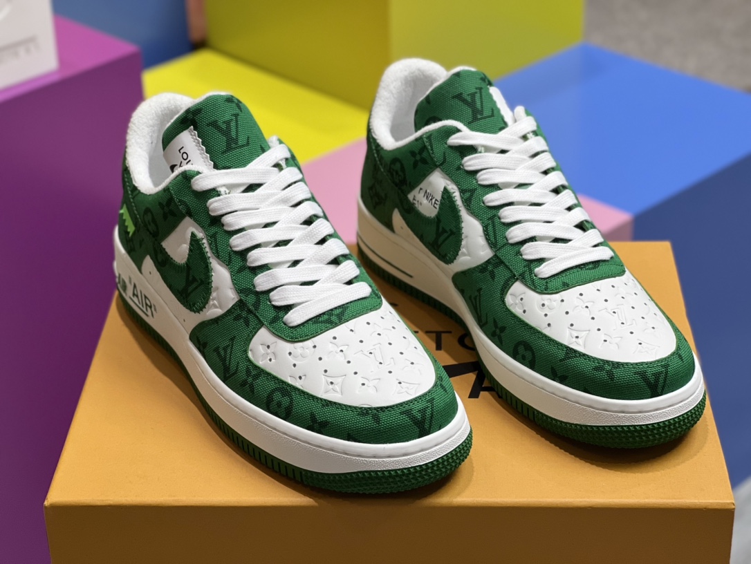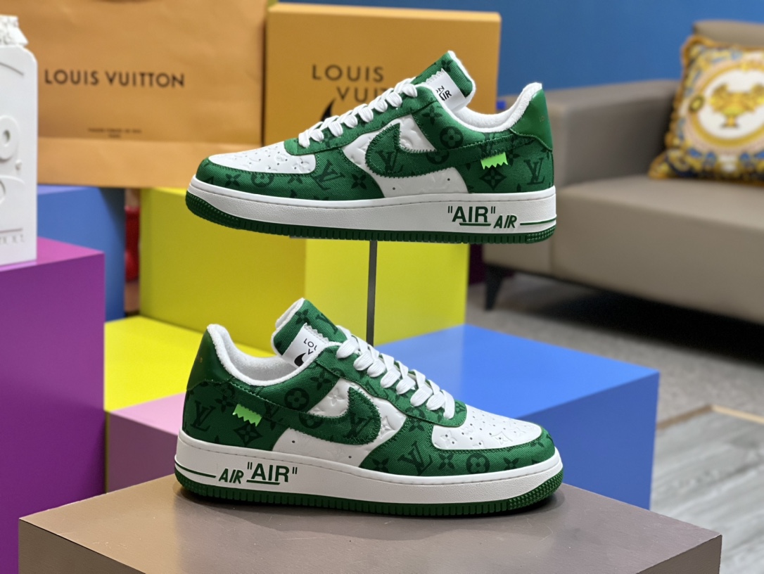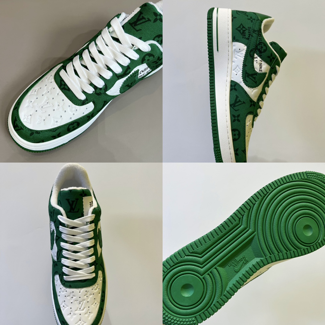 TRAINER x Nike Air Force 1 Collaboration Sneakers, Made from white calfskin with green Monogram pattern and white laces, black and white拼接 upper, tongue adorned with LV x Nike lettering, side features ", ☑️" text, green outsole with AIR logo, white and green sole sneakers.