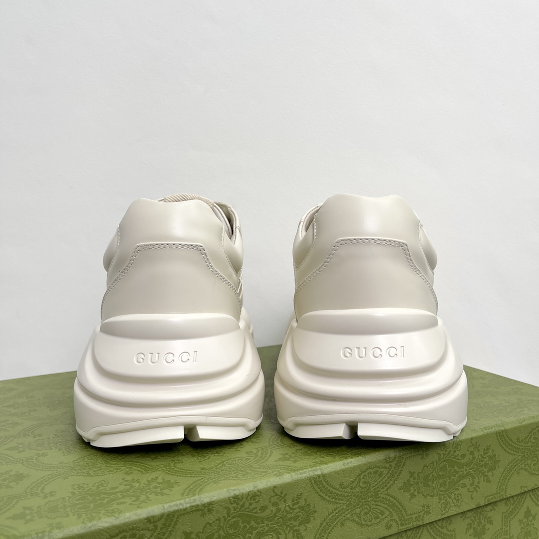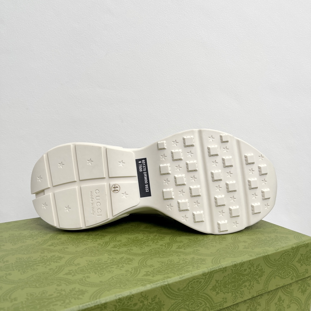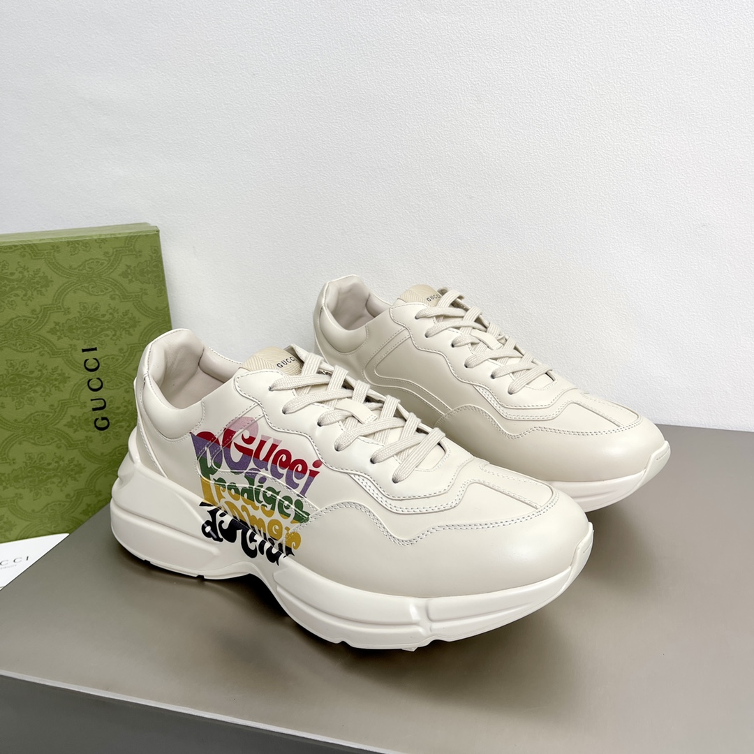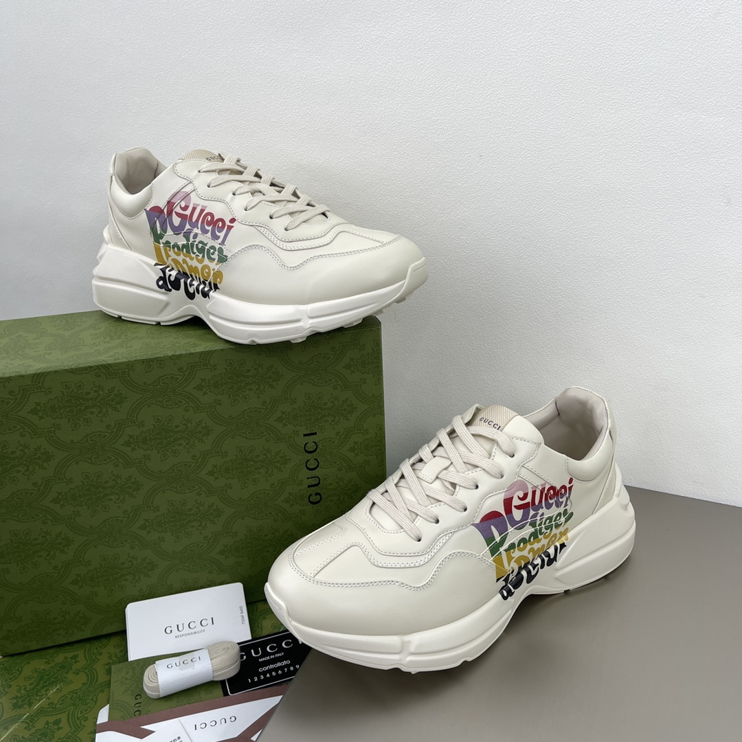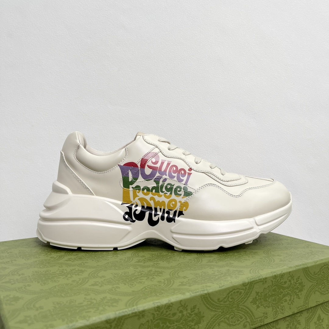 The work of cartoonist and illustrator Pablo Delcielo, based in Chile, adds a touch of playful color to the Gucci "March of Love" fashion collection. Vibrant mystical creatures and whimsical fruit characters, through bright and lively appliqués or prints, bring a fantastical romantic flair to ready-to-wear and accessory designs. The exquisite patterns on this Rhyton series sneaker are full of fun. This sneaker is crafted from ivory-white leather for an eye-catching style, featuring a thick sole and robust structure, with "GUCCIPRODIGED'AMOUR" color-blocked letters on both sides, and comes with full packaging!