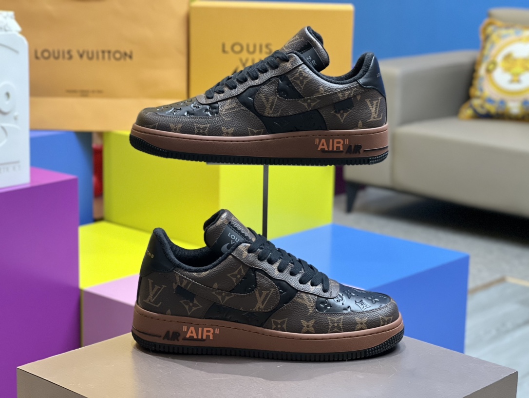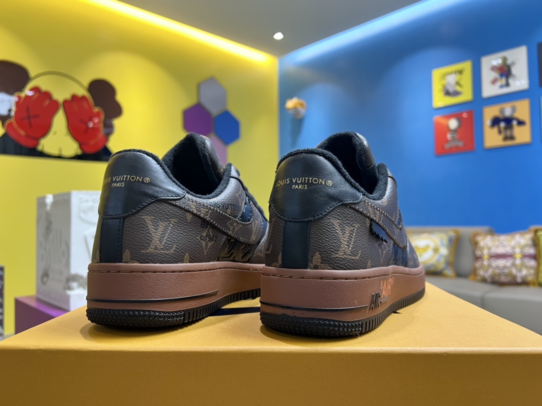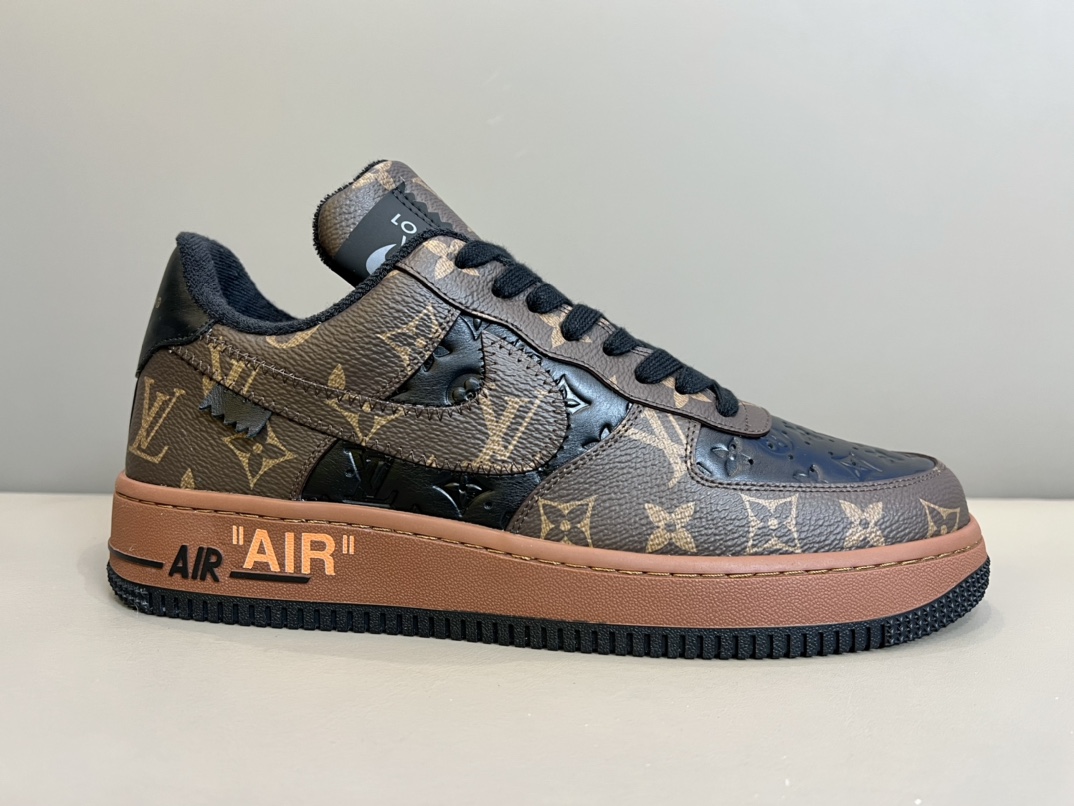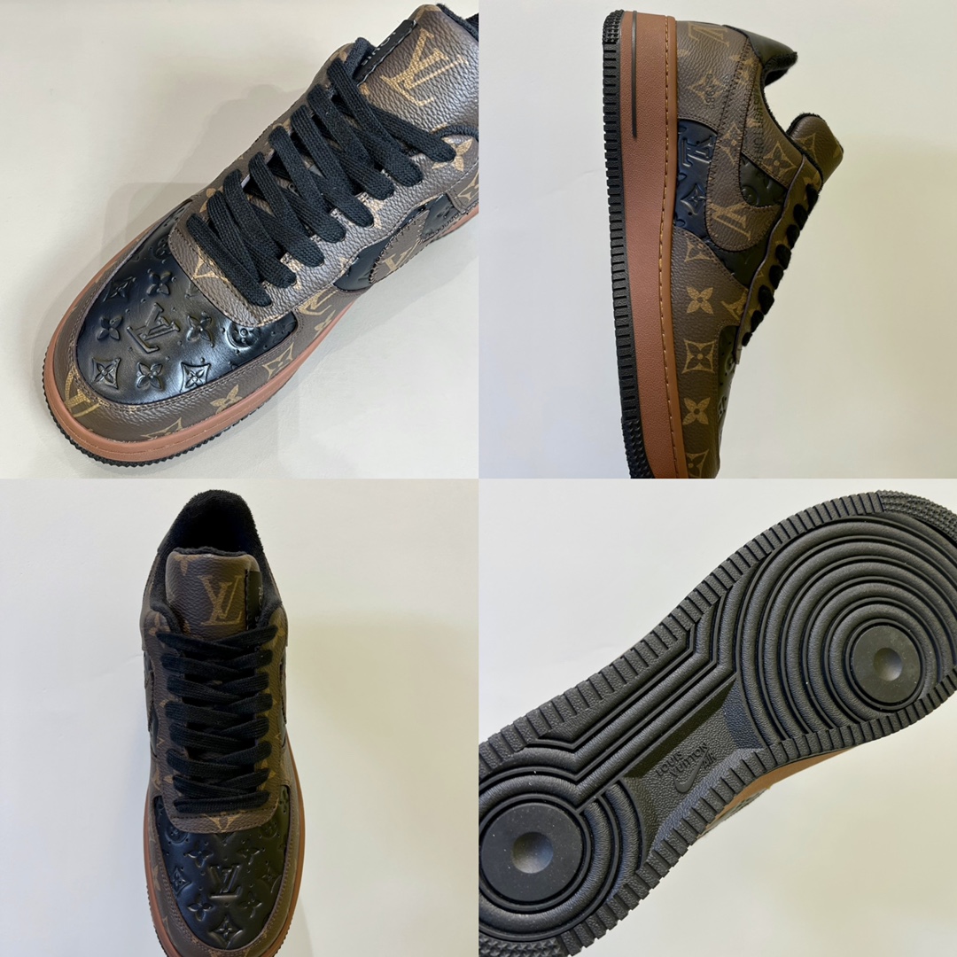 💠TRAINER x Nik* Air Force1 collaborative sneakers, made from black calfskin and brown Monogram patterns with white laces, black and brown spliced upper, tongue adorned with 1V x Nik* letters, side features ","☑️" text, black and brown outsole with AIR logo, black and brown sole sneakers💠