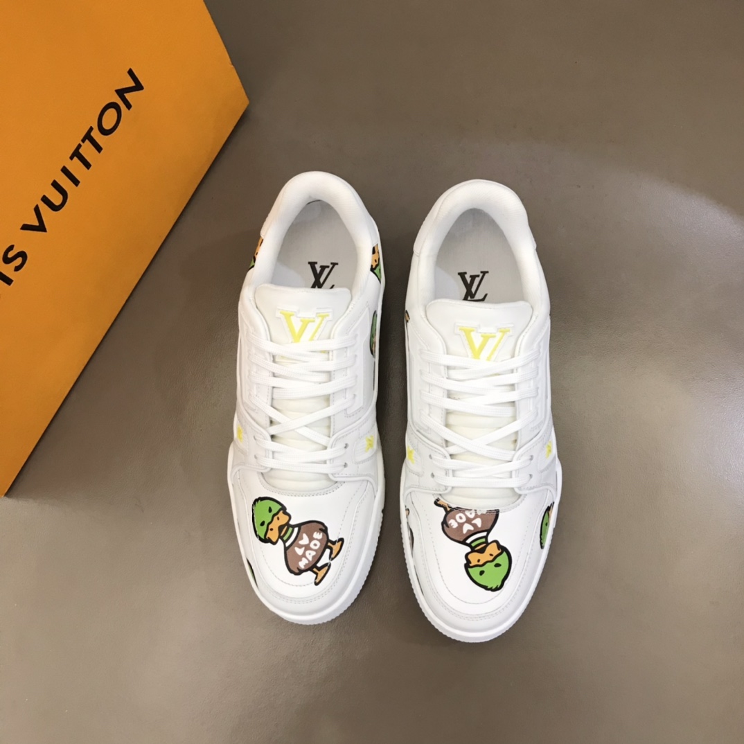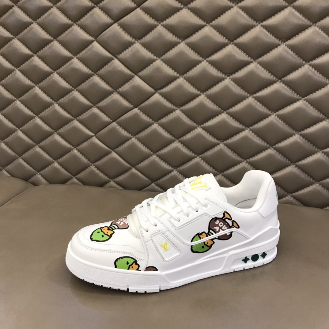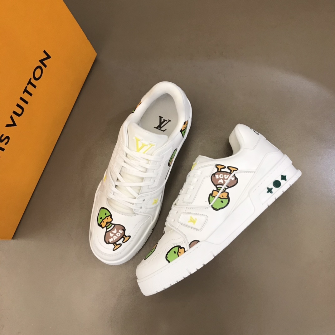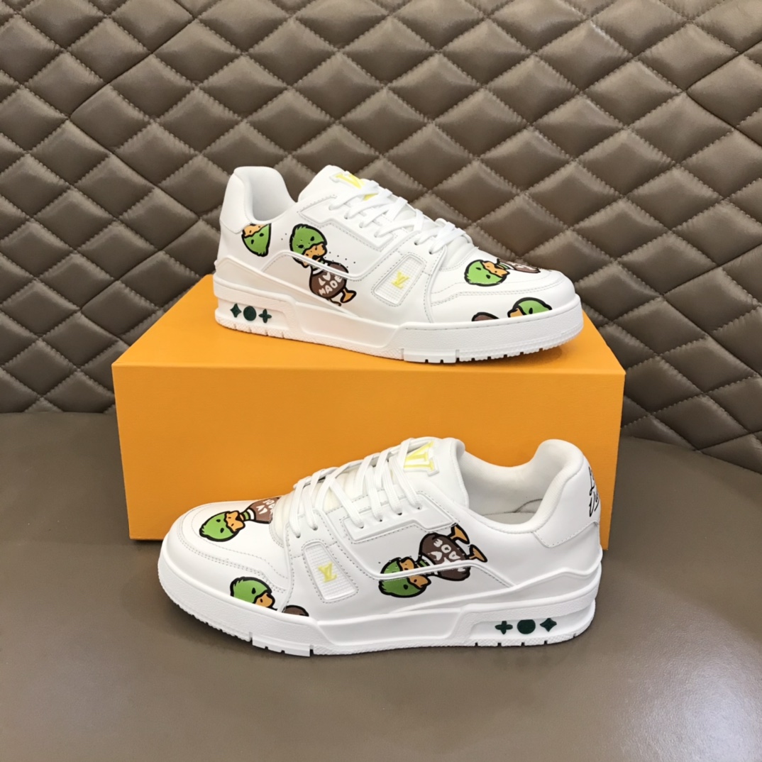 Nigo X L. v Collaboration Trainer Trend Men's Sneakers. After the全新 design in early spring 2022, it has sparked renewed anticipation in the fashion trend circle. The iconic Trainer model is printed with NIGO L. v (Wild Duck). The yellow L. v and green Monogram logo details add a playful and cute touch to these shoes! The technological rubber outsole is equipped with an innovative gel insole, providing outstanding comfort. The outsole is adorned with Monogram Flowers pattern. A classic basketball shoe style with high回头率, easy to match, and comfortable to wear with breathable upper! Size: 38-45
