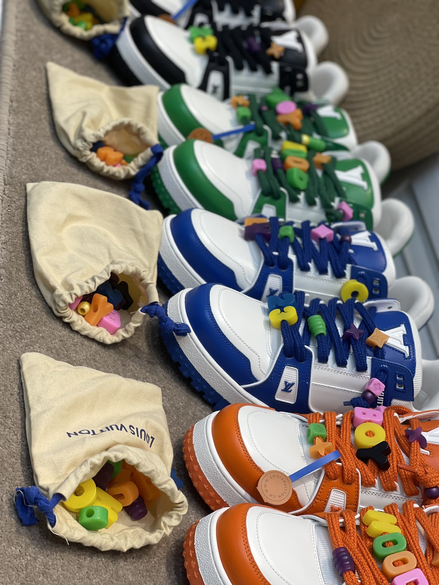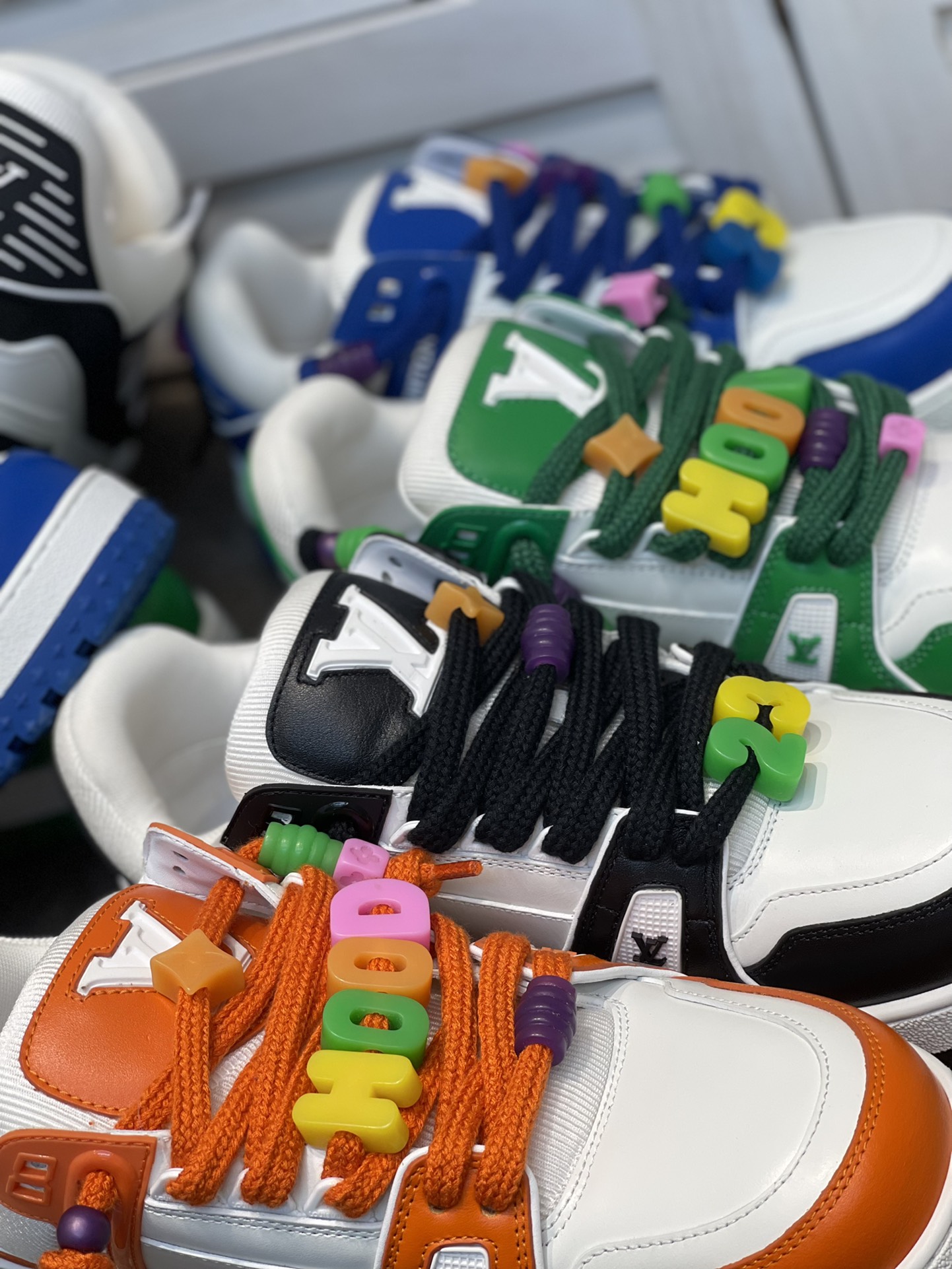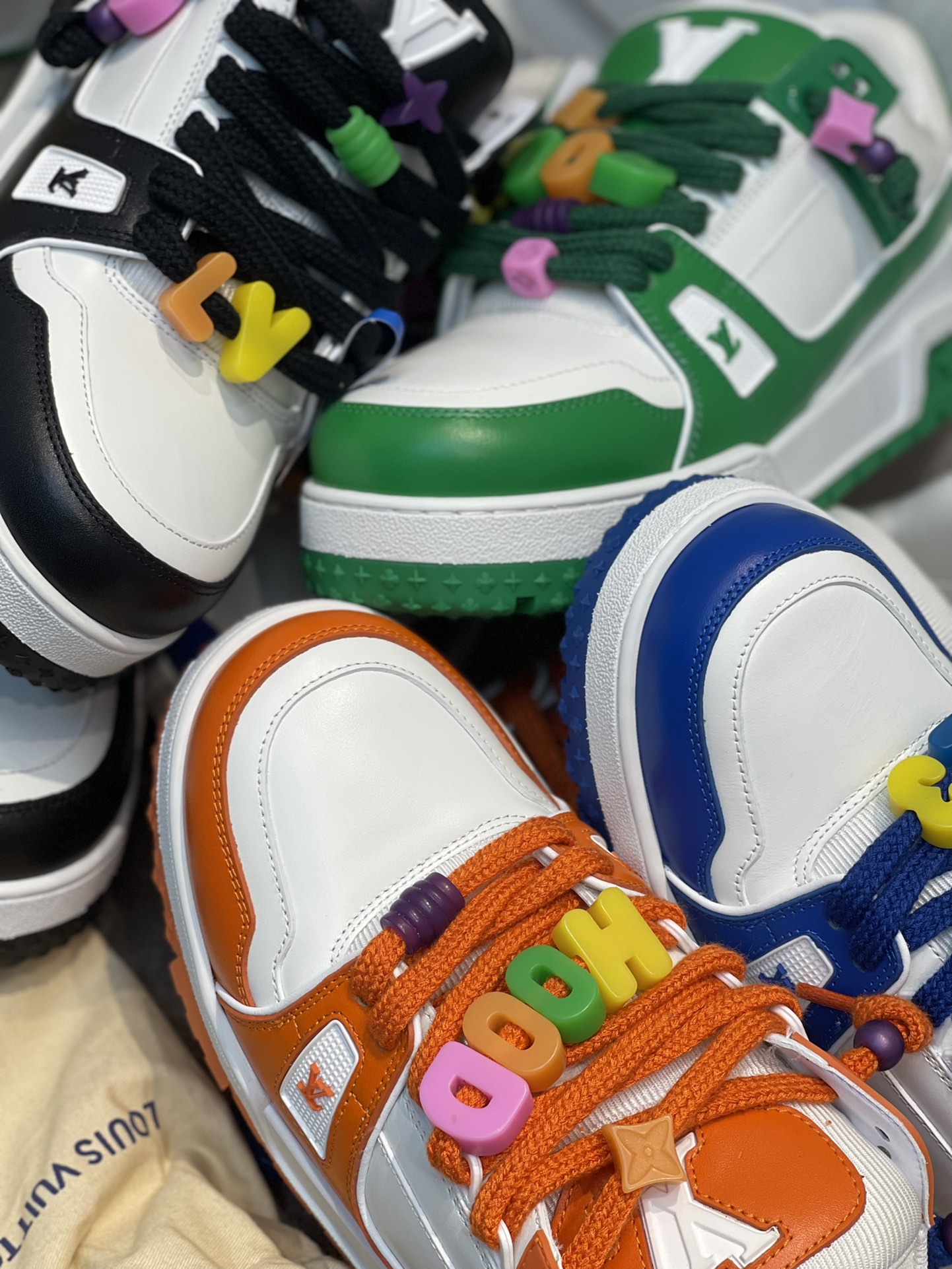 The latest LV chunky trainer men's shoes. DIY beaded Louis Vuitton men's wear artistic director Virgil Abloh combined Monogram calfskin for the LV Trainer sneakers, presenting an exquisite structure through color and material contrast, showcasing his inspired interpretation of retro basketball shoes. Each finished pair requires 7 hours of meticulous stitching. Rubber outsole. The tongue, sides, and back are adorned with LV letters. The sides feature the Vuitton logo. The outsole is decorated with Monogram flowers. Available sizes: 39, 40, 41, 42, 43, 44. Leather shoe sizes. Original box packaging. Colors: green, black and white, blue, orange.