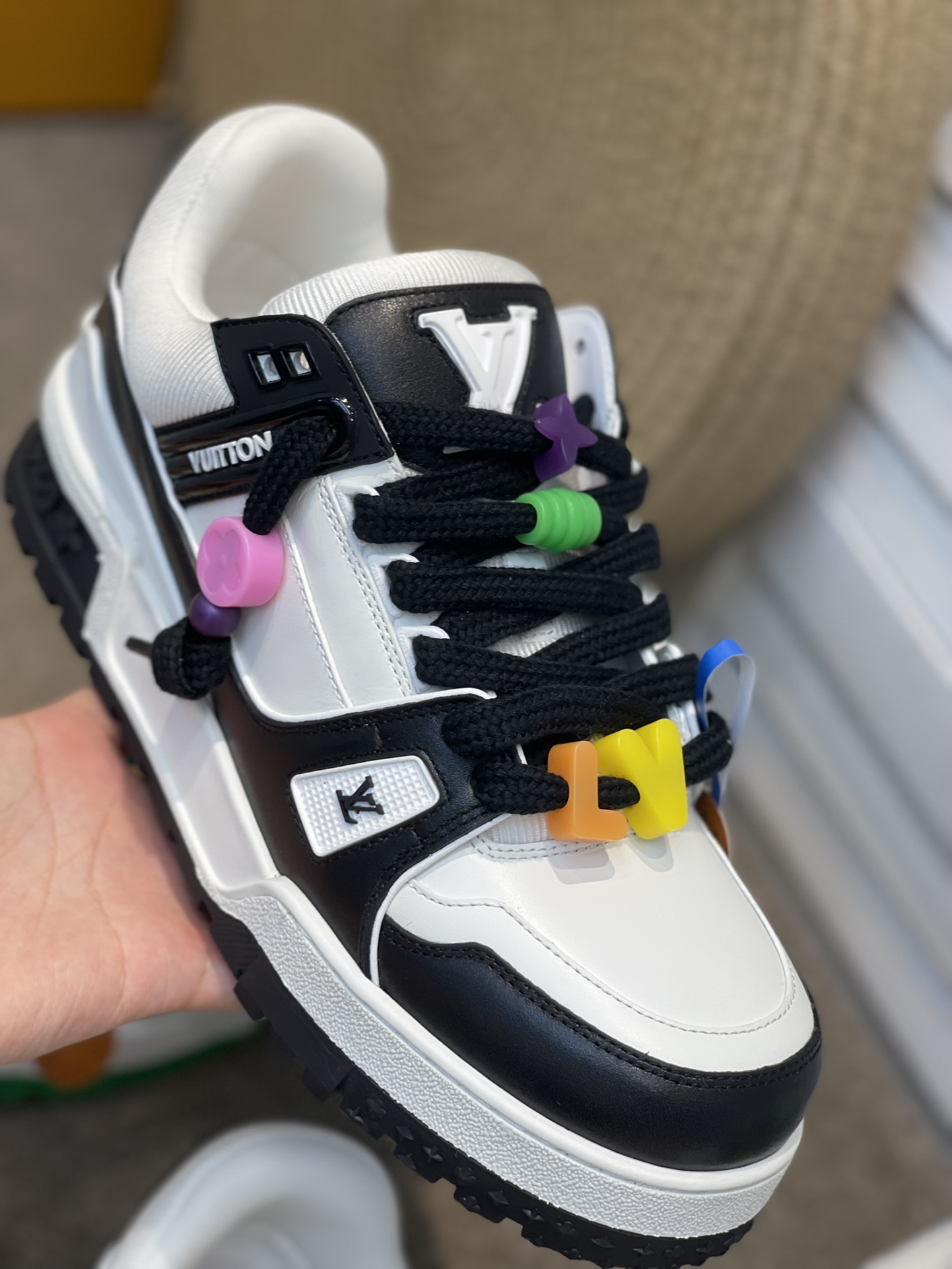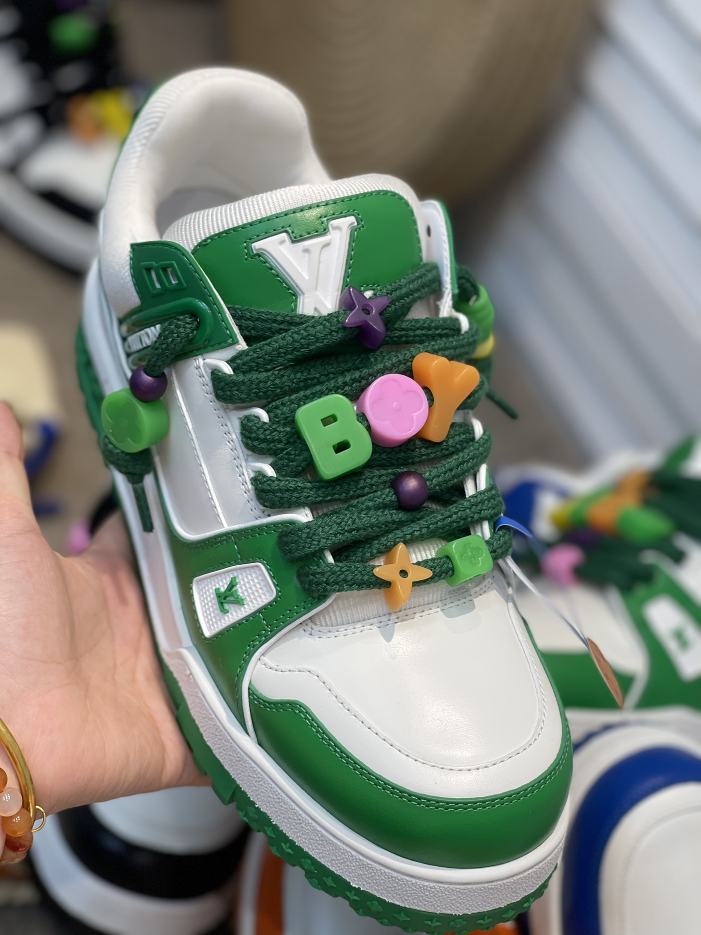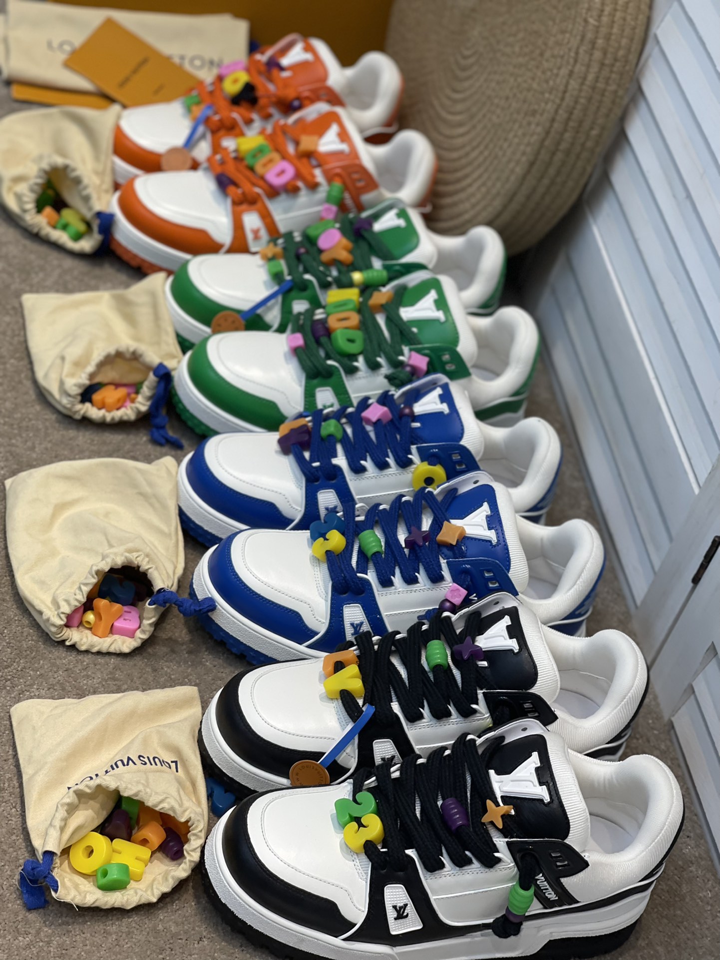 The latest LV chunky trainer men's shoes. DIY beaded Louis Vuitton men's wear artistic director Virgil Abloh combined Monogram calfskin for the LV Trainer sneakers, presenting an exquisite structure through color and material contrast, showcasing his inspired interpretation of retro basketball shoes. Each finished pair requires 7 hours of meticulous stitching. Rubber outsole. The tongue, sides, and back are adorned with LV letters. The sides feature the Vuitton logo. The outsole is decorated with Monogram flowers. Available sizes: 39, 40, 41, 42, 43, 44. Leather shoe sizes. Original box packaging. Colors: green, black and white, blue, orange.
