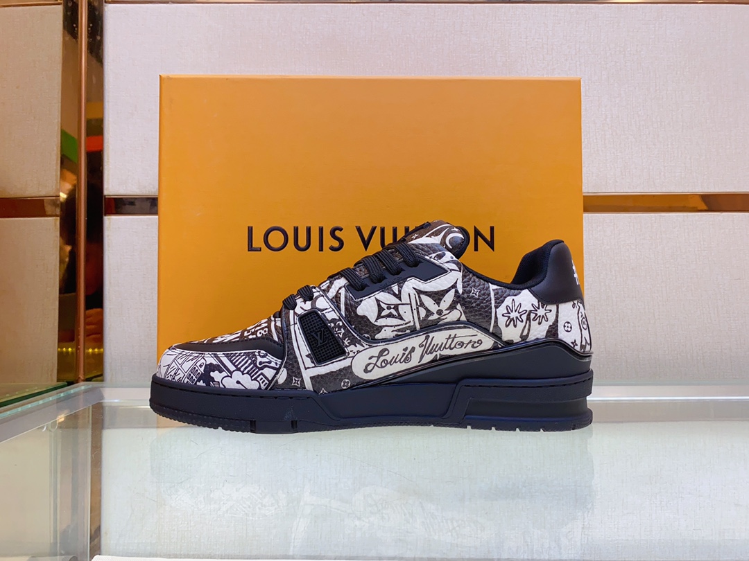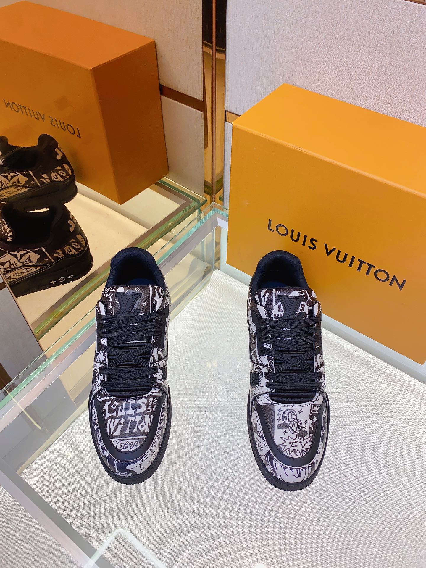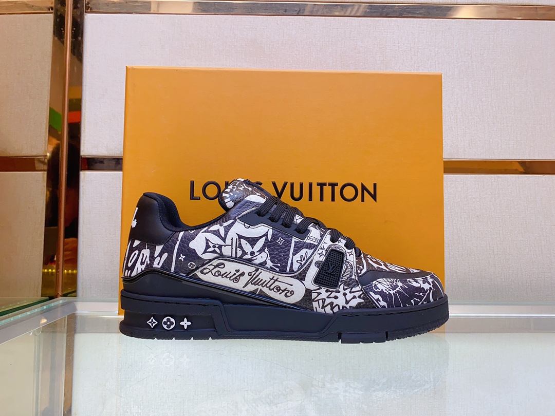 Louis V* Luxury Trainer Sneakers. These Trainer sneakers are made from imported calfskin. The design is simple, inspired by the retro basketball sneakers admired by Men's Artistic Director Virgil Abloh, with his handwritten Louis Vuitton English inscription on the side. The technical rubber outsole is equipped with an innovative gel insole, providing exceptional comfort. The outsole features Monogram Flowers pattern. A classic basketball sneaker style with high attention-grabbing appeal, easy to pair, and offers breathable comfort when worn! Size: Men's 39-45