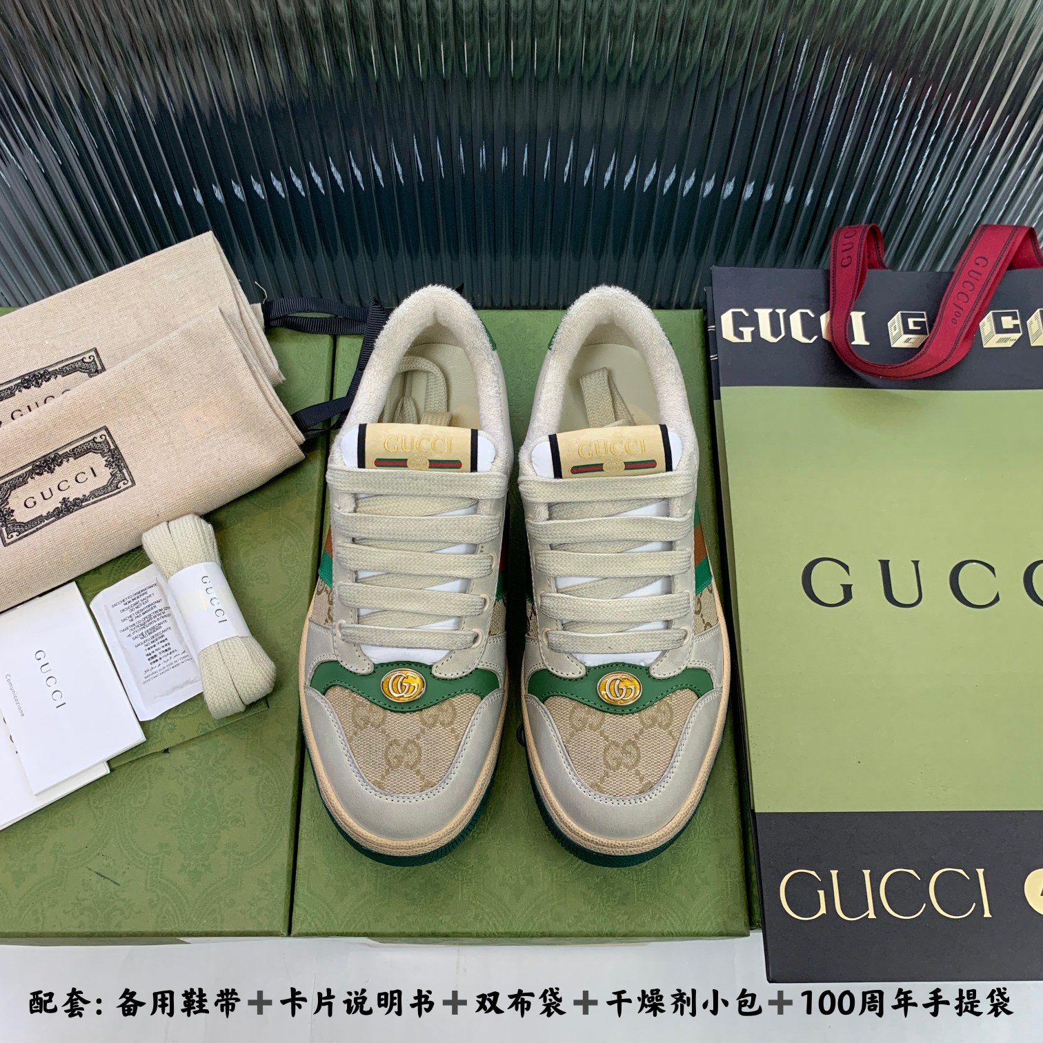 Set: Spare shoelaces + card instructions + double cloth bag + small desiccant pack + 100th anniversary tote bag + 10