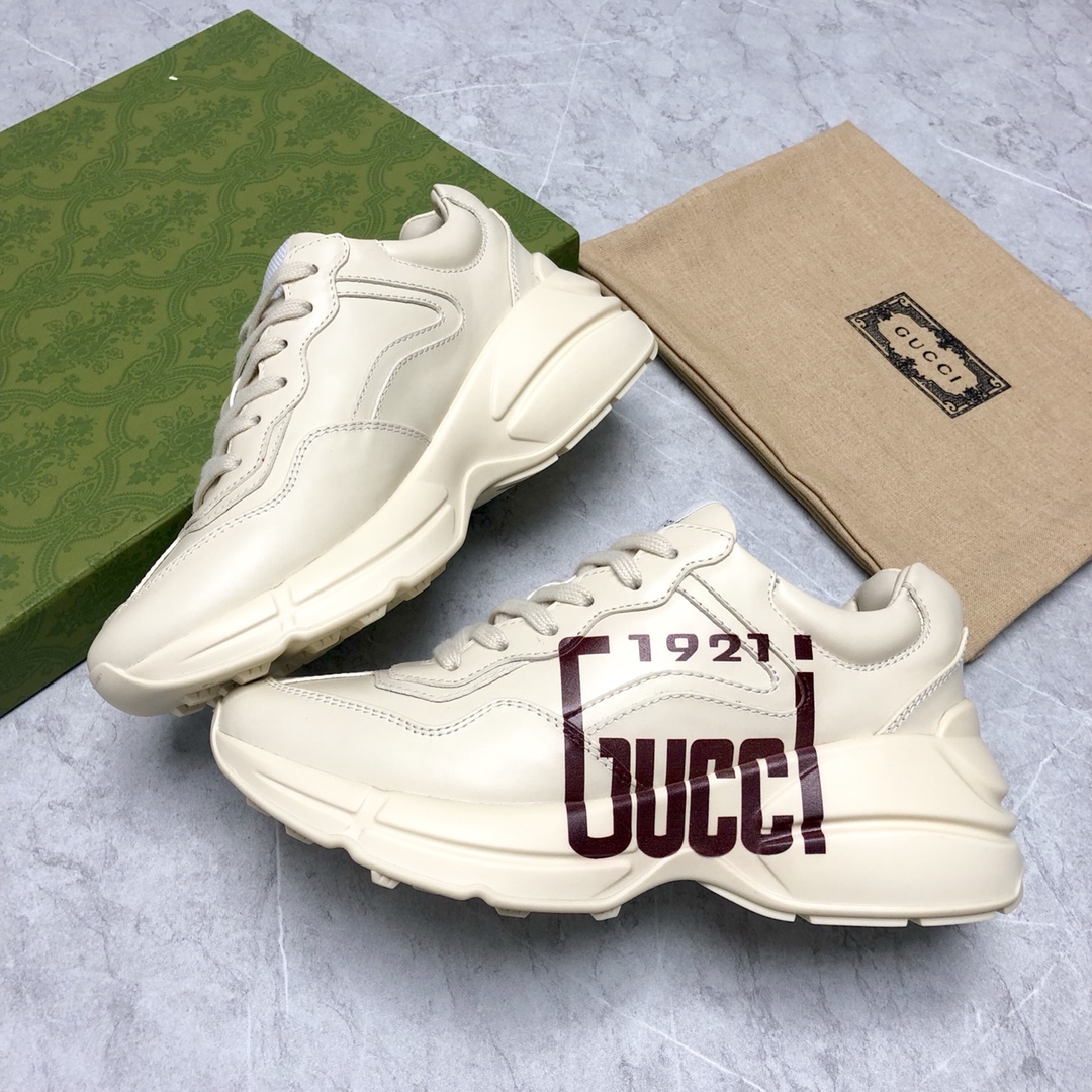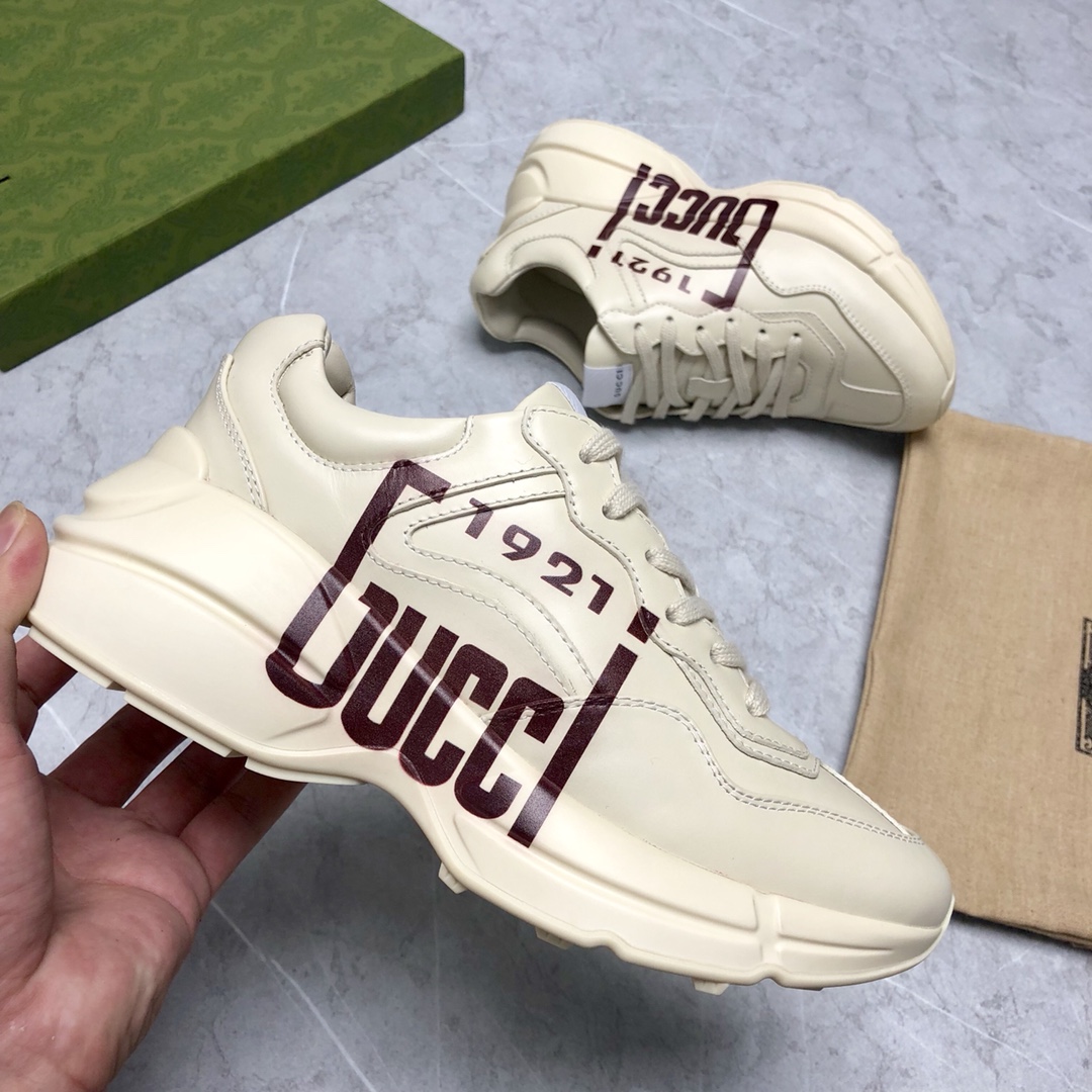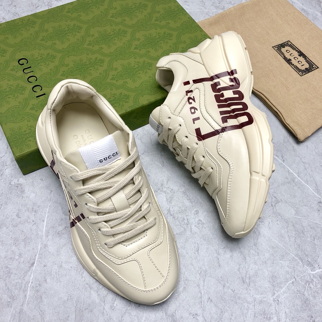 Counter-synced new dad shoes. Every time this series releases a new model, it causes a sensation, you know. These Rhyton series sneakers are mainly made from sustainable material Demetra. This new material uses processes equivalent to tanning techniques, giving it excellent softness and stretchability. This eco-friendly material primarily comes from sustainable, renewable, and bio-based sources without animal components. Decorated with "1921" and "Gucci" red print. Full set packaging included.