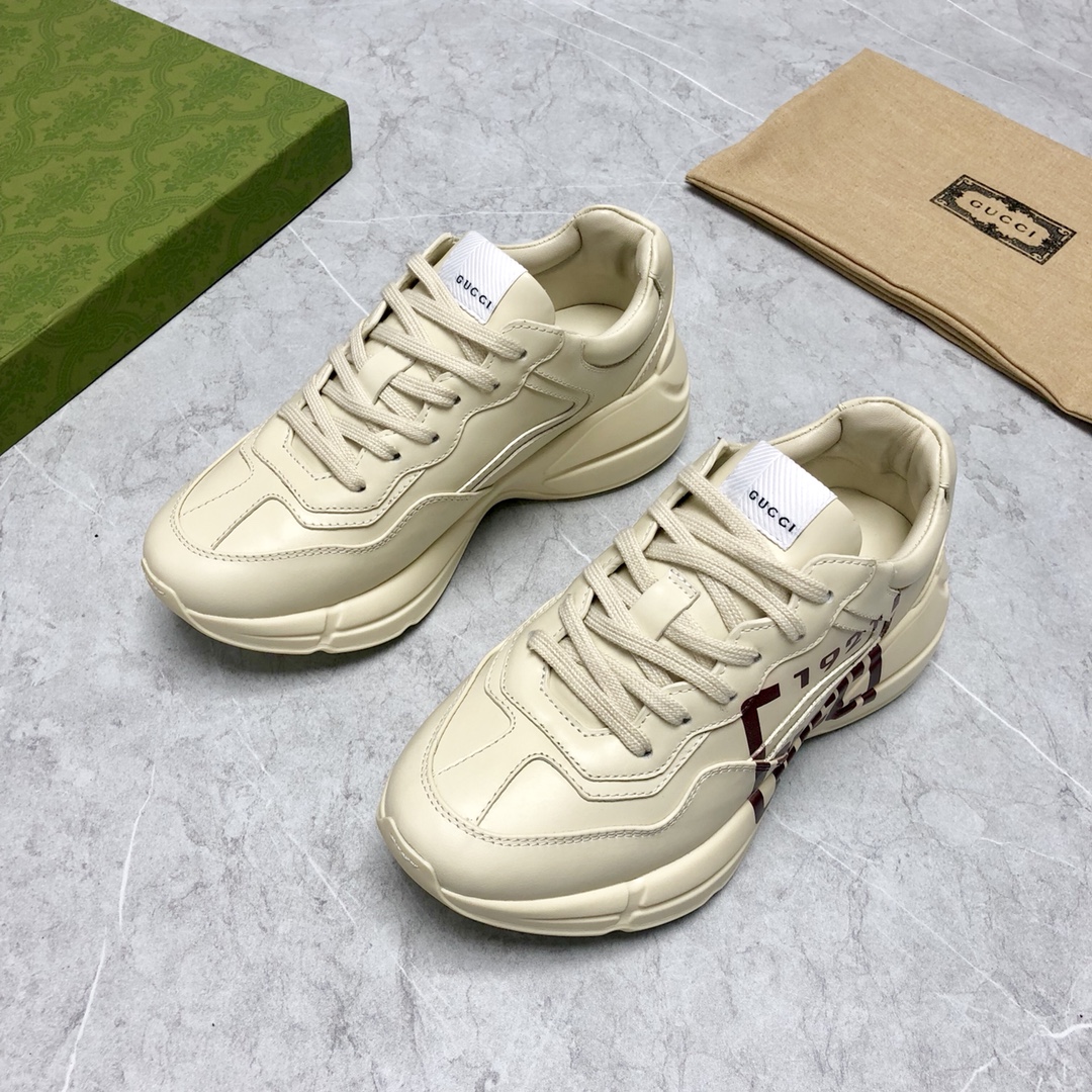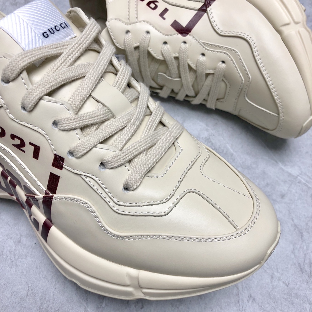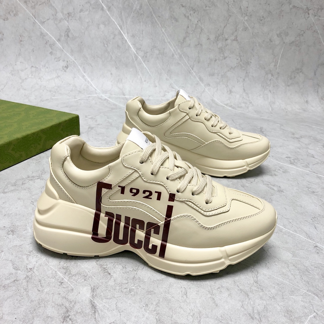 Counter-synced new dad shoes. Every time this series releases a new model, it causes a sensation, you know. These Rhyton series sneakers are mainly made from sustainable material Demetra. This new material uses processes equivalent to tanning techniques, giving it excellent softness and stretchability. This eco-friendly material primarily comes from sustainable, renewable, and bio-based sources without animal components. Decorated with "1921" and "Gucci" red print. Full set packaging included.