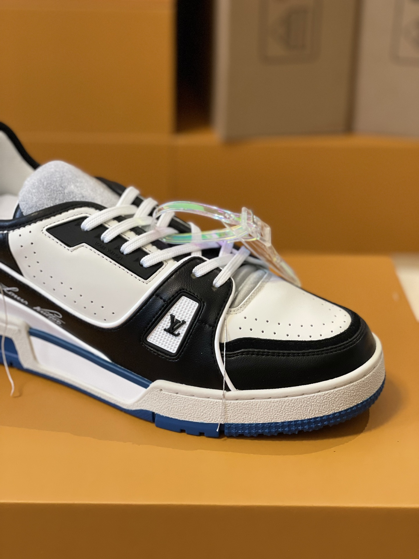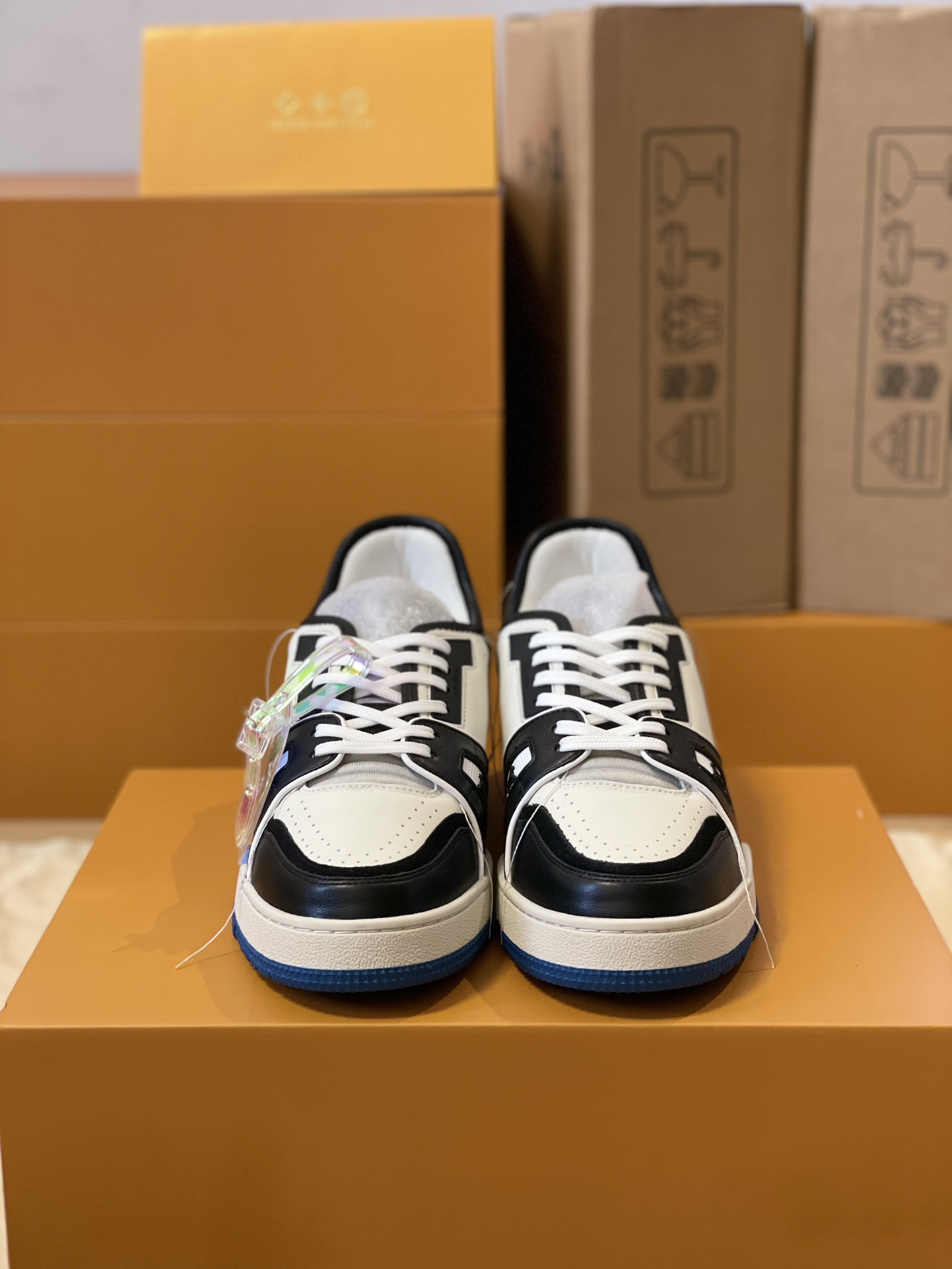 Style number G0220 Virgil Abloh draws inspiration from basketball shoe design, introducing the iconic LV Trainer sneakers. The 2021 official website's latest modified version 1A8Q7K blue base panda runway style 1.0 version features a unique combination of white and black contrasting colors and a distinctive tongue lining color. The exposed threads are also very unique, reflecting the so-called masculine updated color preferences, while also bringing careful operations to the shoe-making process. It features the Monogram pattern and continues the comfortable experience brought by the innovative gel outsole.
