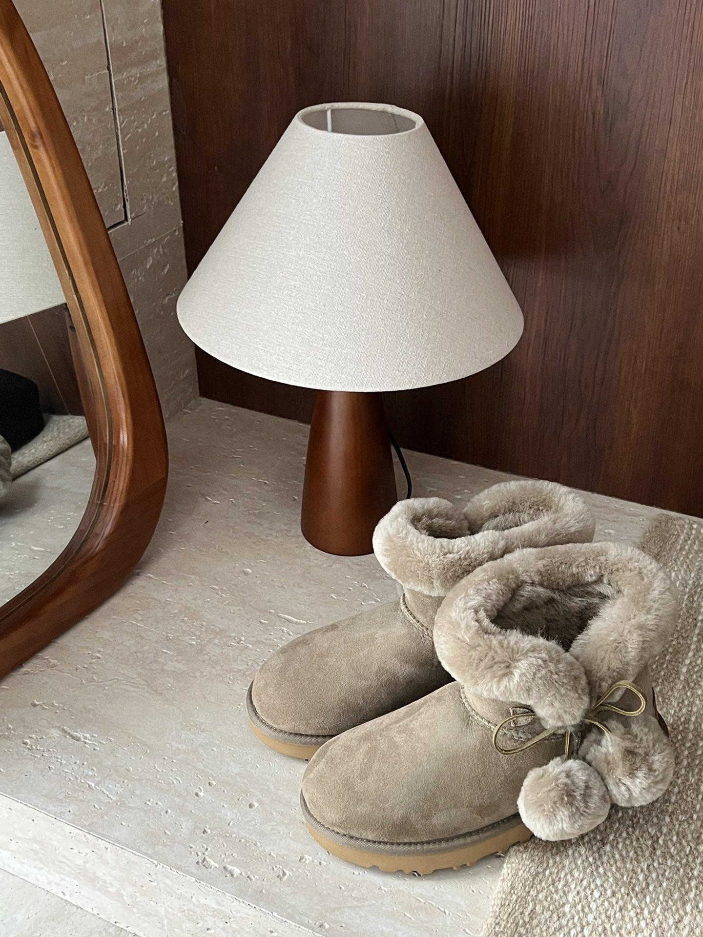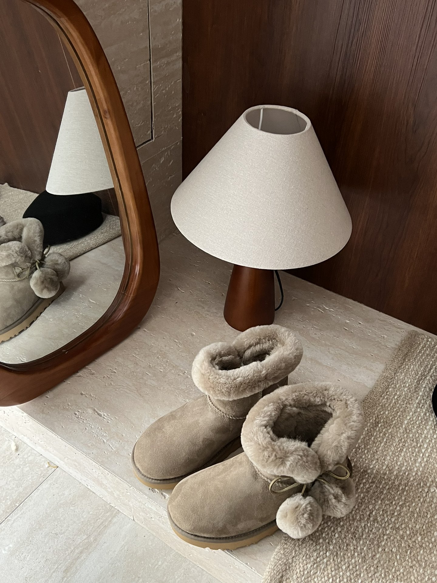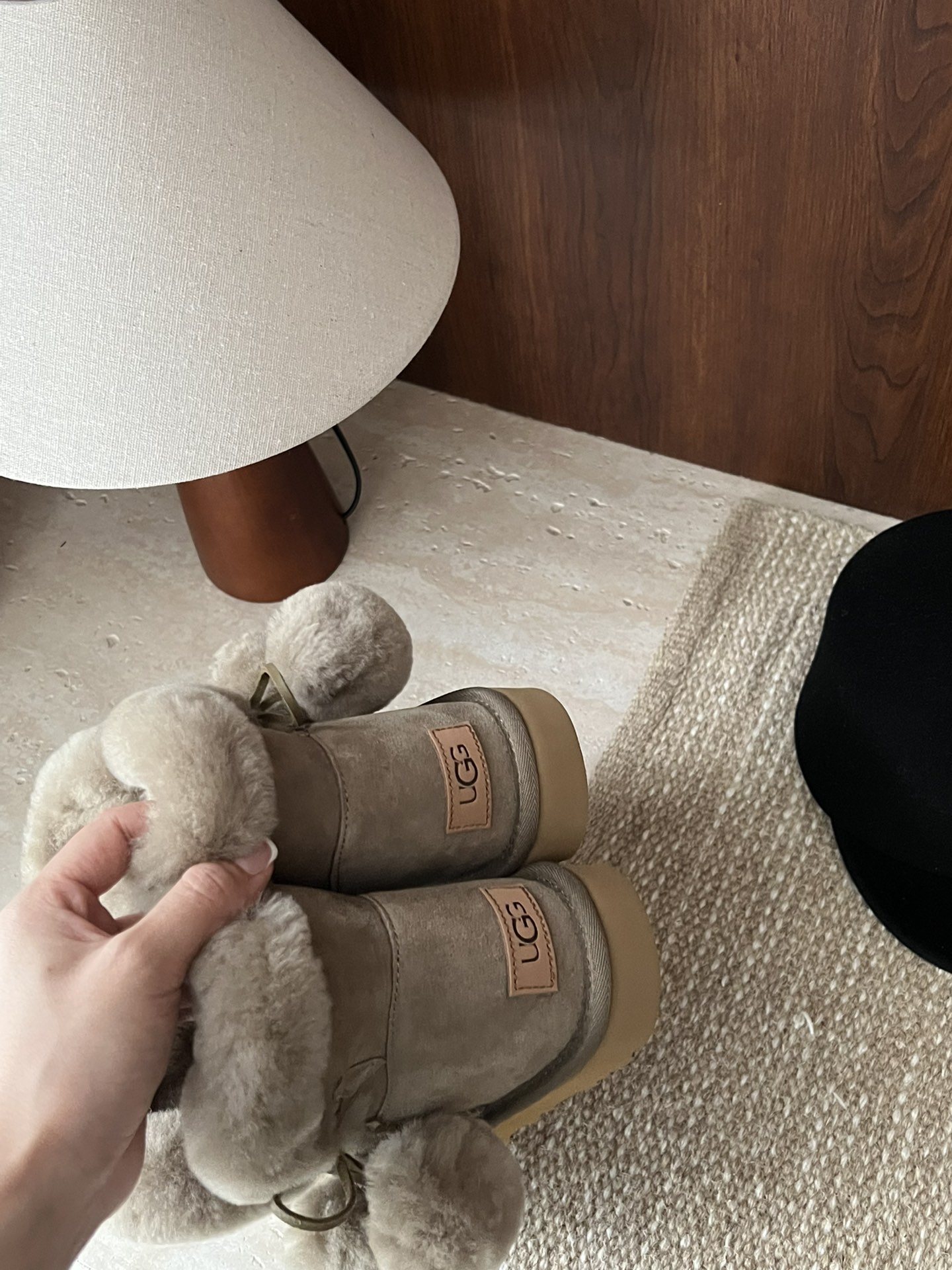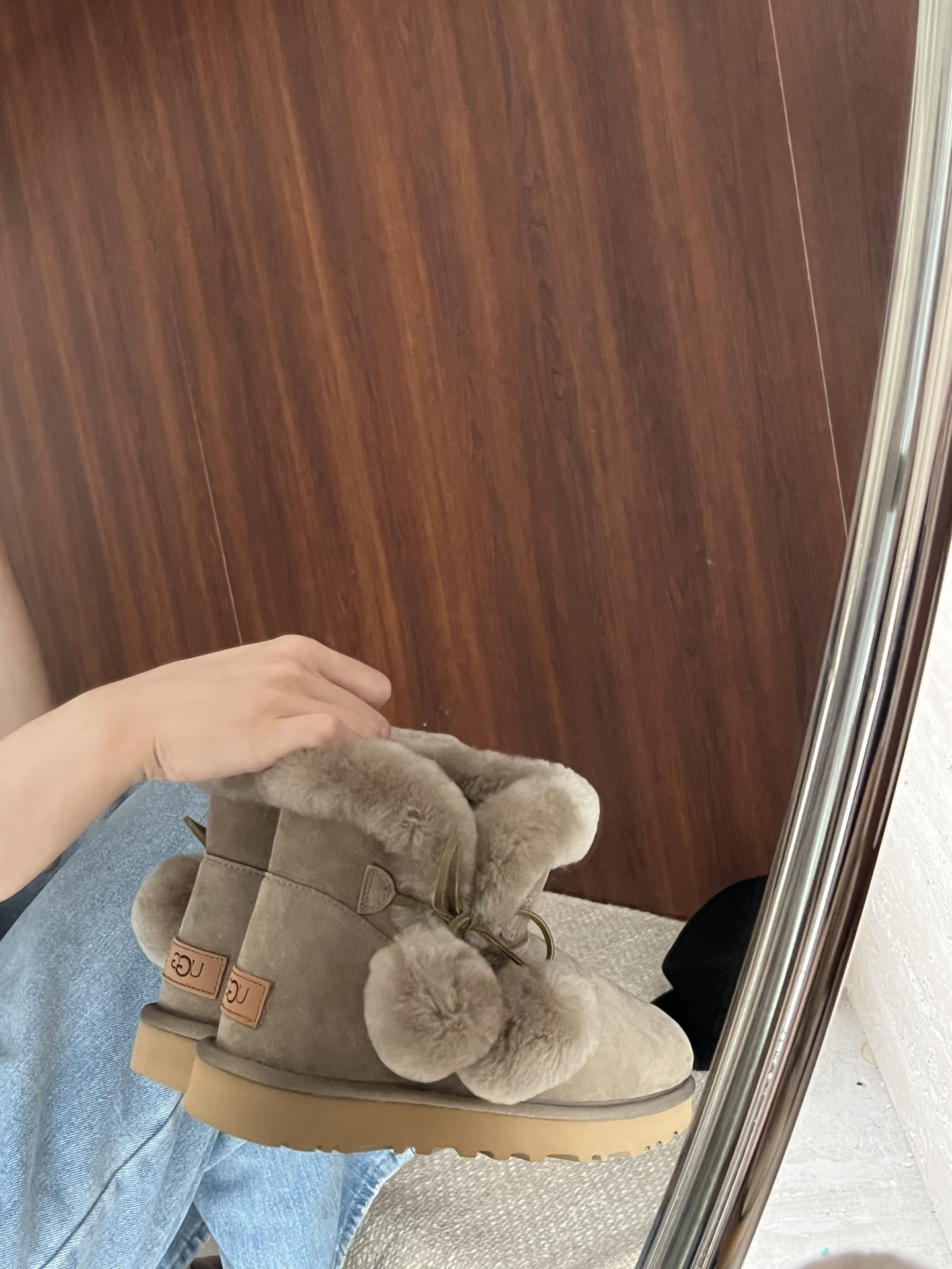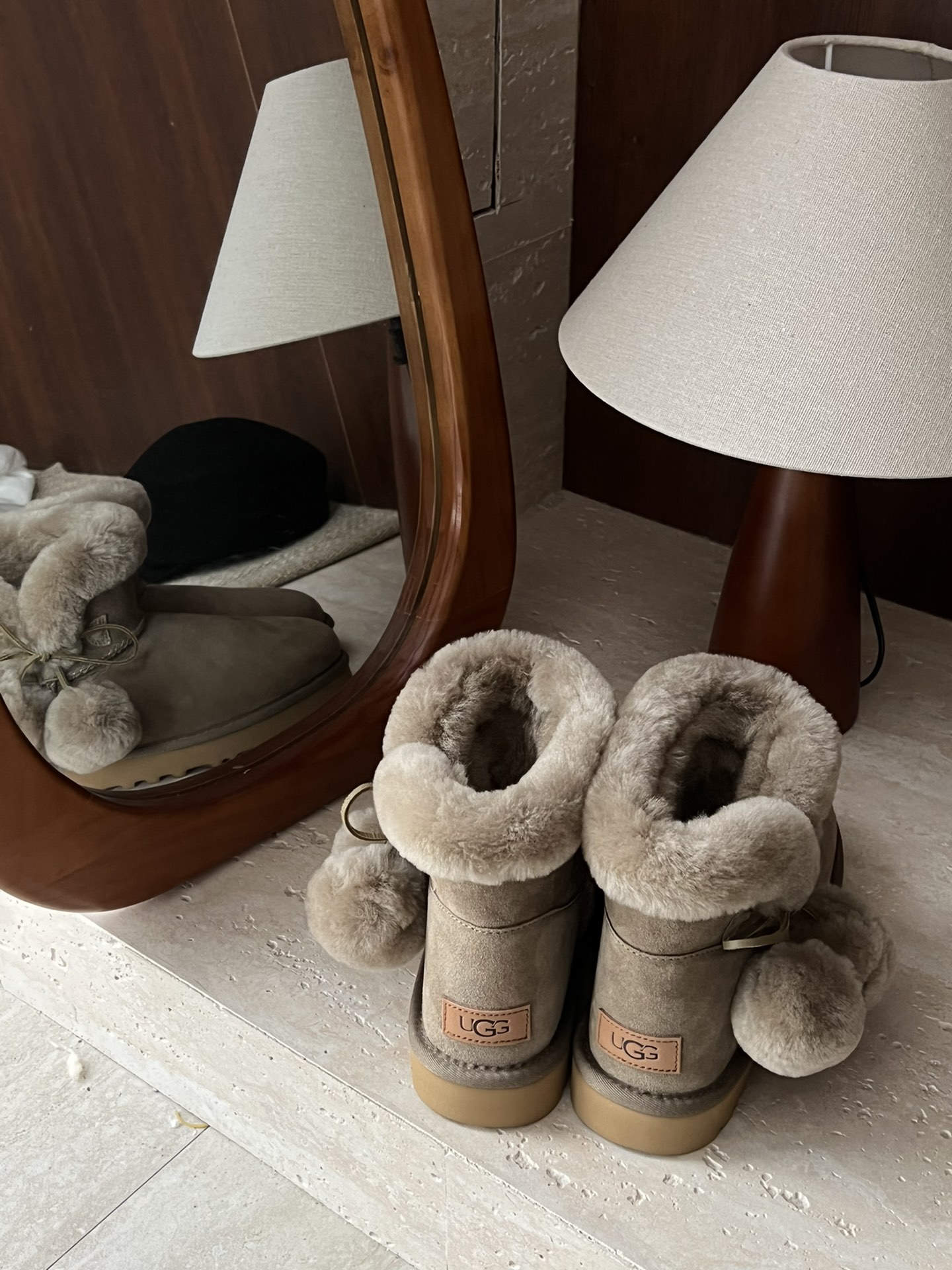 UGG. Fur and leather integrated side pom-pom bow