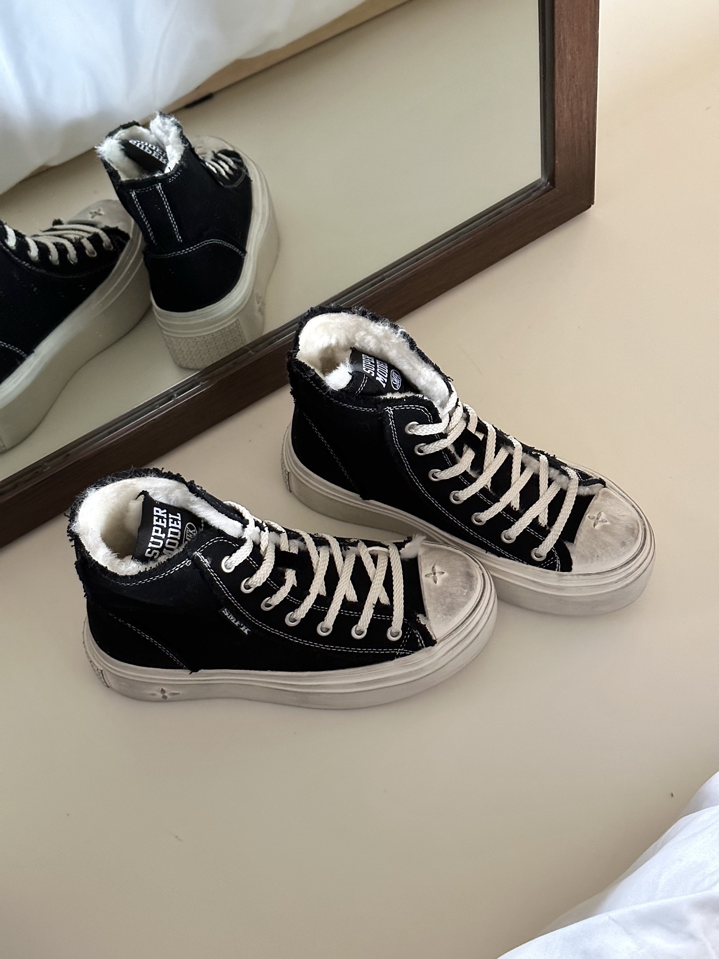 This wool distressed sneaker is perfect for basic winter outfits.