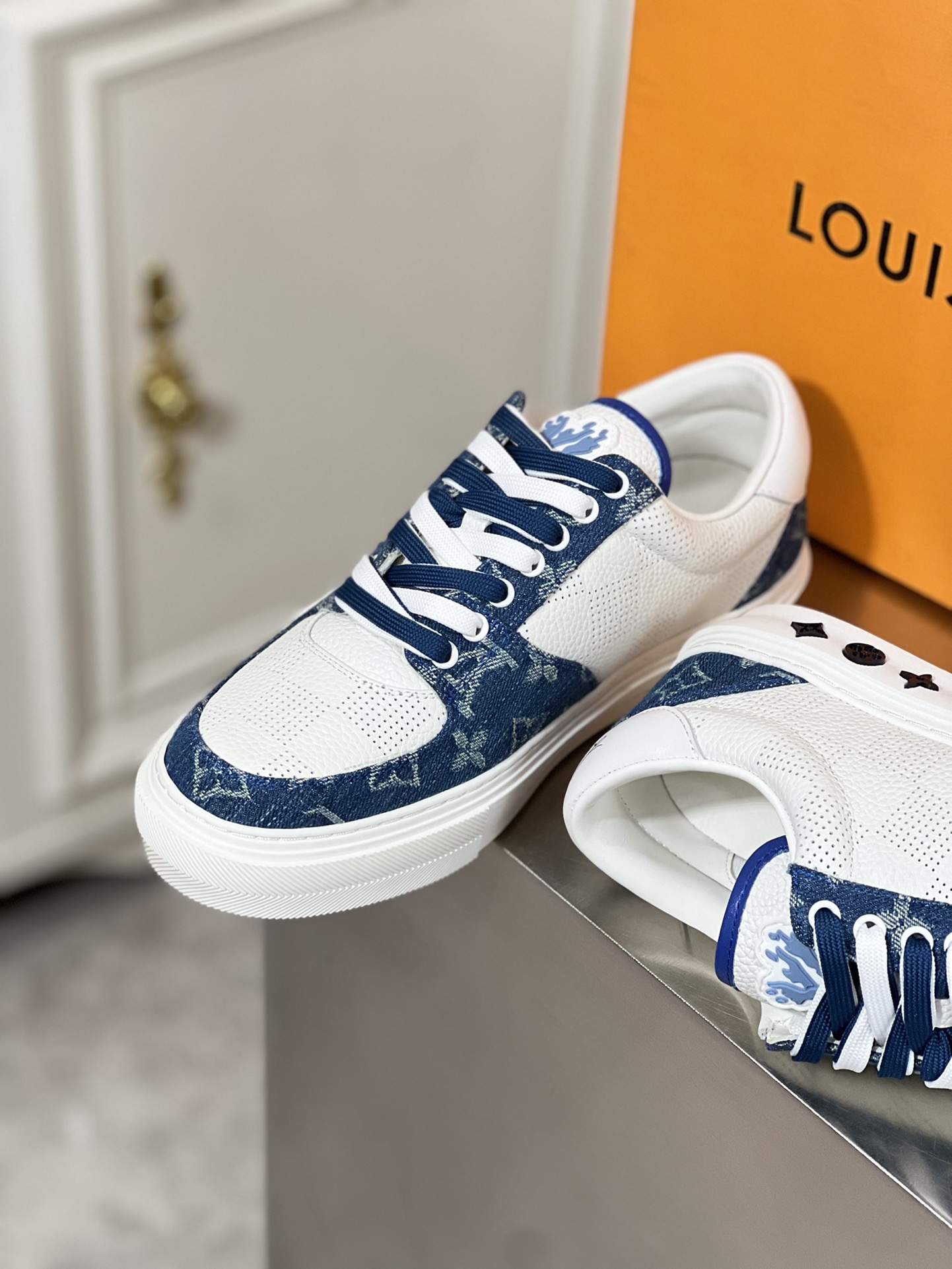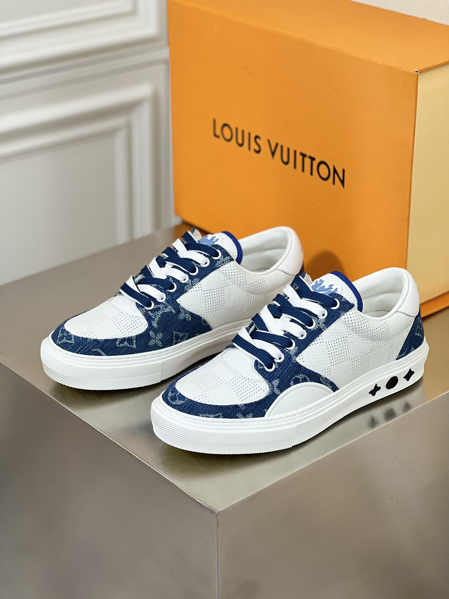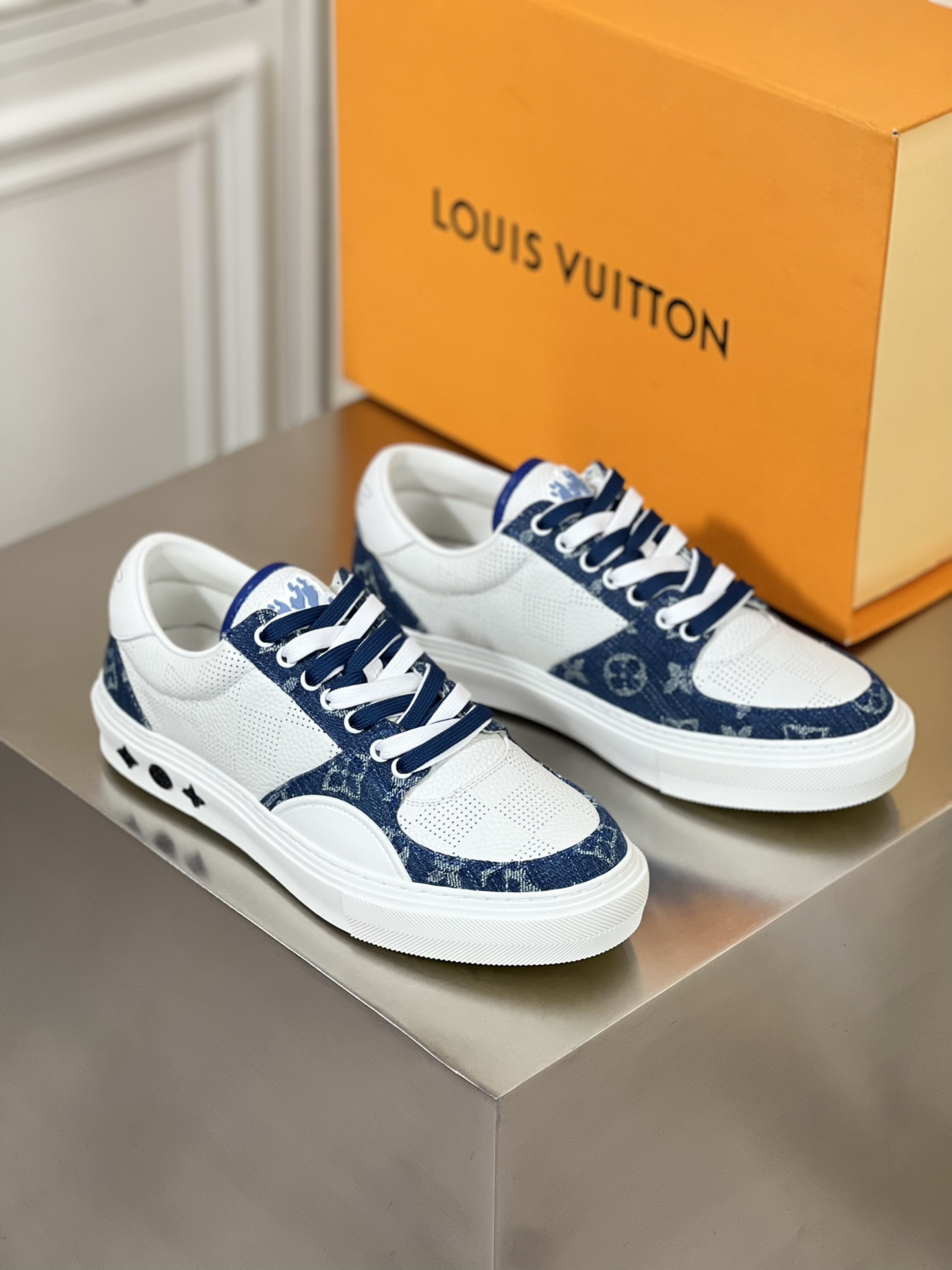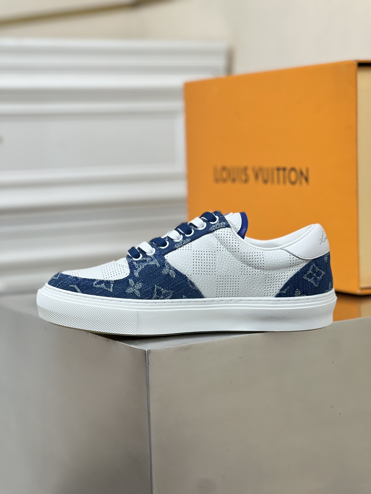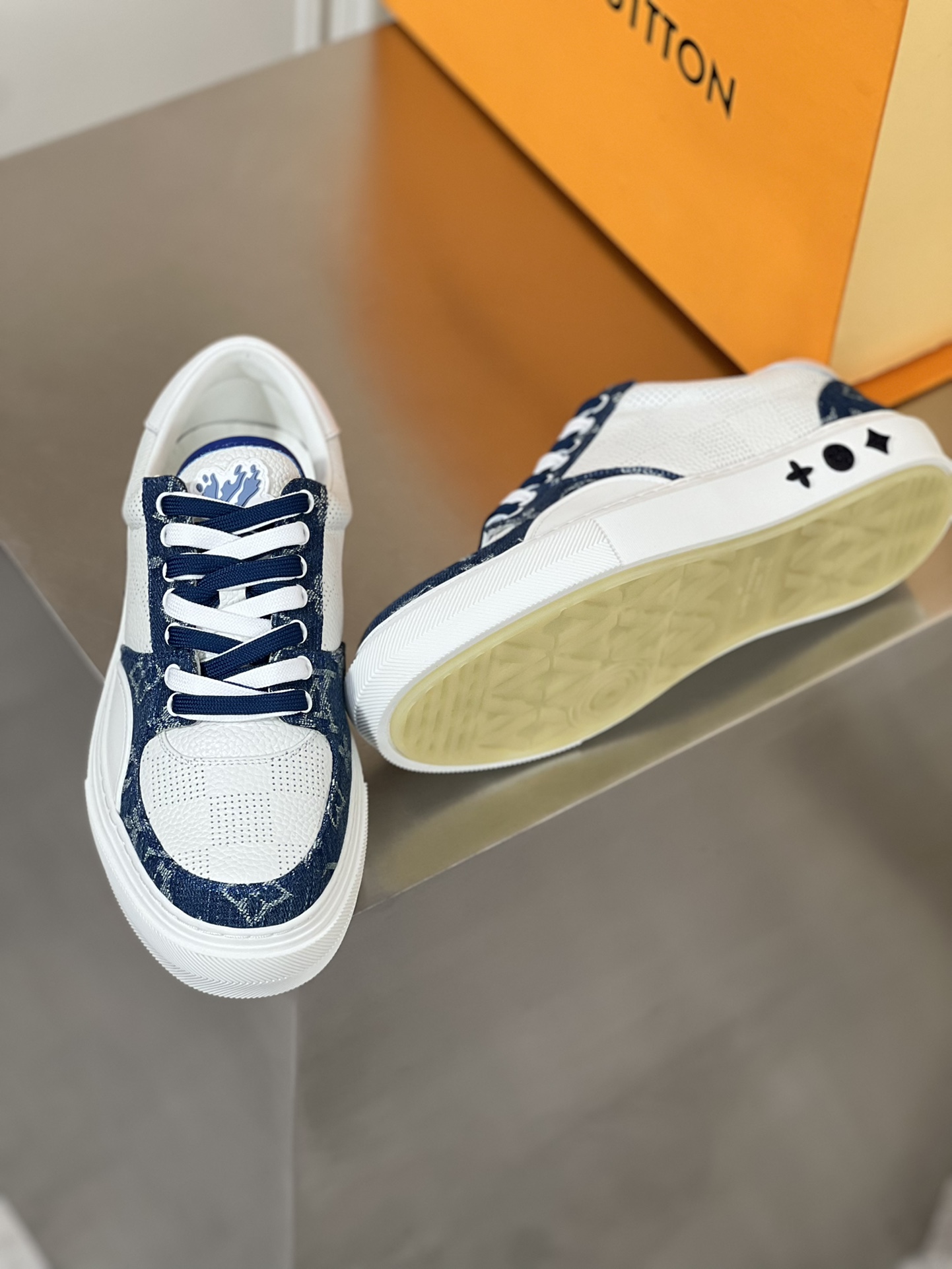This Ollie sports shoe is made of cowhide combined with denim fabric, paired with double shoelaces and cowhide trim. Monogram floral pattern adorns the rubber outsole, imported cowhide lining, and handwritten brand logo on the back of the shoe.