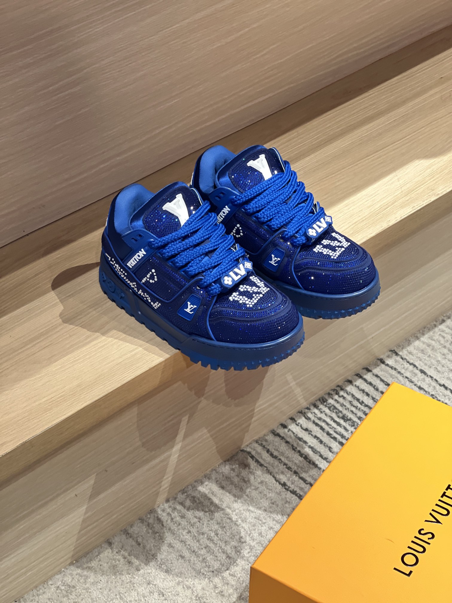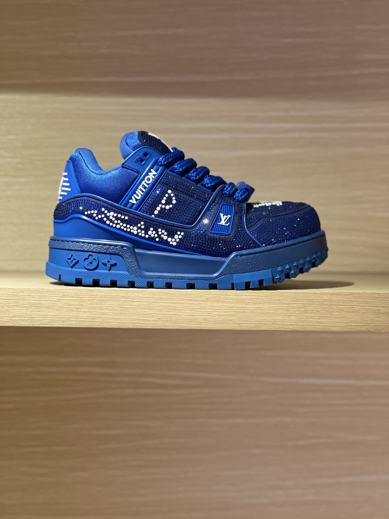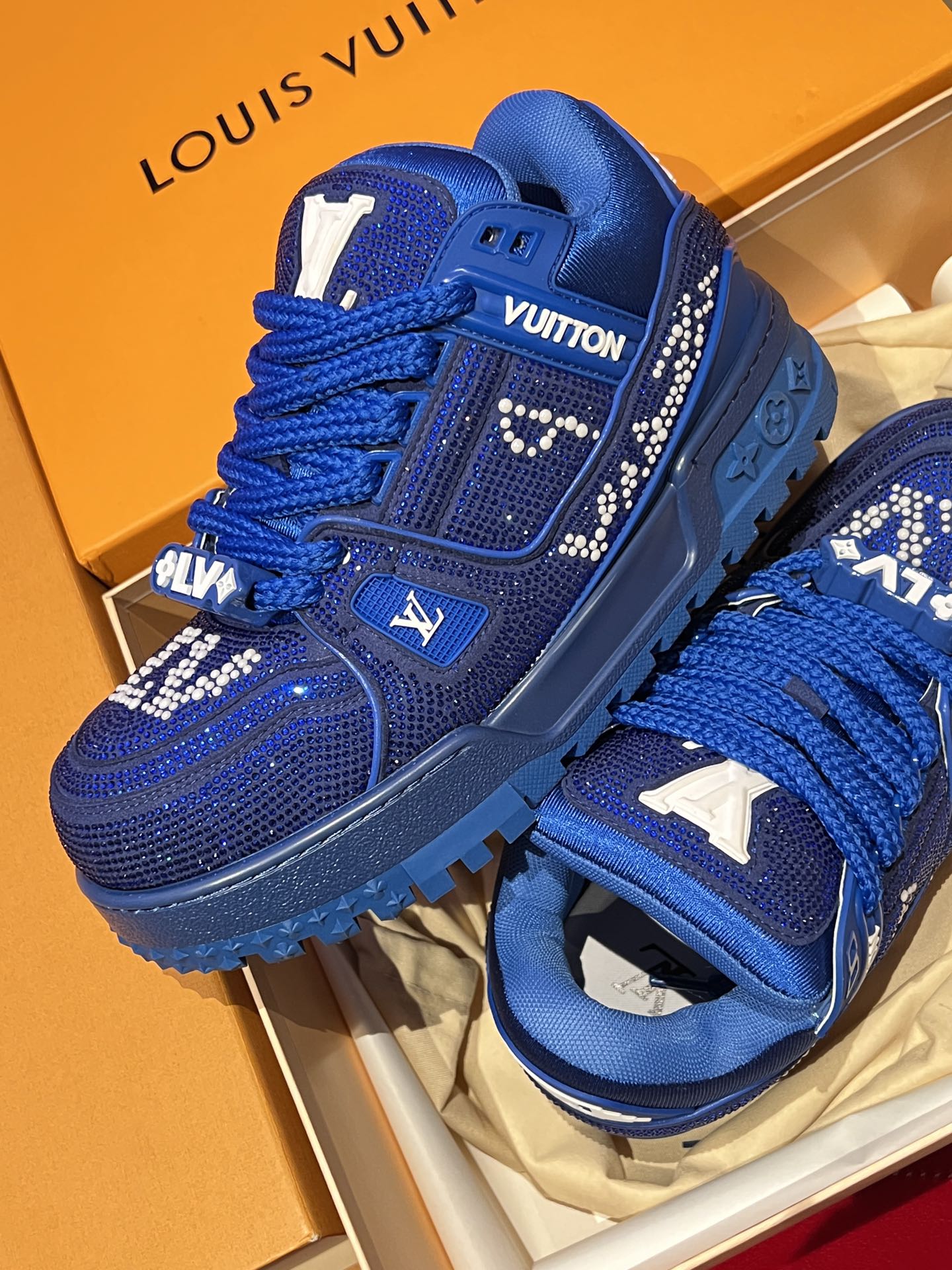 Uses grade A Swarovski crystals and pearls, special hot-pressing process ensures firmness, suede leather surface, imported high-density mesh lining, original private mold TPU sole! Every stitch is meticulously crafted.
