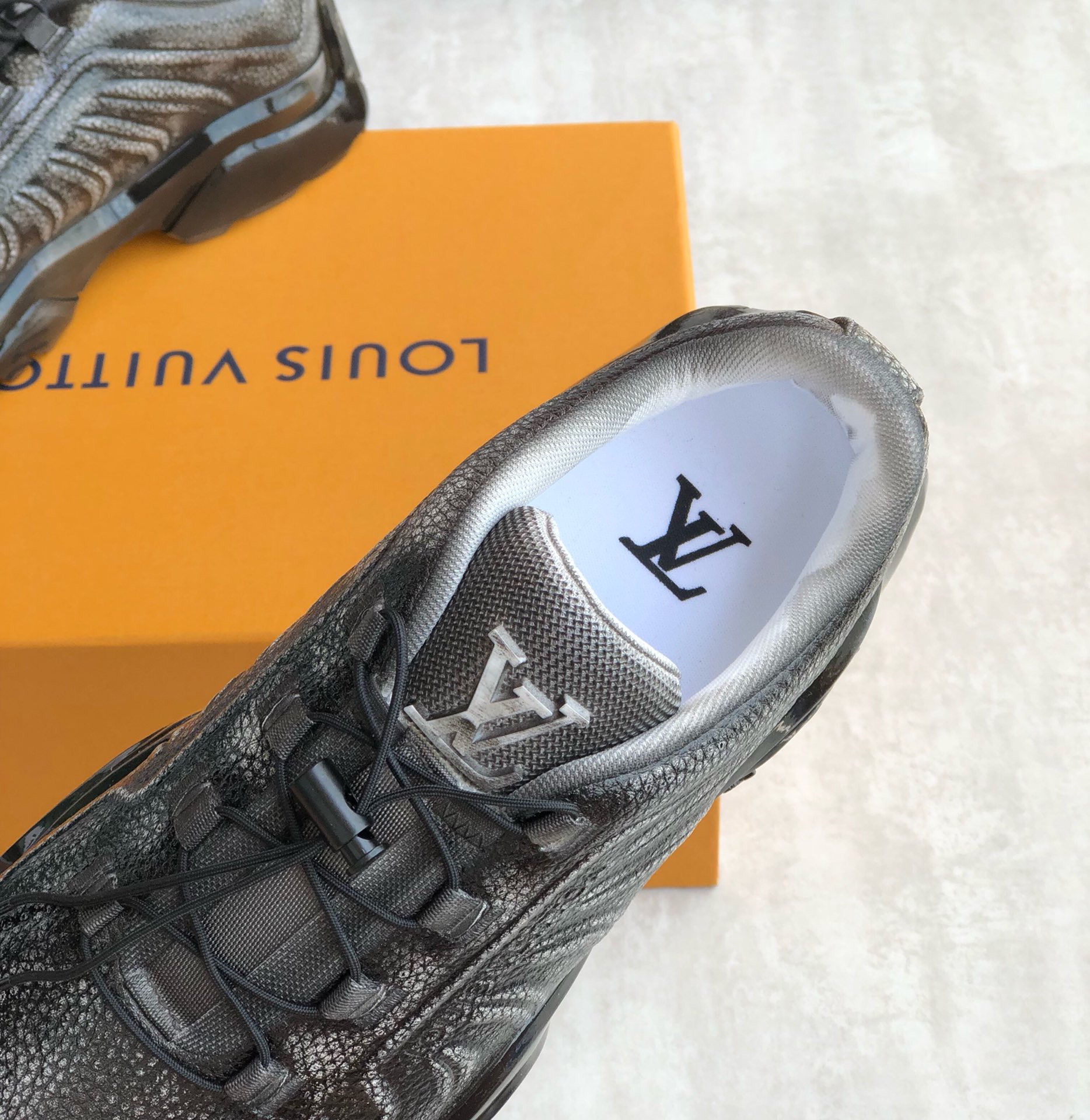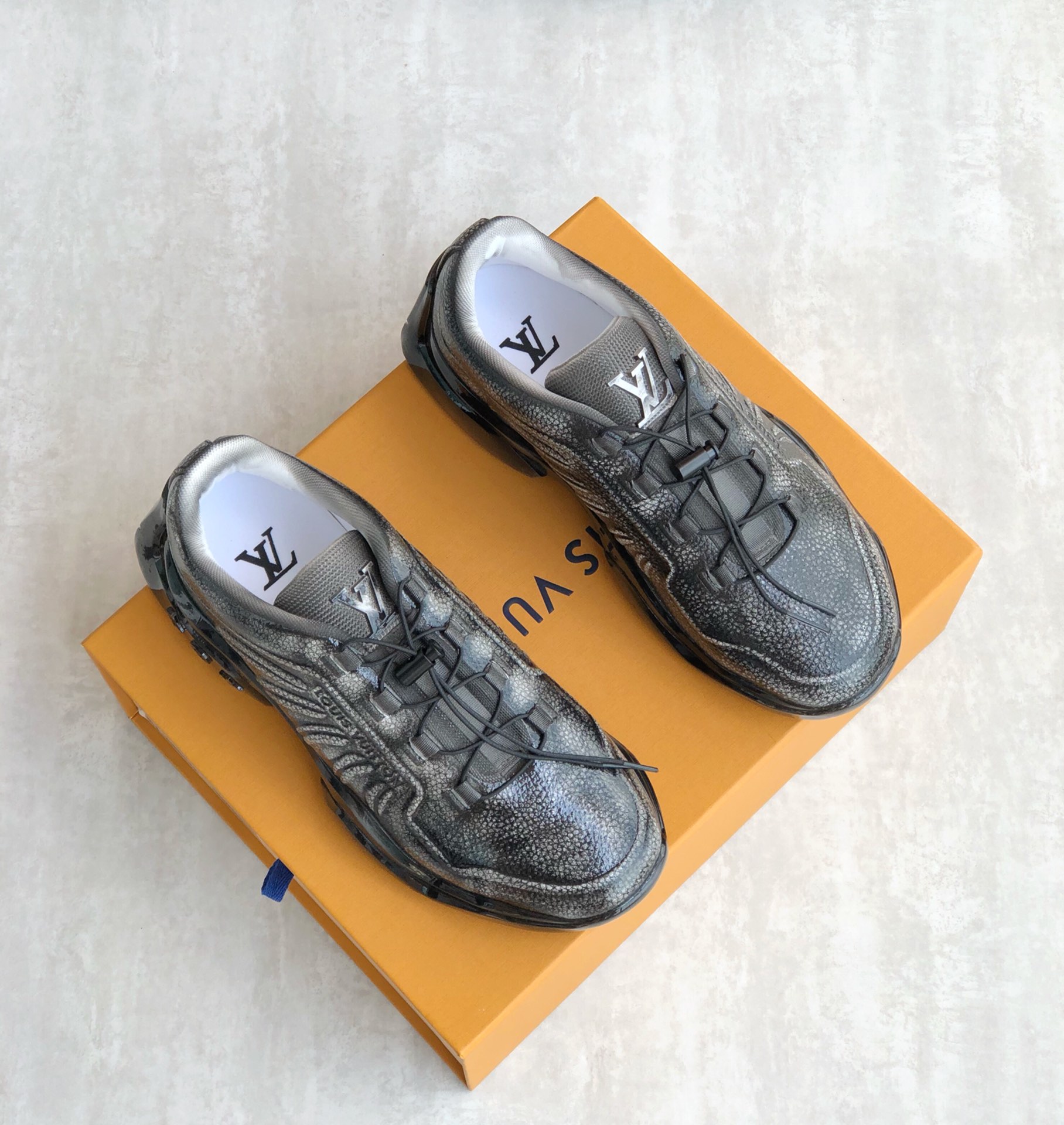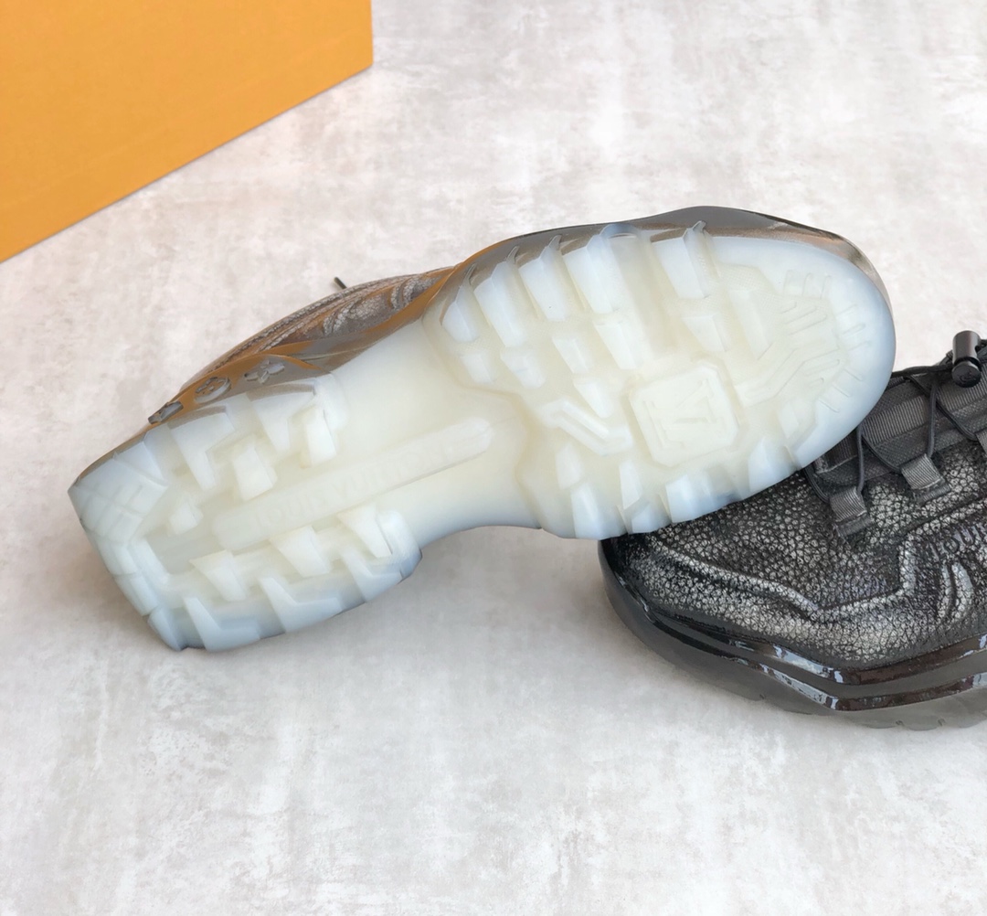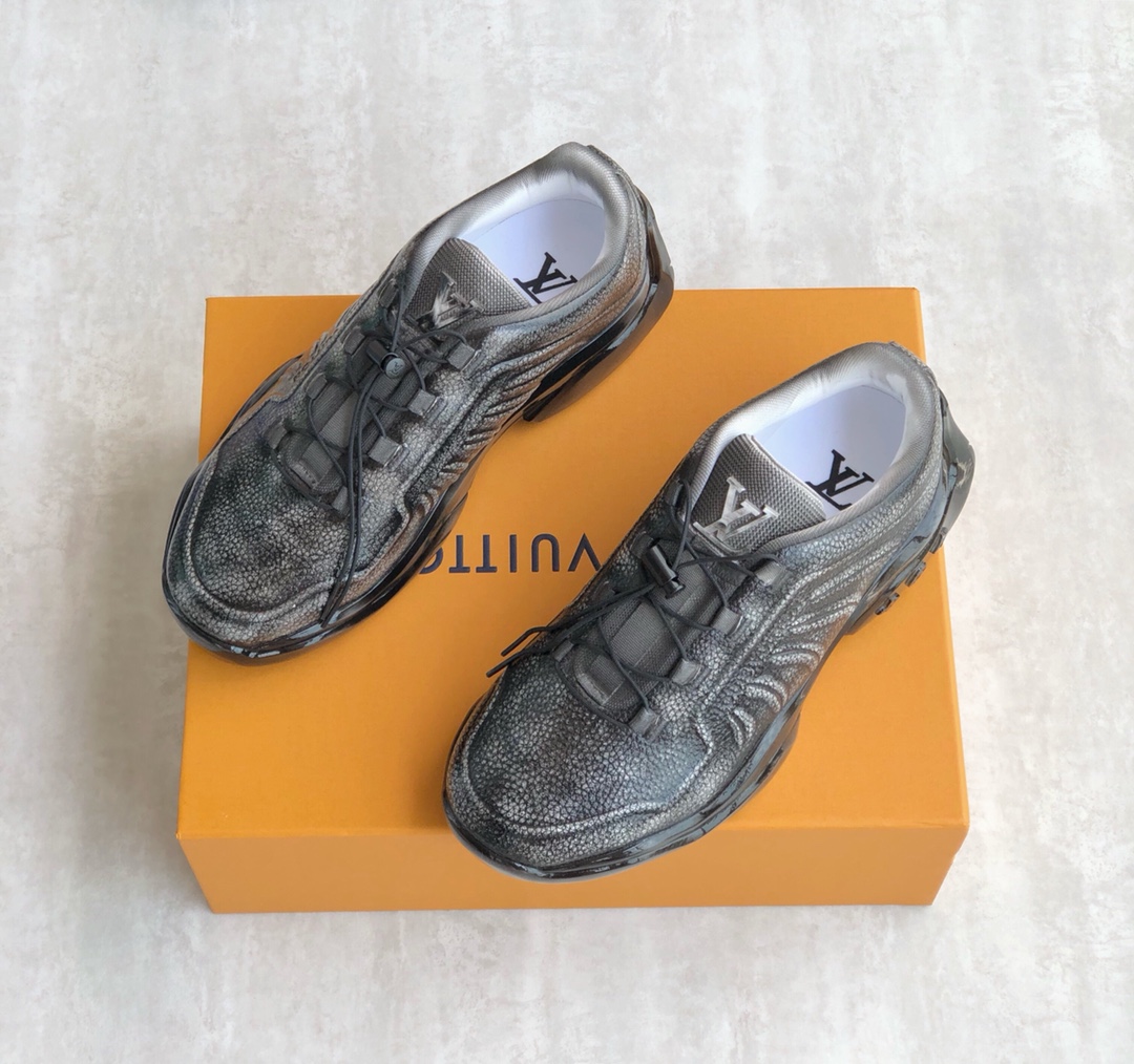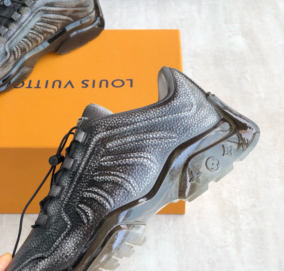 This LV Trainer sneaker combines glossy metallic canvas and rubber outsoles, using adhesive techniques for a worn color effect that showcases retro basketball shoe inspiration. The LV letters on the tongue and the Vuitton logo on the side continue the iconic elements, with Monogram flowers blooming on the injected transparent crystal outsole. The tongue is decorated with LV letters, the side with the Vuitton logo, and the back with the brand logo. Cotton insole lining, very comfortable to wear, comes with original box and full packaging!