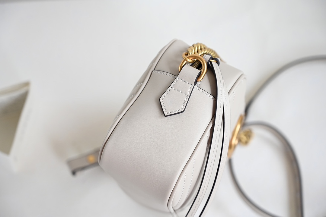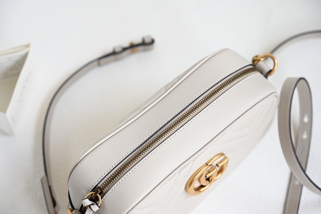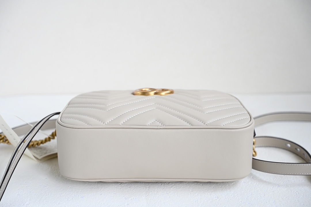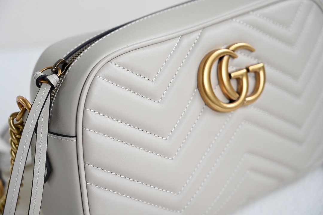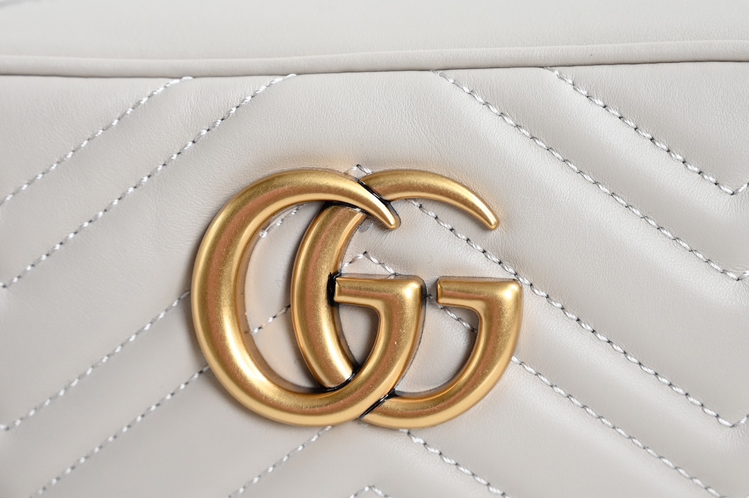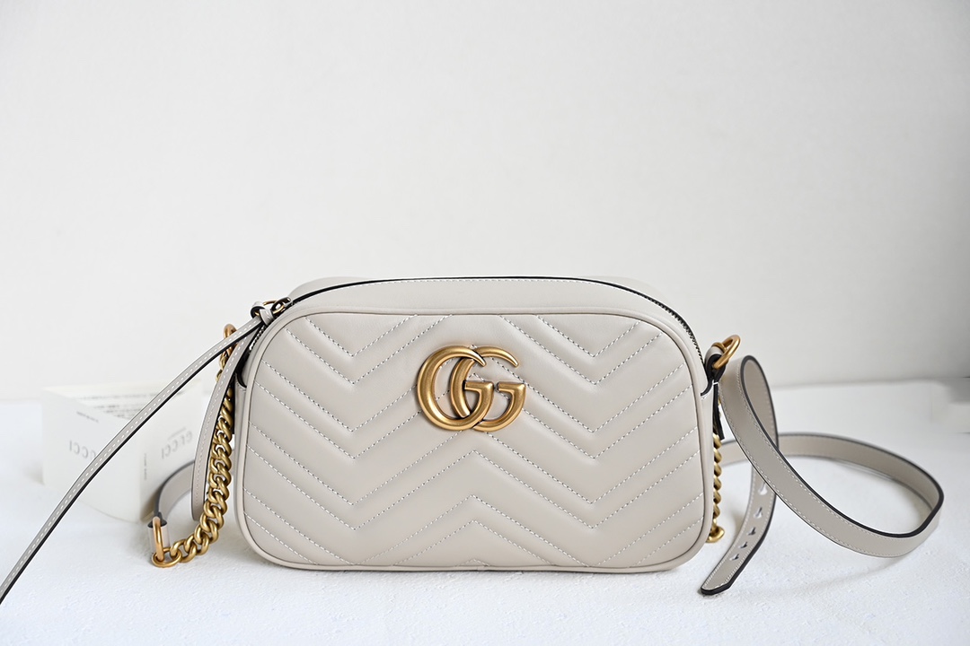 Original Leather [New Arrival] GG Marmont Small Quilted Shoulder Bag. The GG Marmont chain mini shoulder bag features a structured yet soft silhouette with an oversized flap closure and double G metal hardware. The sliding chain strap offers multiple carrying options, easily switching between shoulder and handheld styles. Crafted from wave-stitched quilted leather with a GG logo on the back. Light gray quilted V-shaped leather, vintage gold-tone metal double G, open interior pocket, adjustable chain shoulder strap (60 cm drop). Can also be worn as a crossbody. Zipper closure with extended zipper pull. Weight: approx. 0.394 kg.