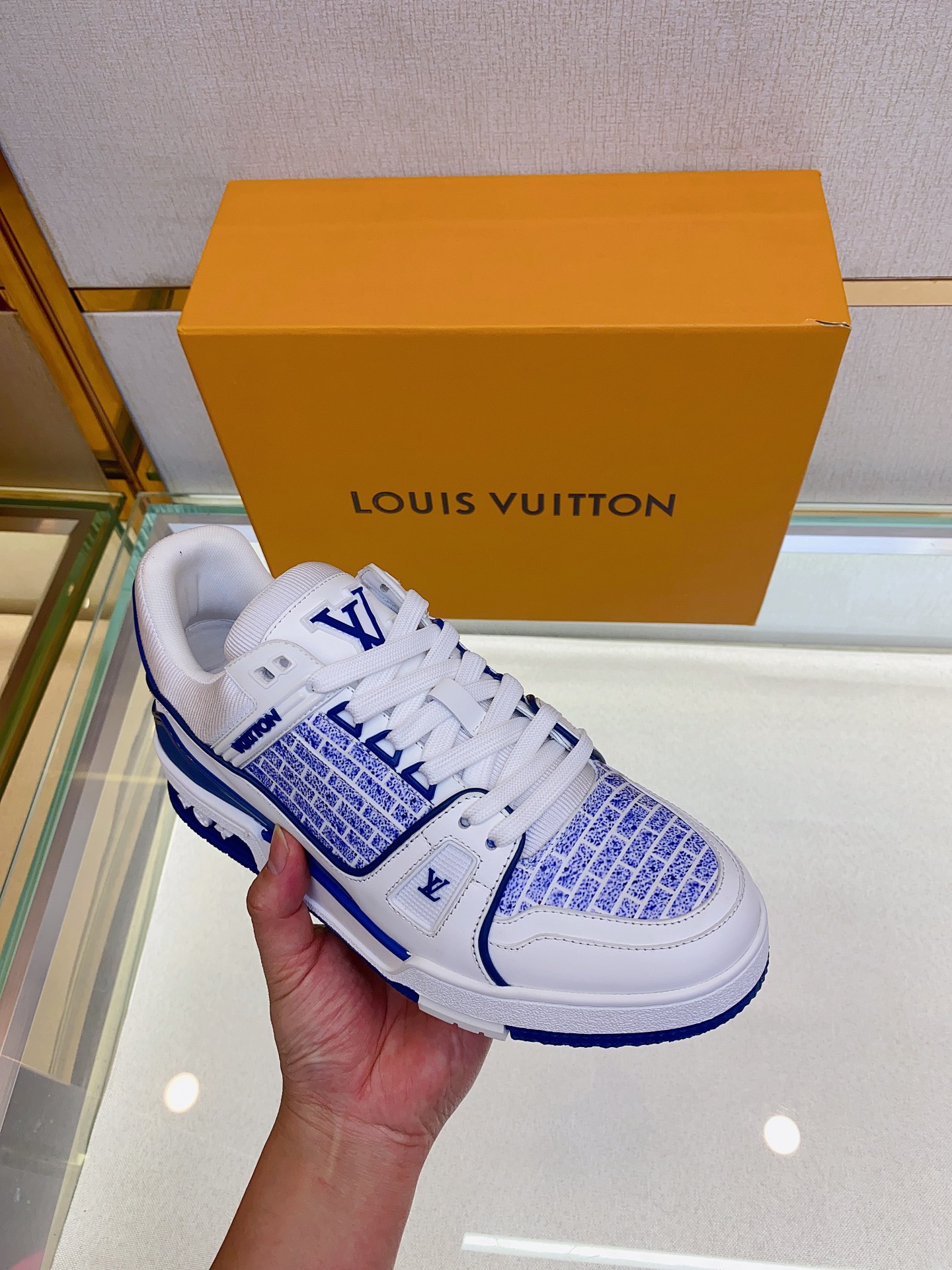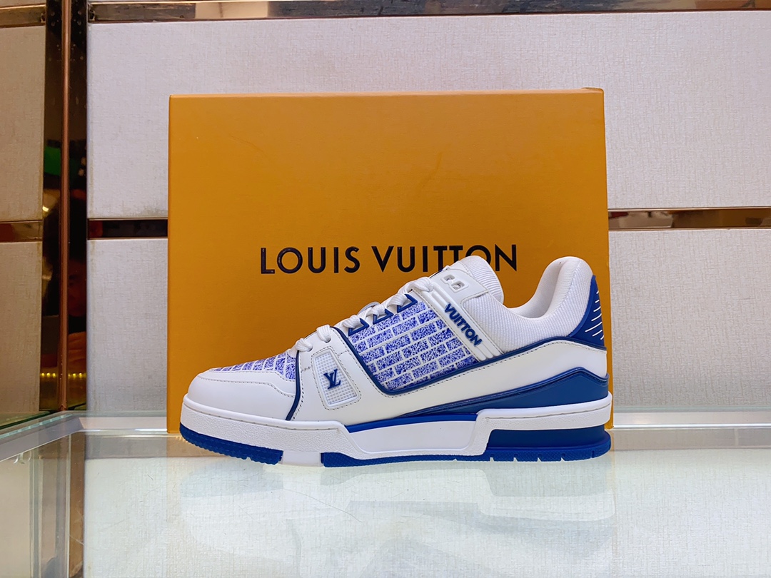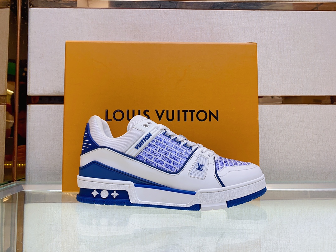 Louis V* Luxury Trainer Sneakers. These Trainer sneakers are made from imported calf leather. The design is simple, inspired by the retro basketball sneakers admired by Men's Artistic Director Virgil Abloh, with his handwritten Louis Vuitton English inscription on the side. The technical rubber outsole is equipped with an innovative gel insole, providing exceptional comfort. The outsole features Monogram Flowers pattern. A classic basketball sneaker style with high attention-grabbing appeal, easy to pair, and offering breathable comfort when worn! Size: Men's 39-44