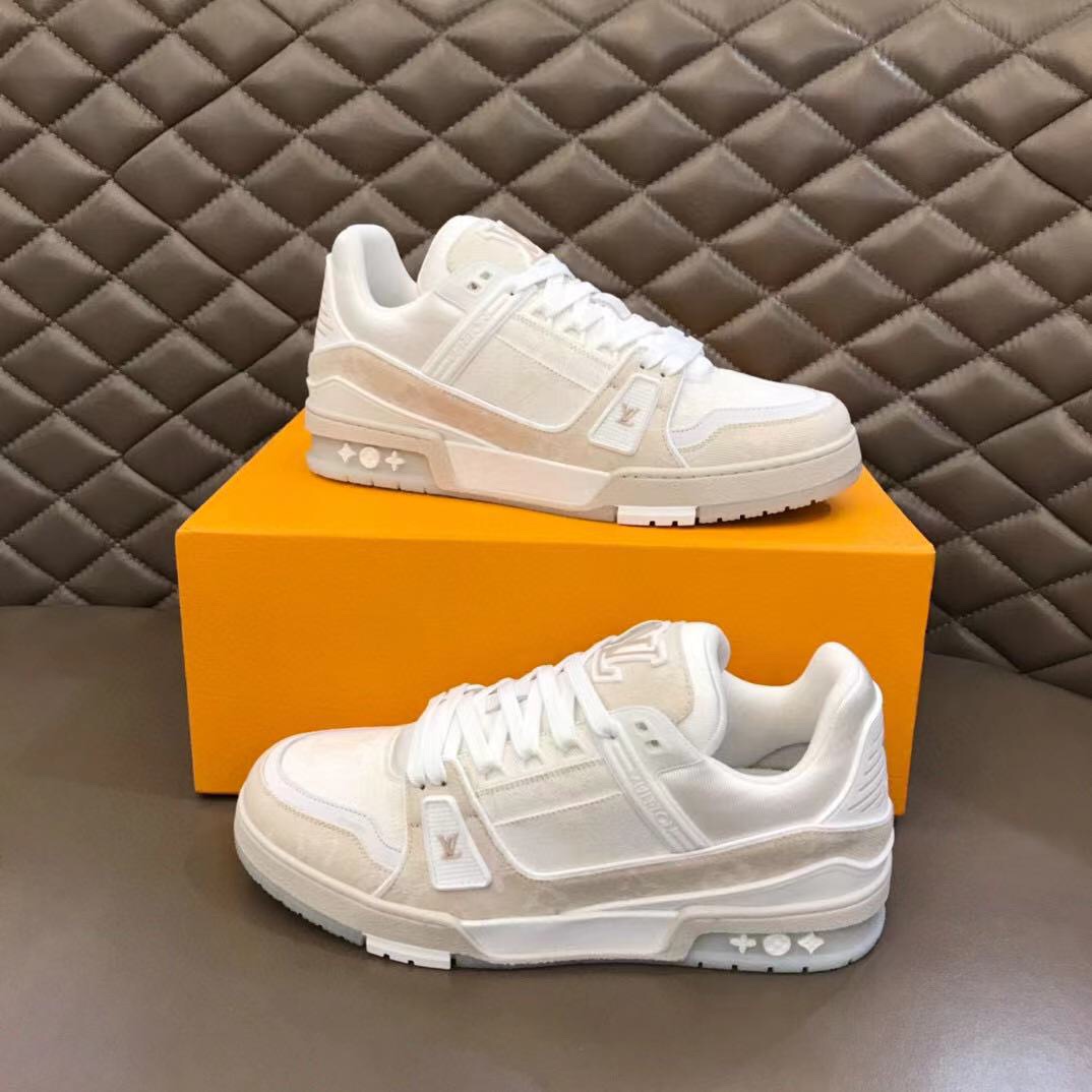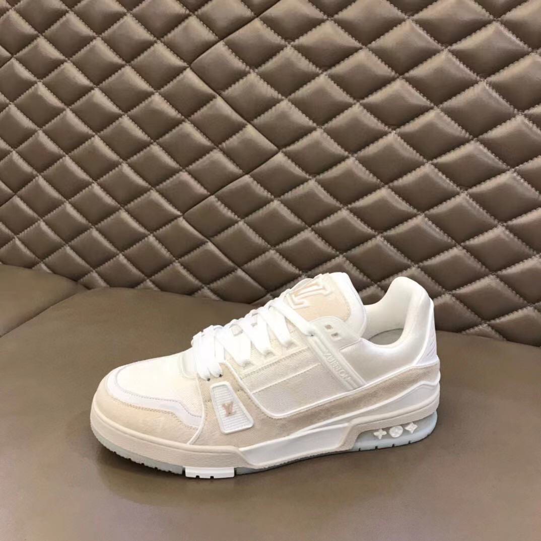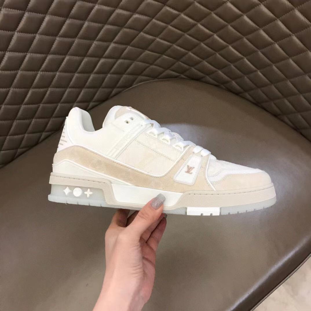 "OUIS UITTO" 2021 new spring/summer color scheme, high-quality new men's sneakers, selected white Monogram denim fabric, reproducing men's wear artistic director Virgil Abloh's inspirational interpretation of classic basketball shoes. This L• Trainer sneaker appeared in the 2021 spring/summer men's fashion show, featuring a striking contrast between plain leather and suede made from calfskin, showcasing exquisite craftsmanship everywhere. The technological rubber outsole is equipped with an innovative gel inner pad, making the comfort even more outstanding. The outsole is decorated with Monogram Flowers pattern. Classic basketball shoe style, high rate of turning heads, easy to match, breathable and comfortable on foot! High-end packaging required, sizes 38-44.45 custom-made (midsole and insole both have logo).