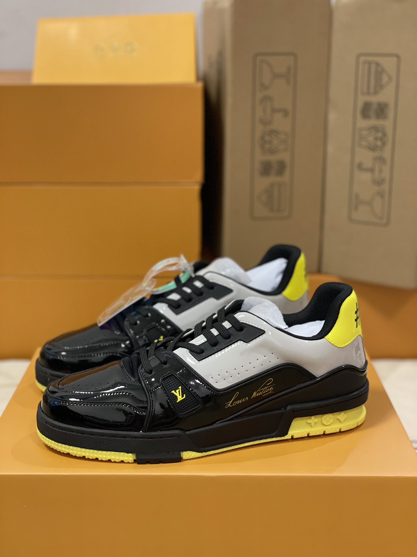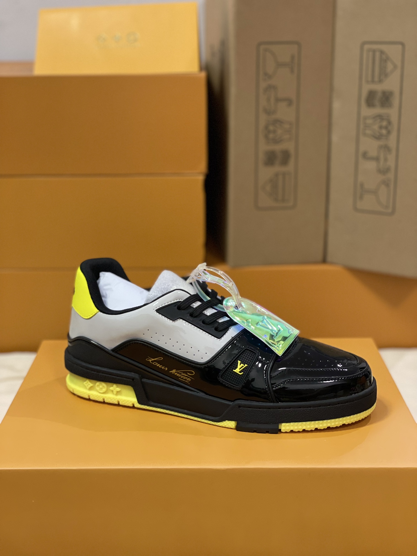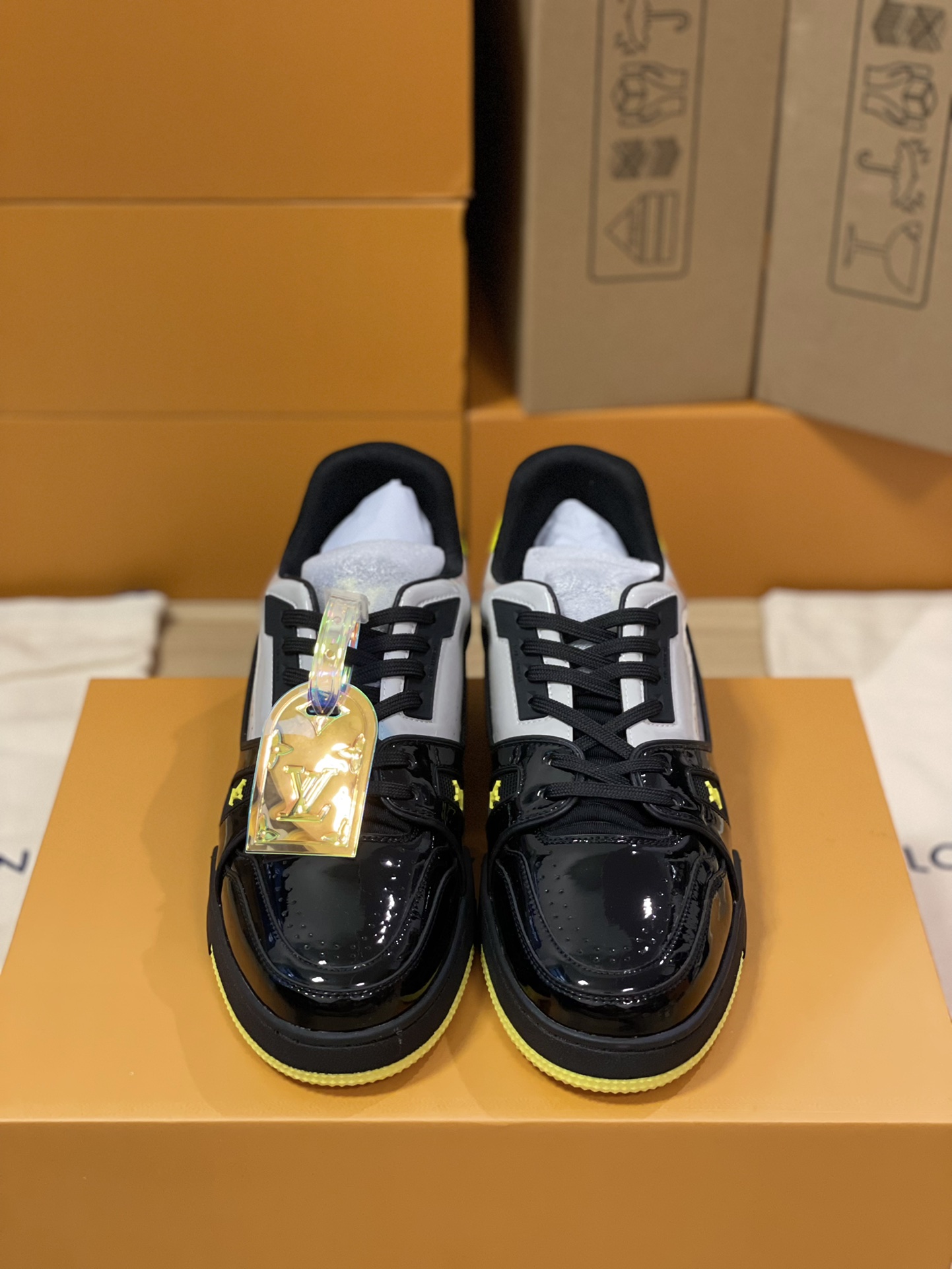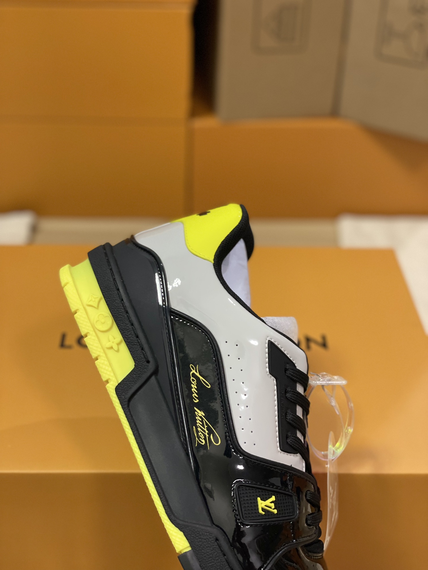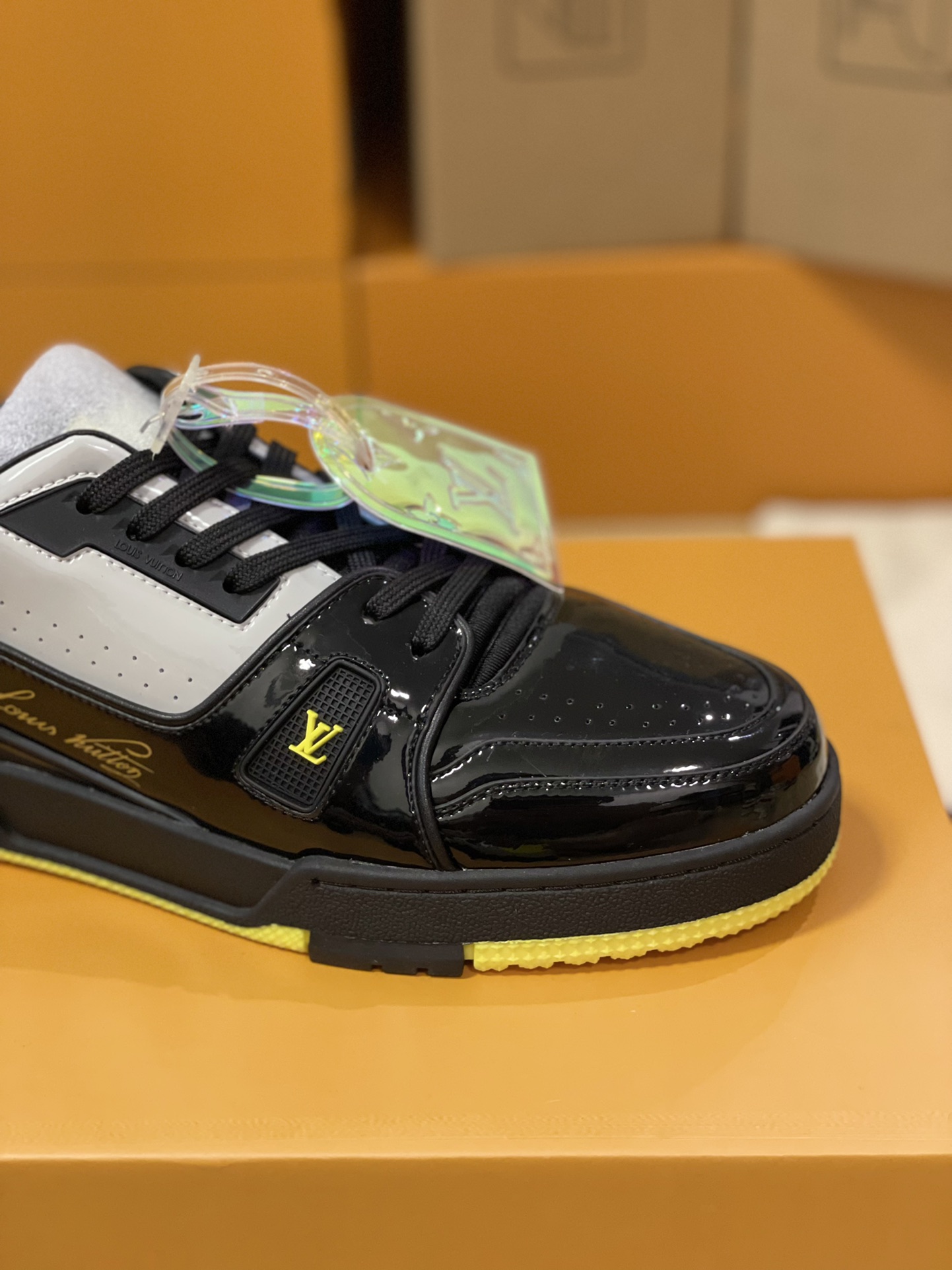 Men's Artistic Director Virgil Abloh style number FD0288, drawing inspiration from basketball shoes, meticulously crafted the LV Trainer sneakers. Patent calfskin paired with a rubber outsole, LV lettering embossing and handwritten Louis Vuitton branding烙印 exquisite details.