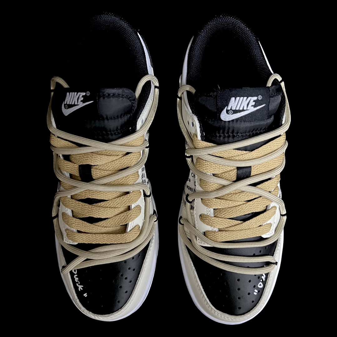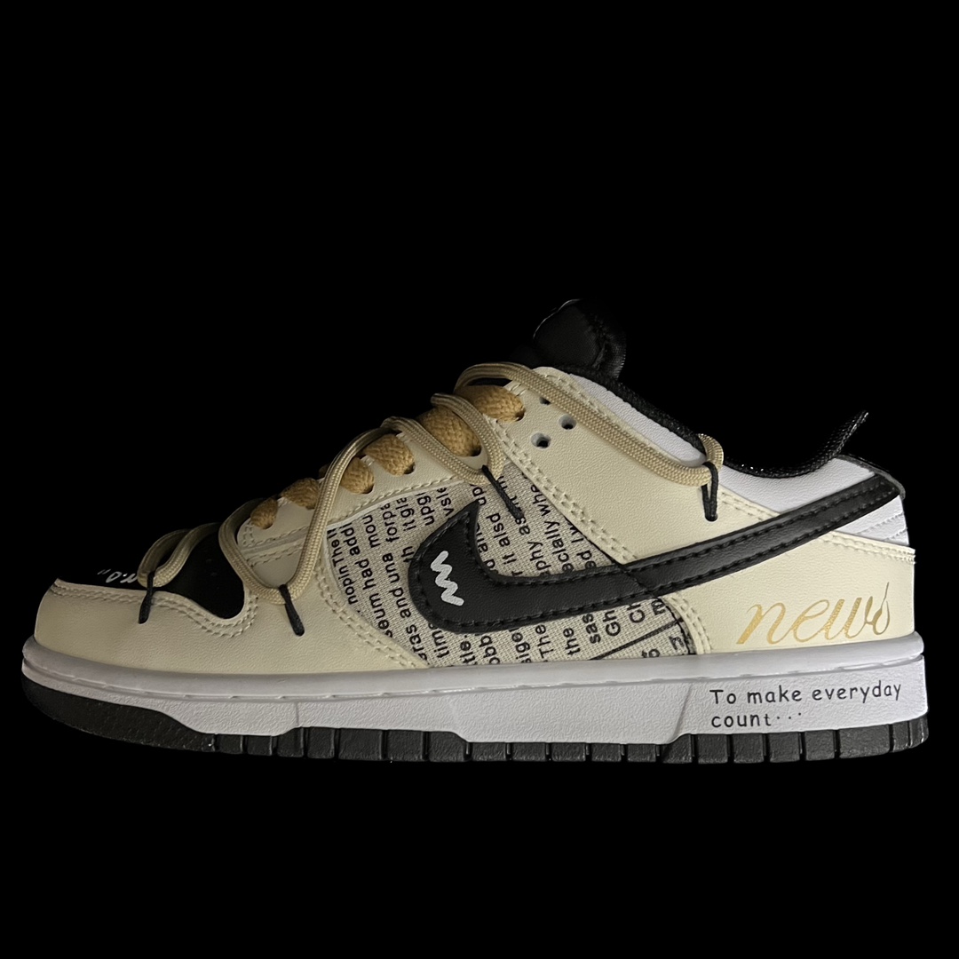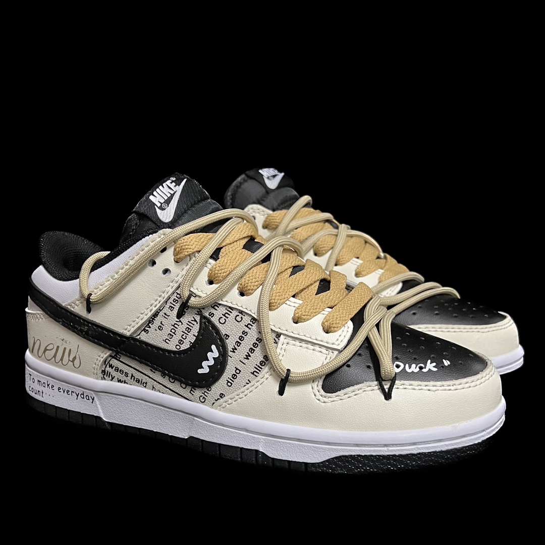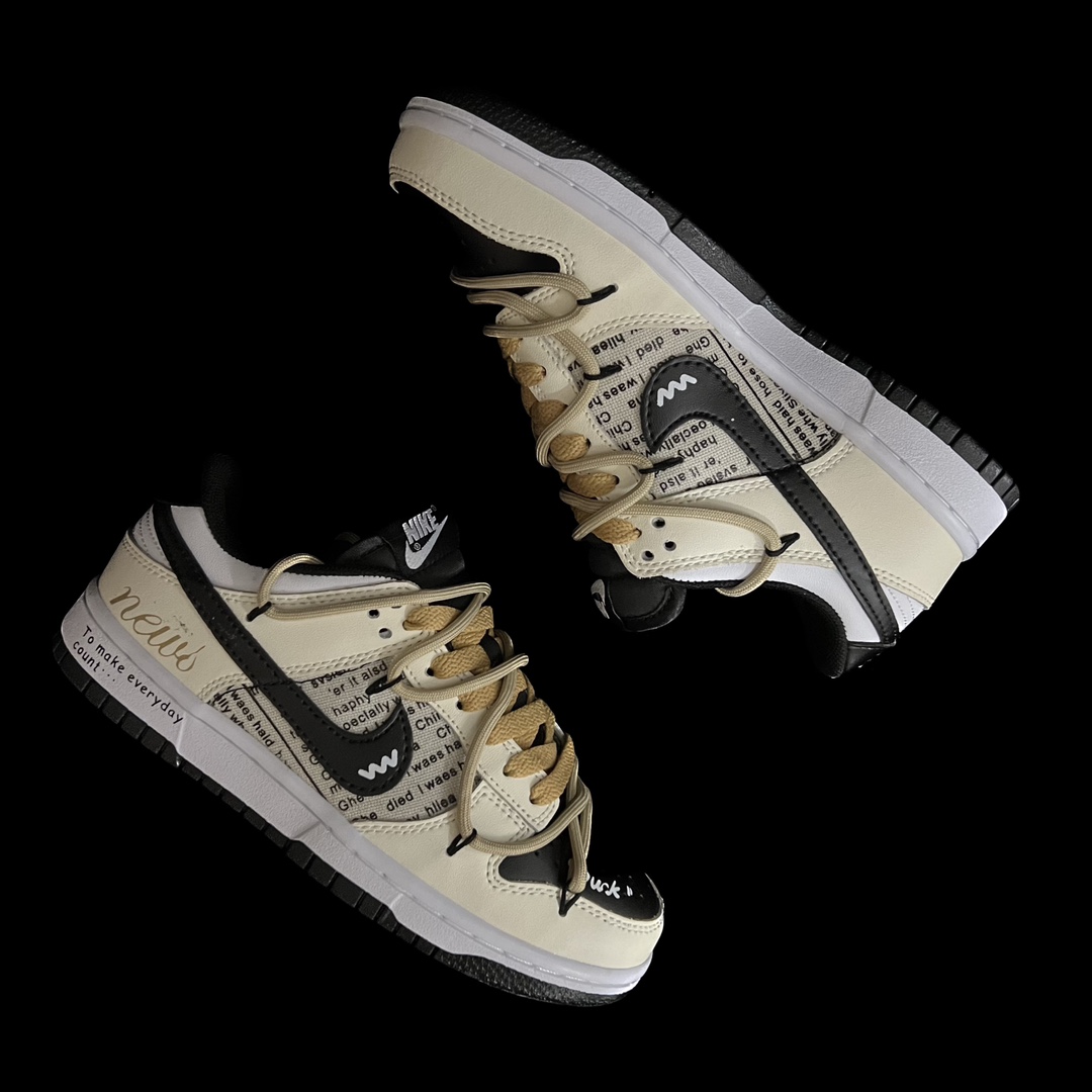 This design is inspired by American daily newspapers, featuring patchwork on the sides that highlights the English newspaper style. The shoe is in a beige color, paired with a black Swoosh, giving it a natural, elegant, and understated look. The deconstructed double laces add layers to the design.